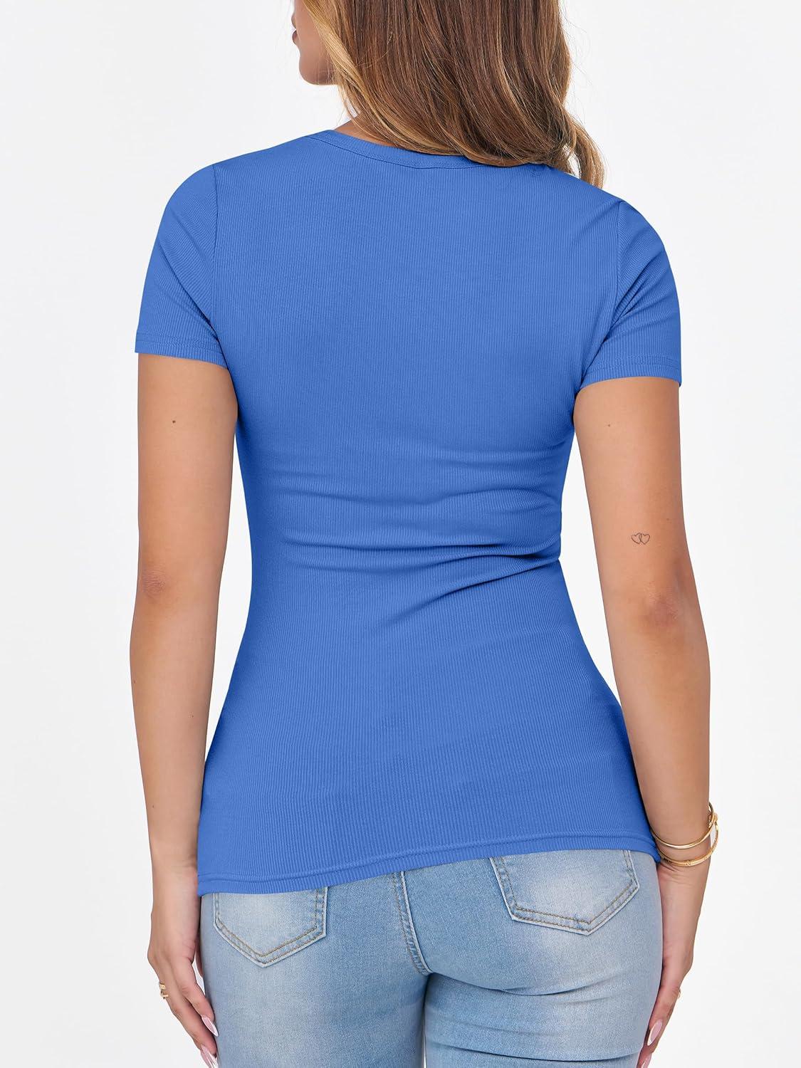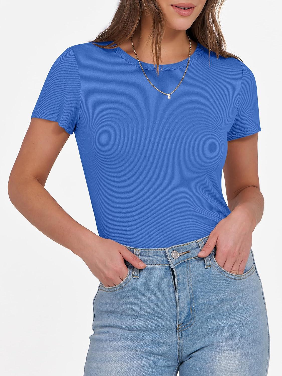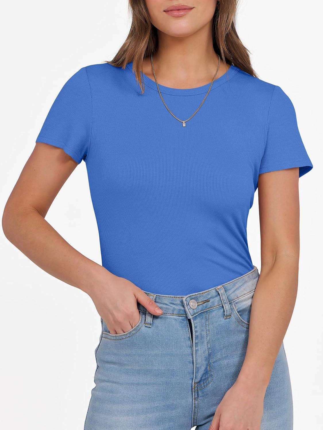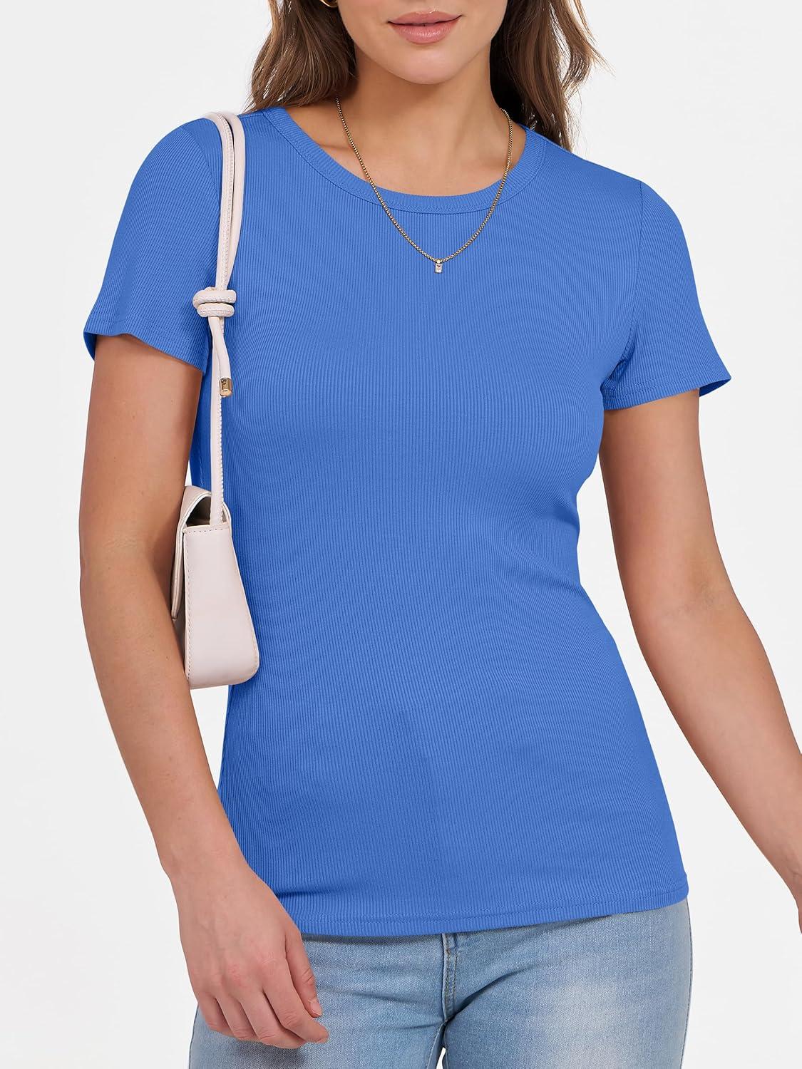 ANRABESS Women Short Sleeve Crewneck Ribbed Knit Slim Fitted Shirts Summer Tops Basic Tee Casual 2025 Fall Outfits Clothes(Blue)