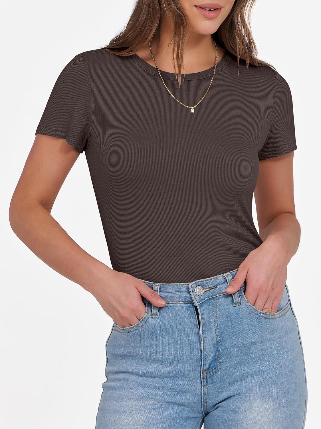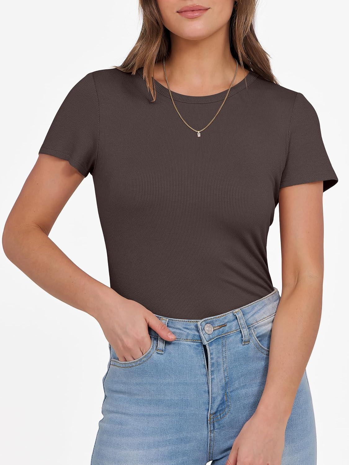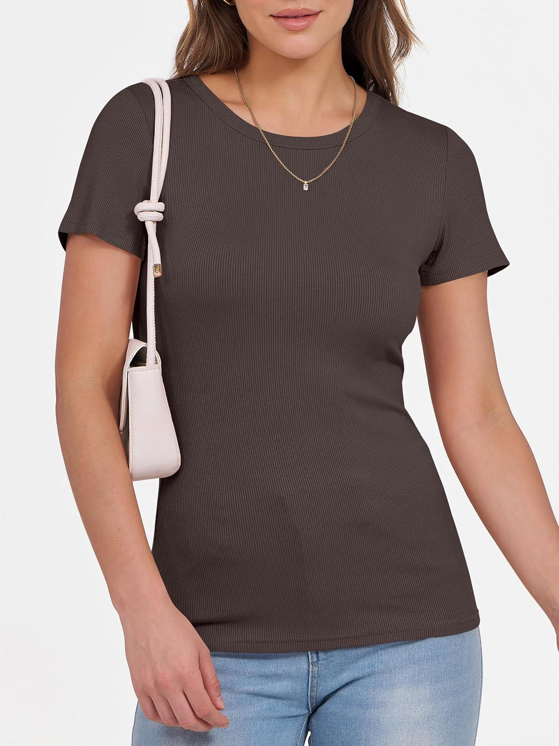 ANRABESS Women Short Sleeve Crewneck Ribbed Knit Slim Fitted Shirts Summer Tops Basic Tee Casual 2025 Fall Outfits Clothes(Brown)