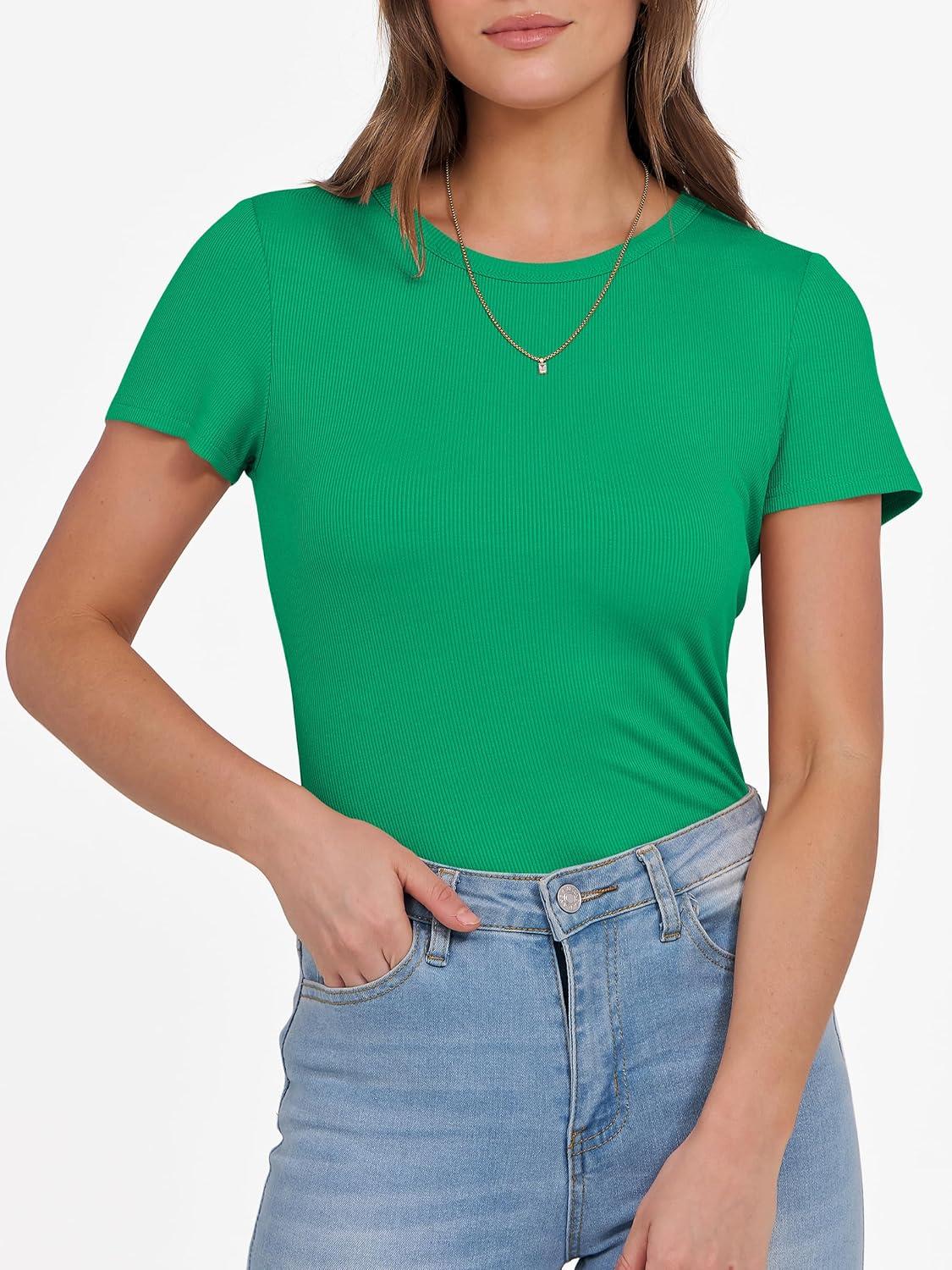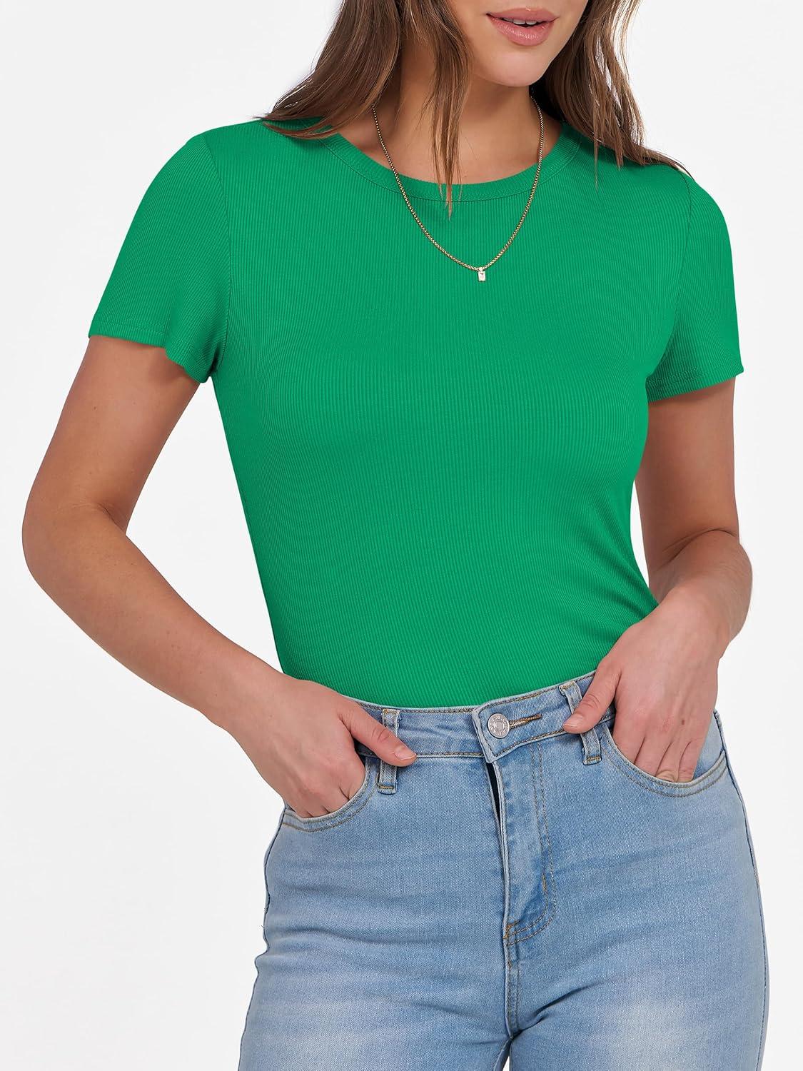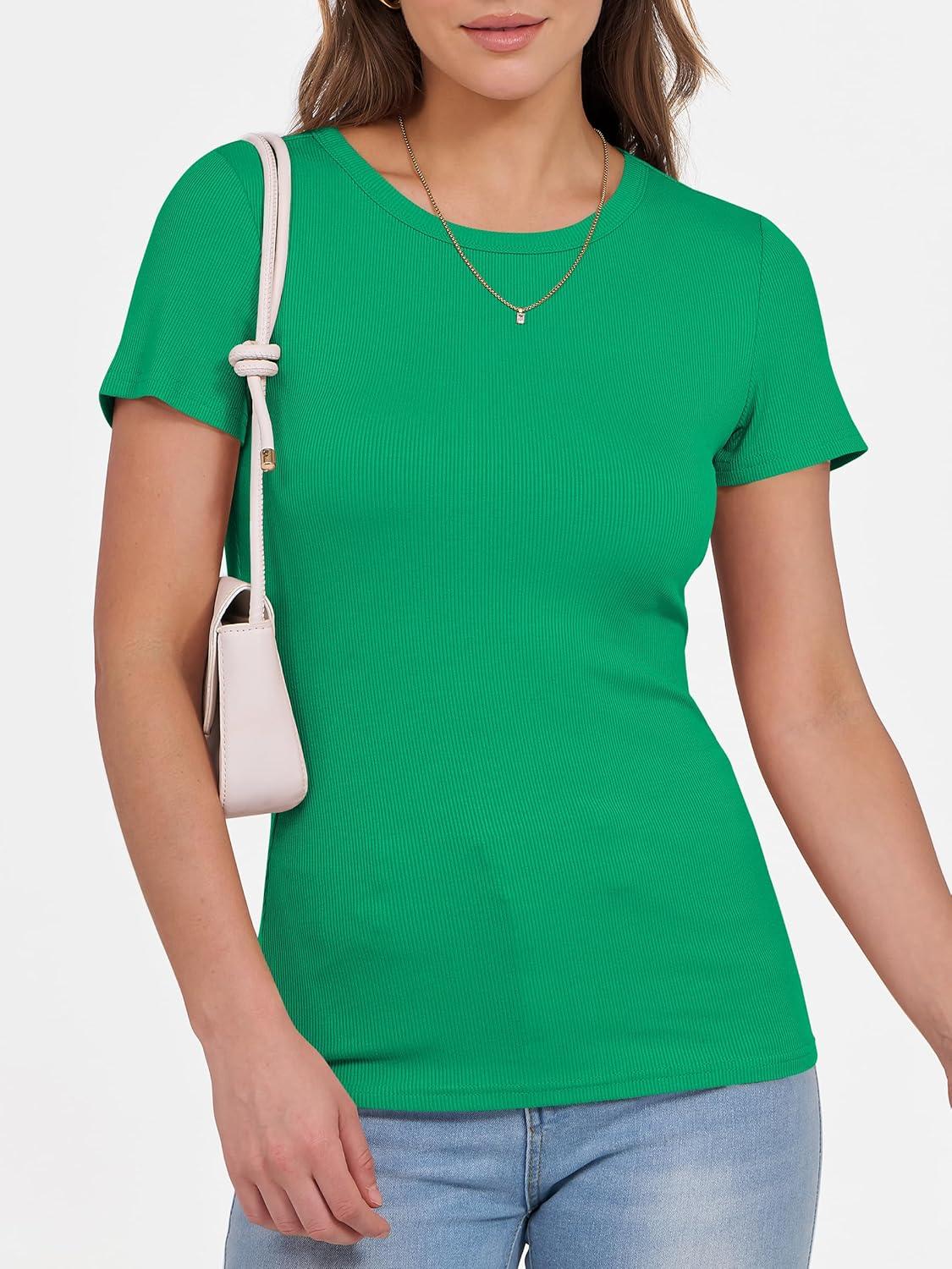 ANRABESS Women Short Sleeve Crewneck Ribbed Knit Slim Fitted Shirts Summer Tops Basic Tee Casual 2025 Fall Outfits Clothes(Green)
