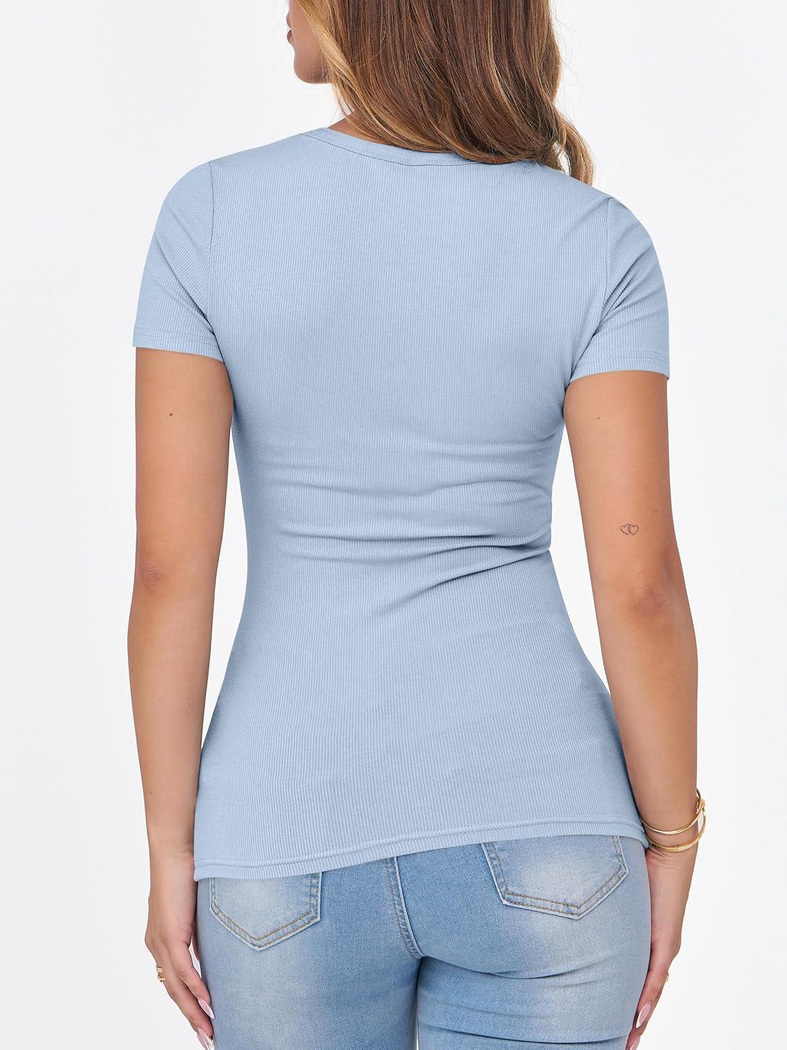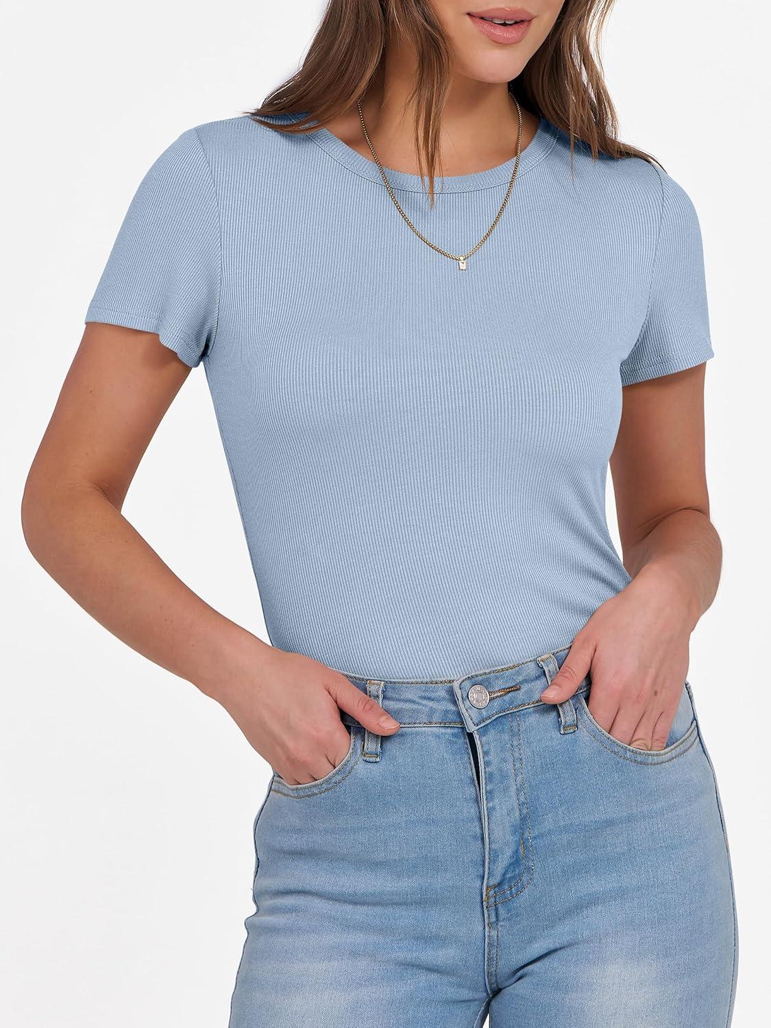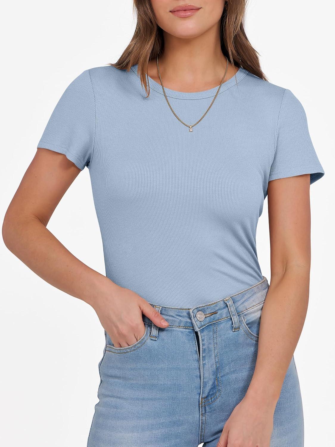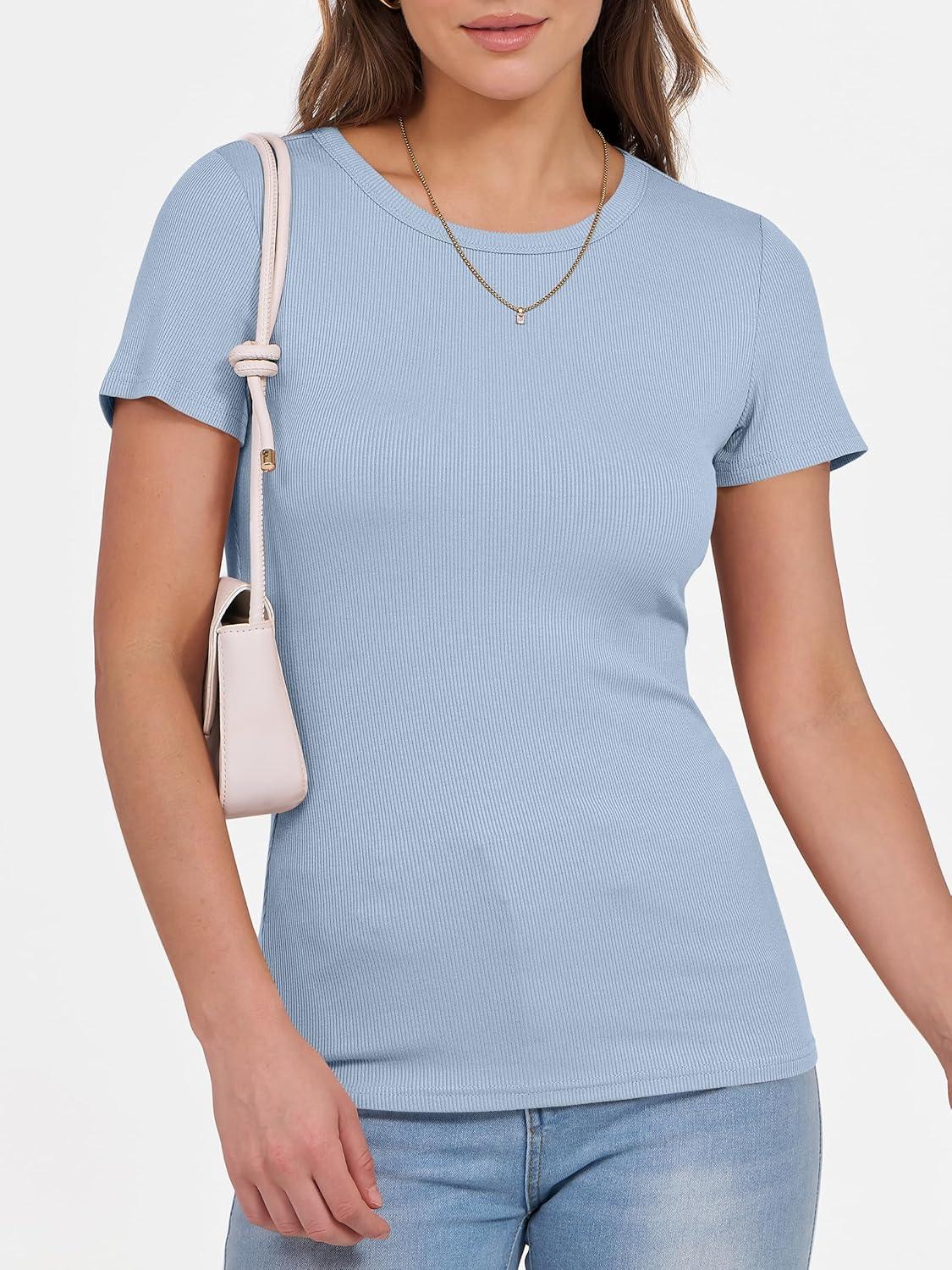 ANRABESS Women Short Sleeve Crewneck Ribbed Knit Slim Fitted Shirts Summer Tops Basic Tee Casual 2025 Fall Outfits Clothes(Light Blue)
