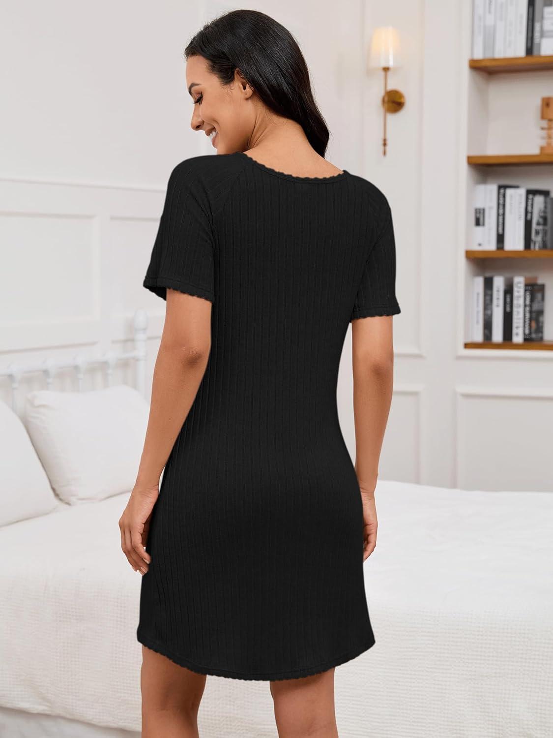 ANRABESS Women Short Sleeve Sleep Night Shirts Comfy Nightgowns Ribbed Pajamas House Sweater Dress 2025 Fall Sleepwear(Black)
