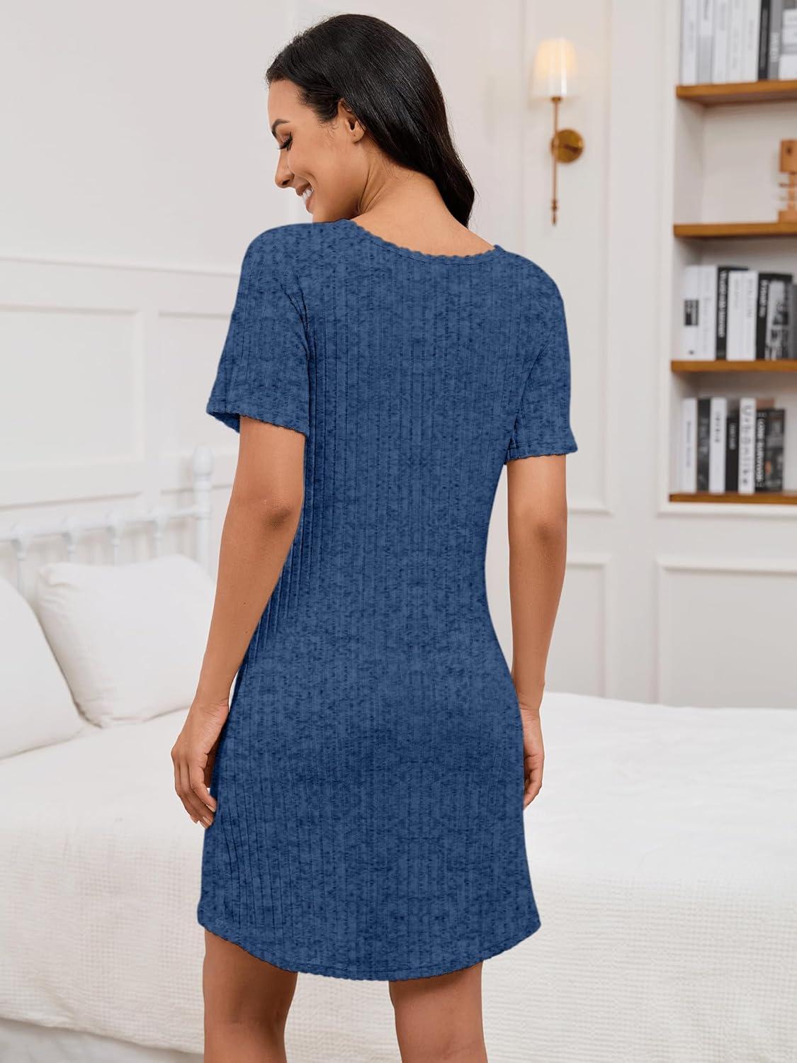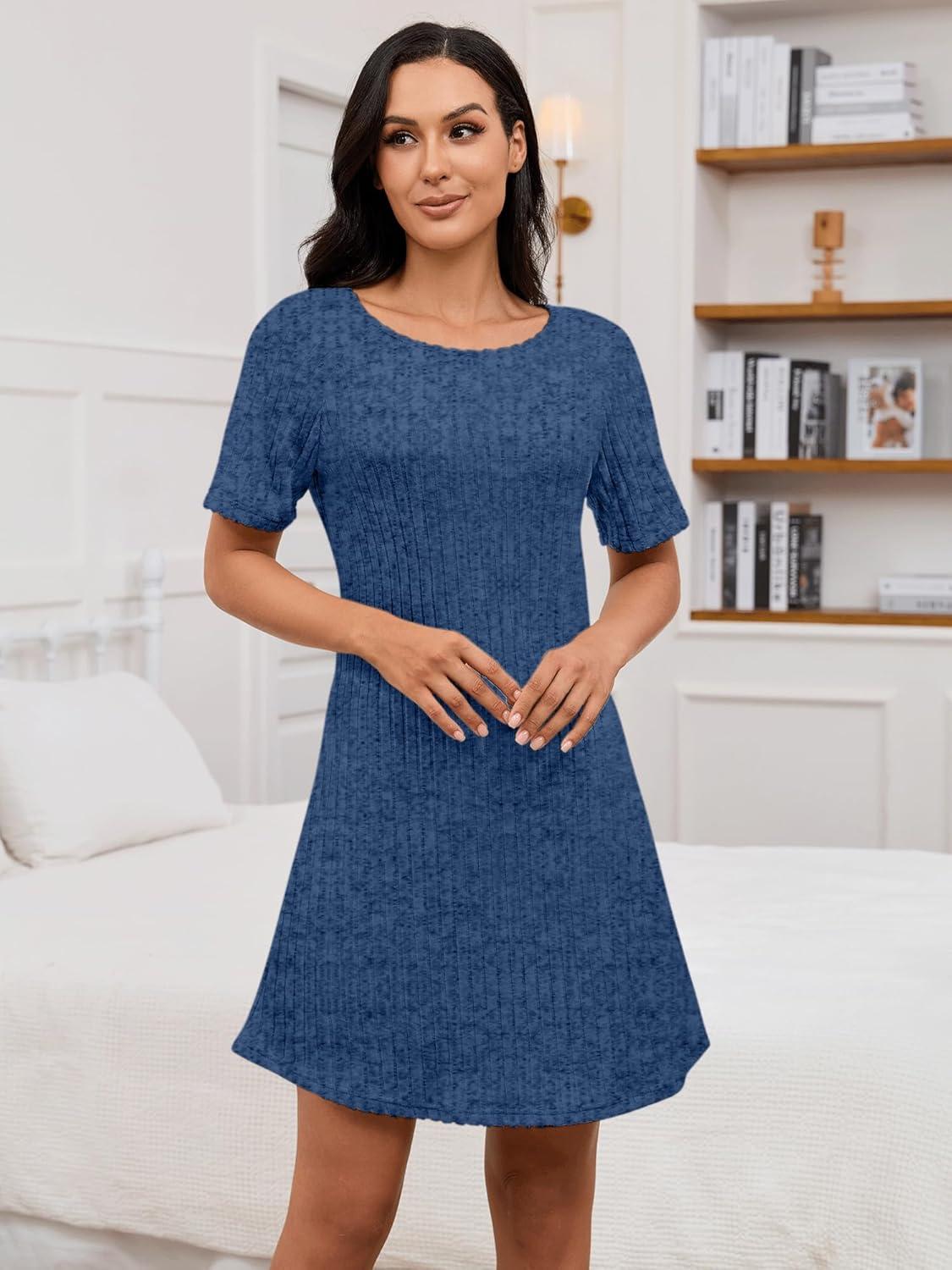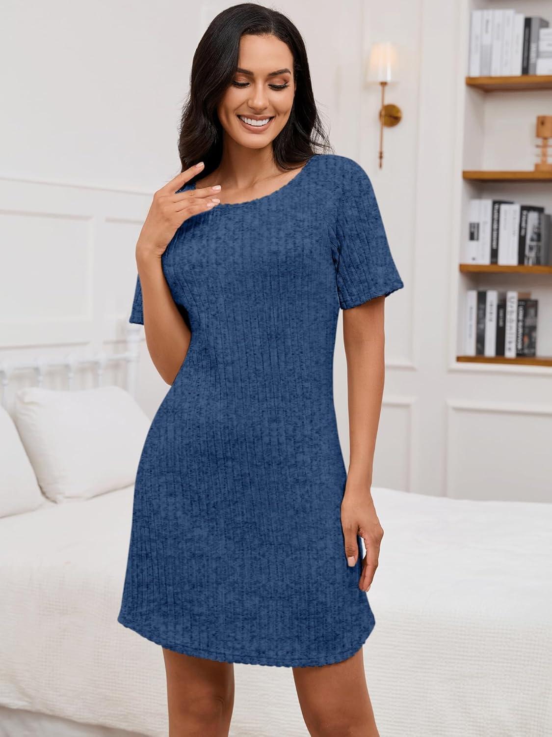 ANRABESS Women Short Sleeve Sleep Night Shirts Comfy Nightgowns Ribbed Pajamas House Sweater Dress 2025 Fall Sleepwear(Dark Blue)