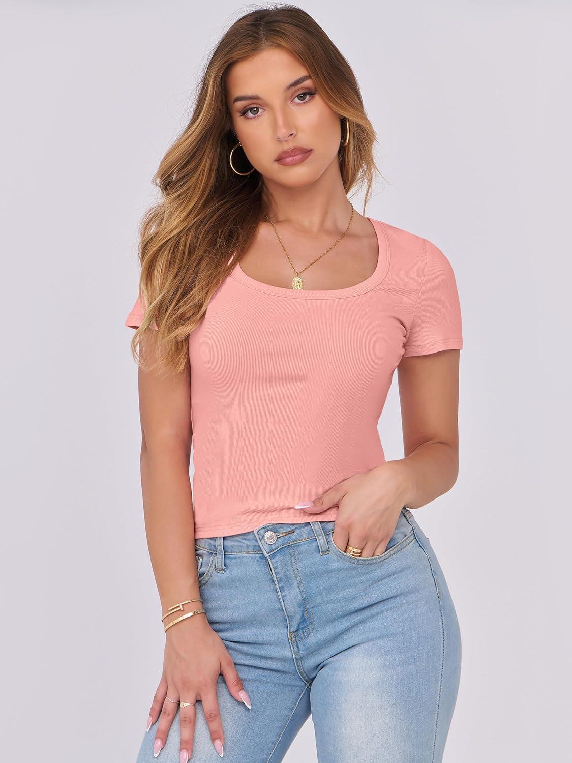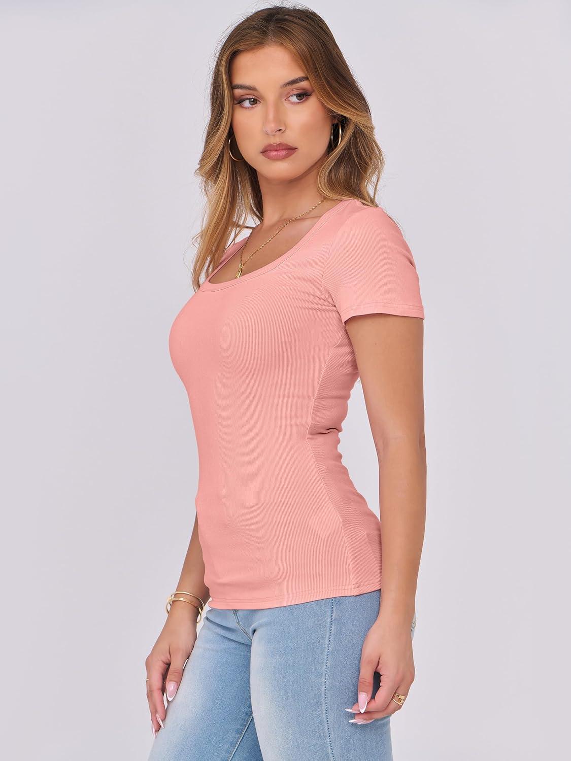 ANRABESS Women Short Sleeve Tops Scoop Neck Ribbed Knit Slim Fitted Basic Tee Shirts Casual Summer Clothes 2025 Fall Outfits(Coral)