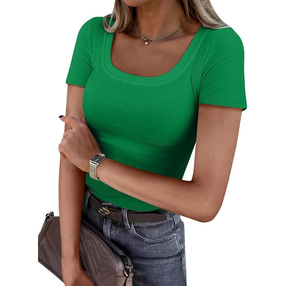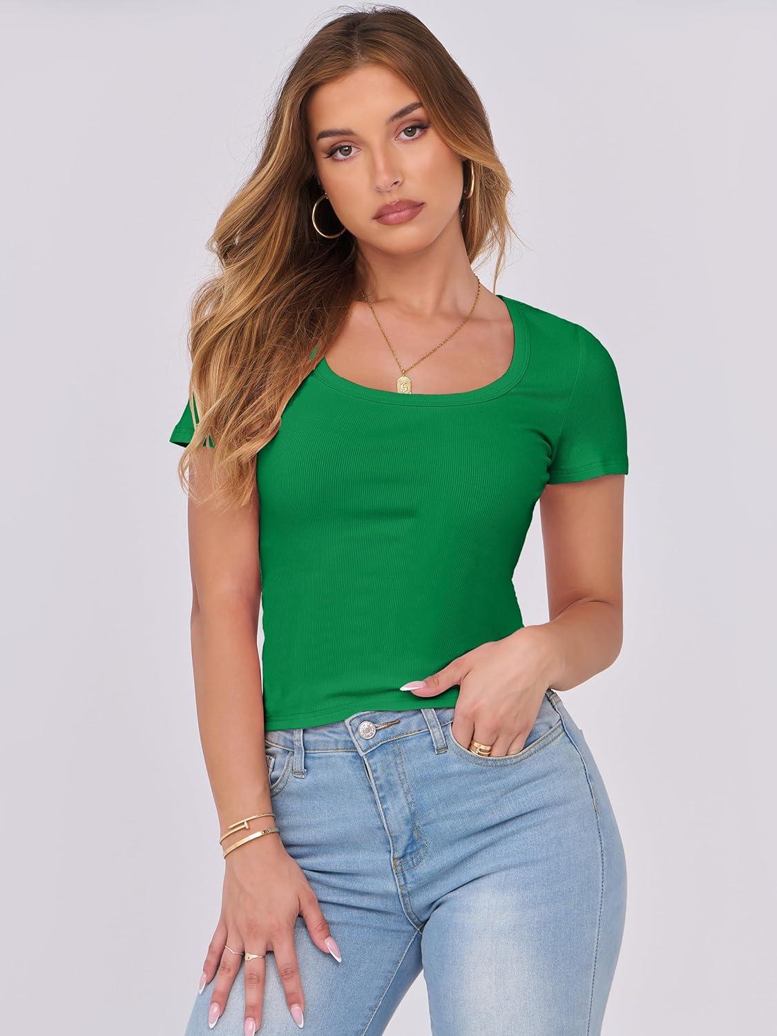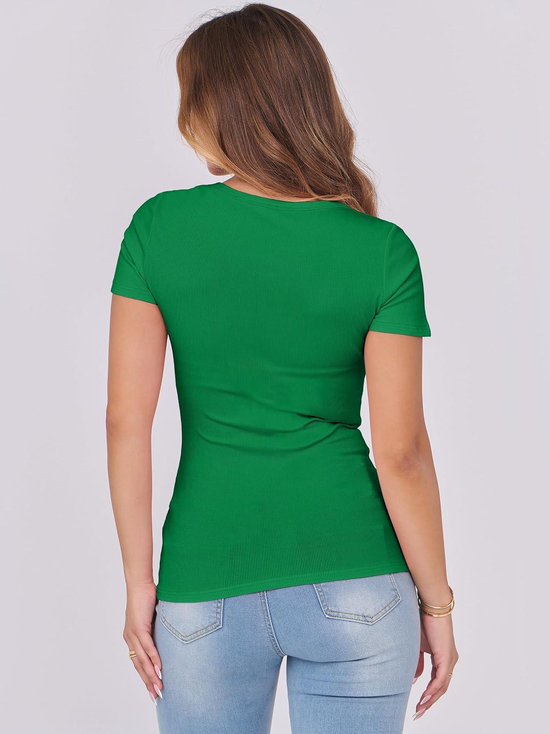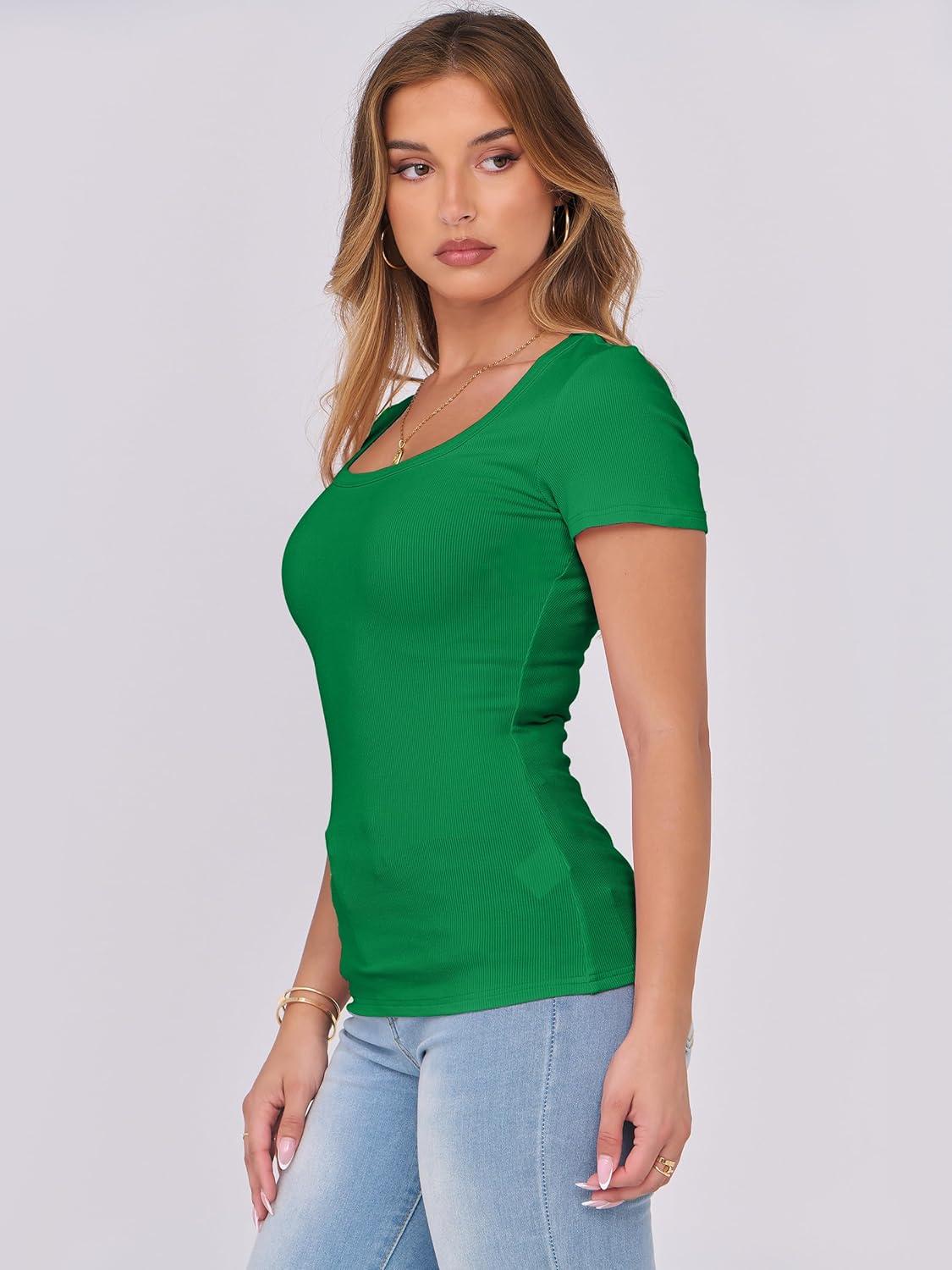 ANRABESS Women Short Sleeve Tops Scoop Neck Ribbed Knit Slim Fitted Basic Tee Shirts Casual Summer Clothes 2025 Fall Outfits(Green)