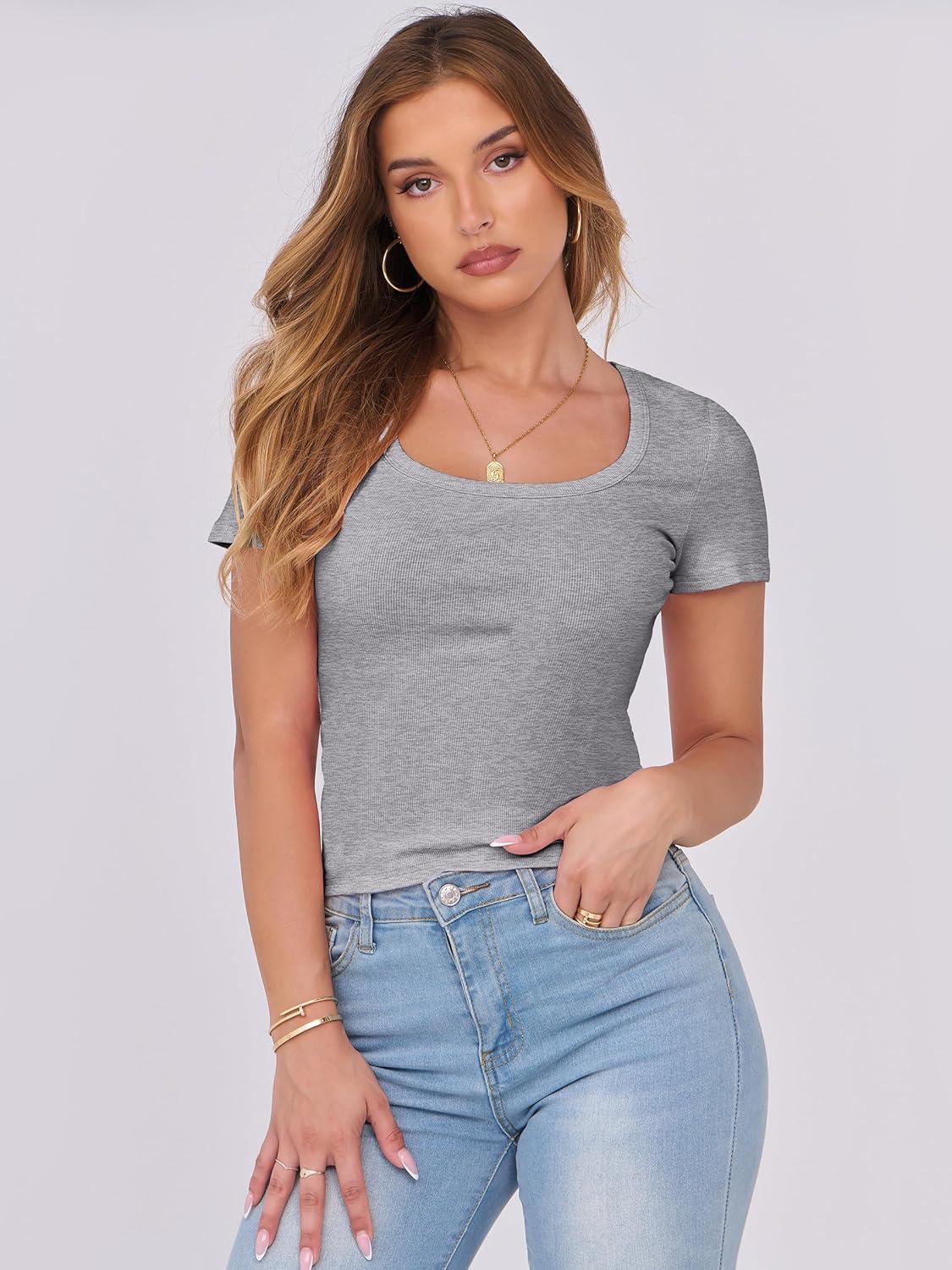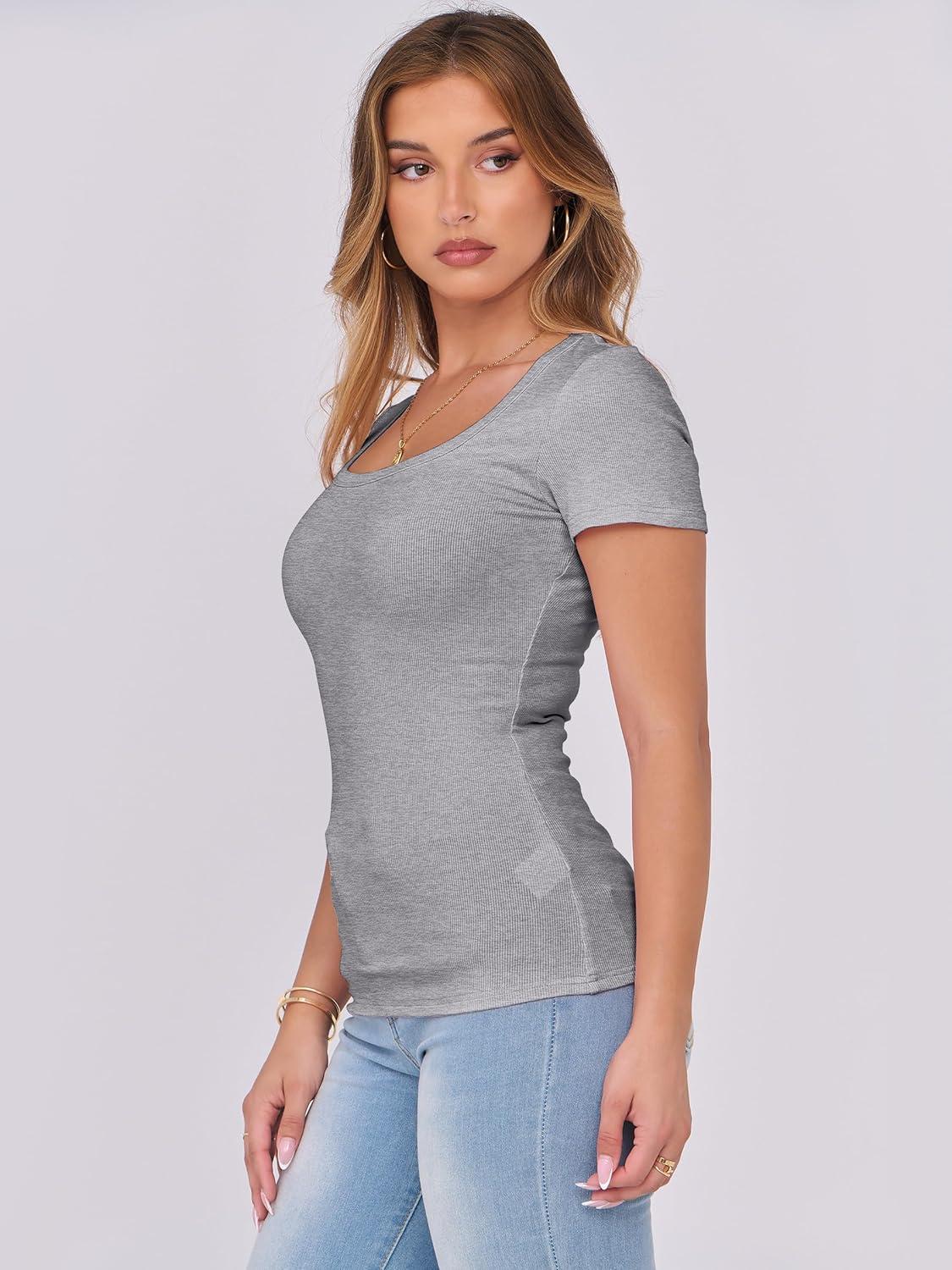ANRABESS Women Short Sleeve Tops Scoop Neck Ribbed Knit Slim Fitted Basic Tee Shirts Casual Summer Clothes 2025 Fall Outfits(Grey)