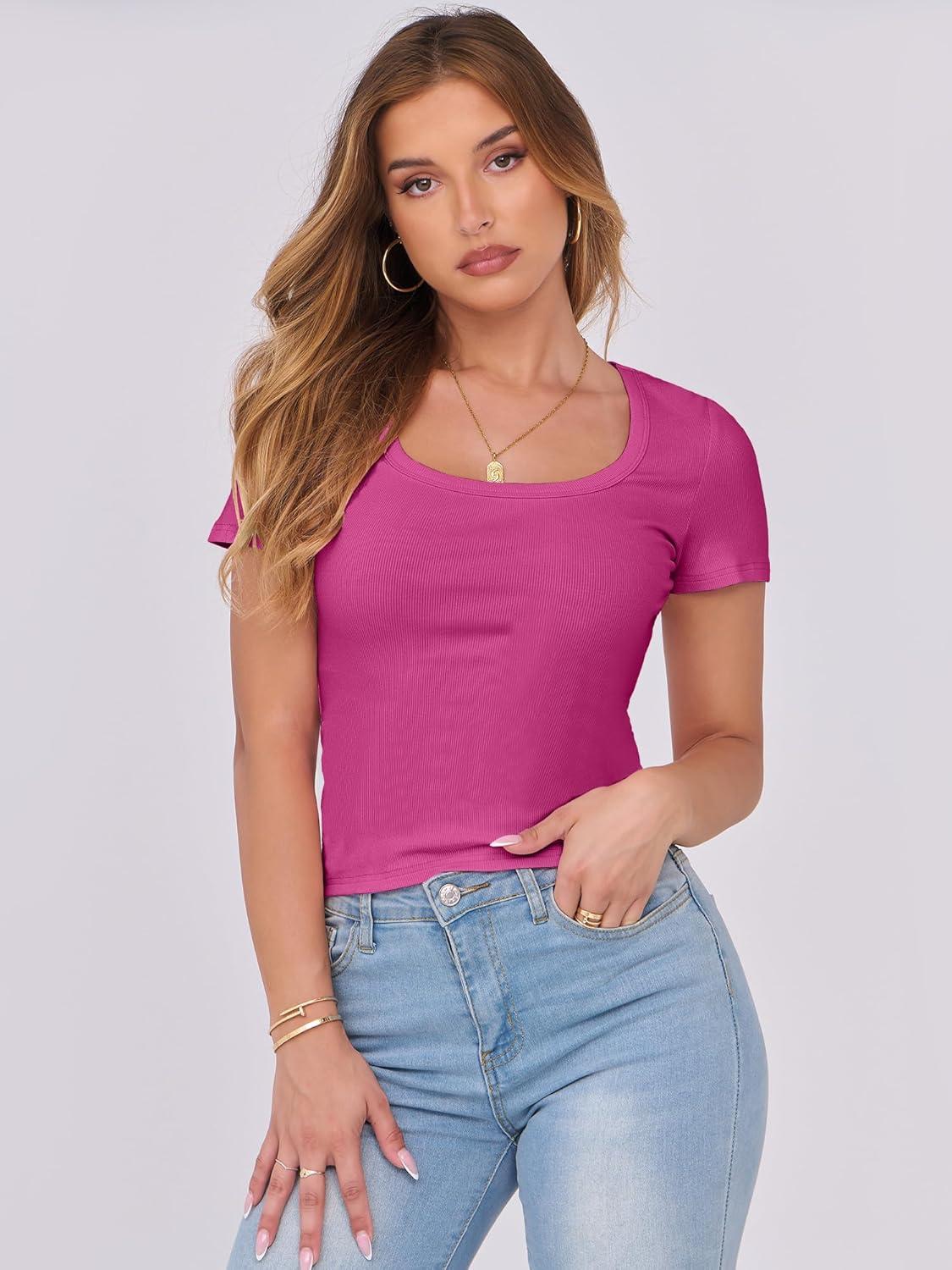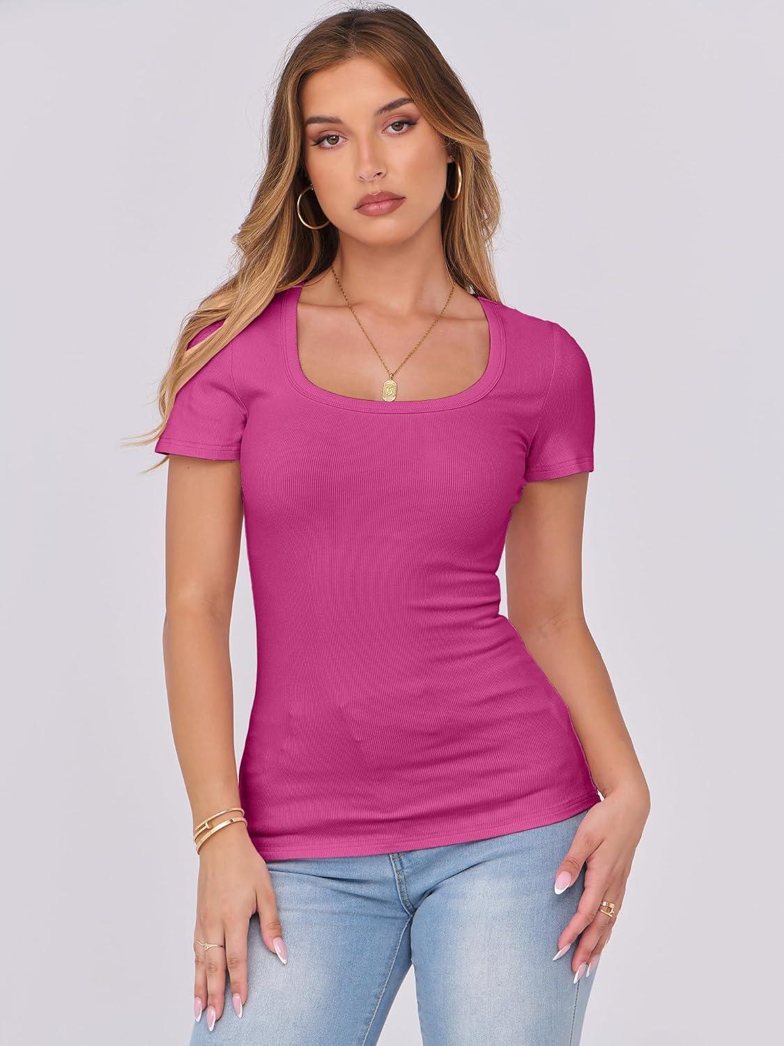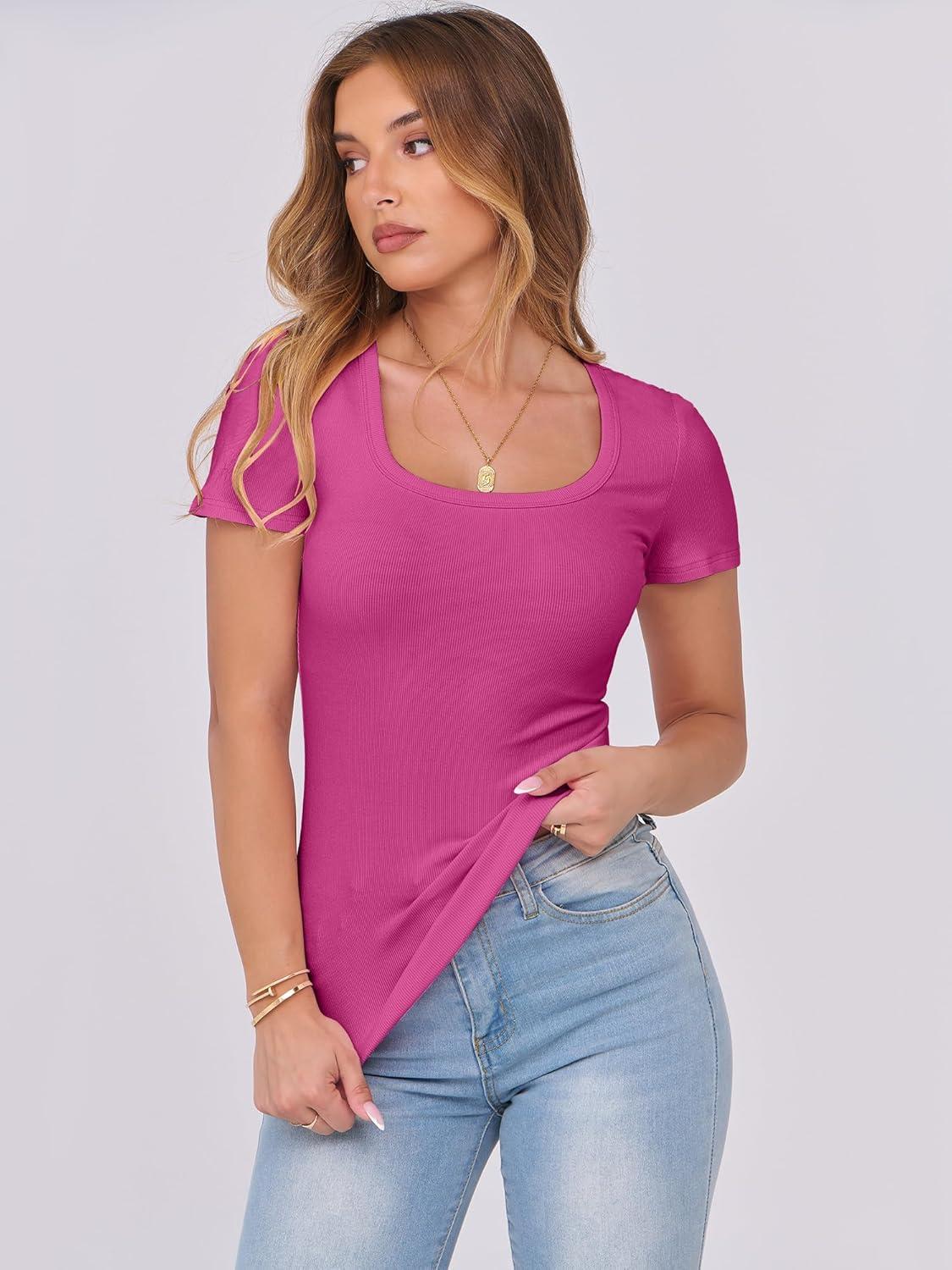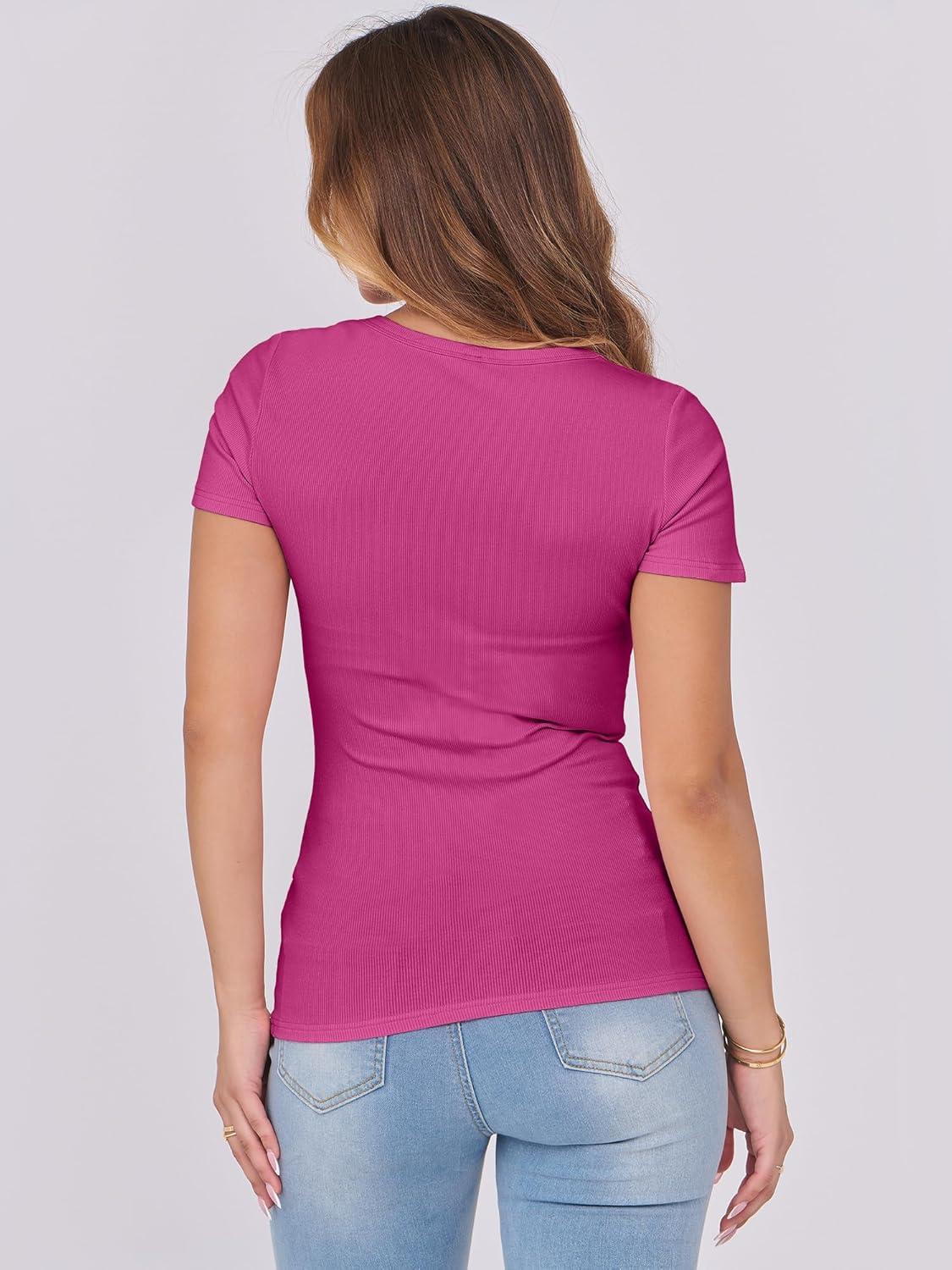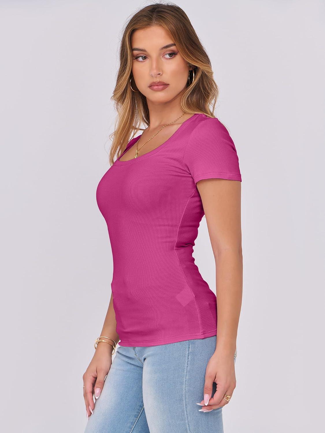 ANRABESS Women Short Sleeve Tops Scoop Neck Ribbed Knit Slim Fitted Basic Tee Shirts Casual Summer Clothes 2025 Fall Outfits(Hot Pink)