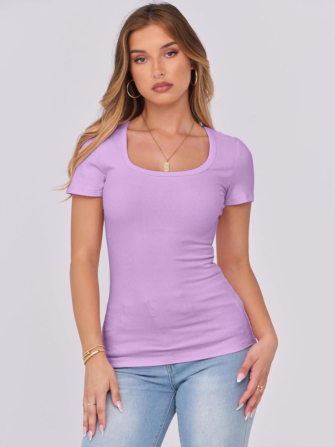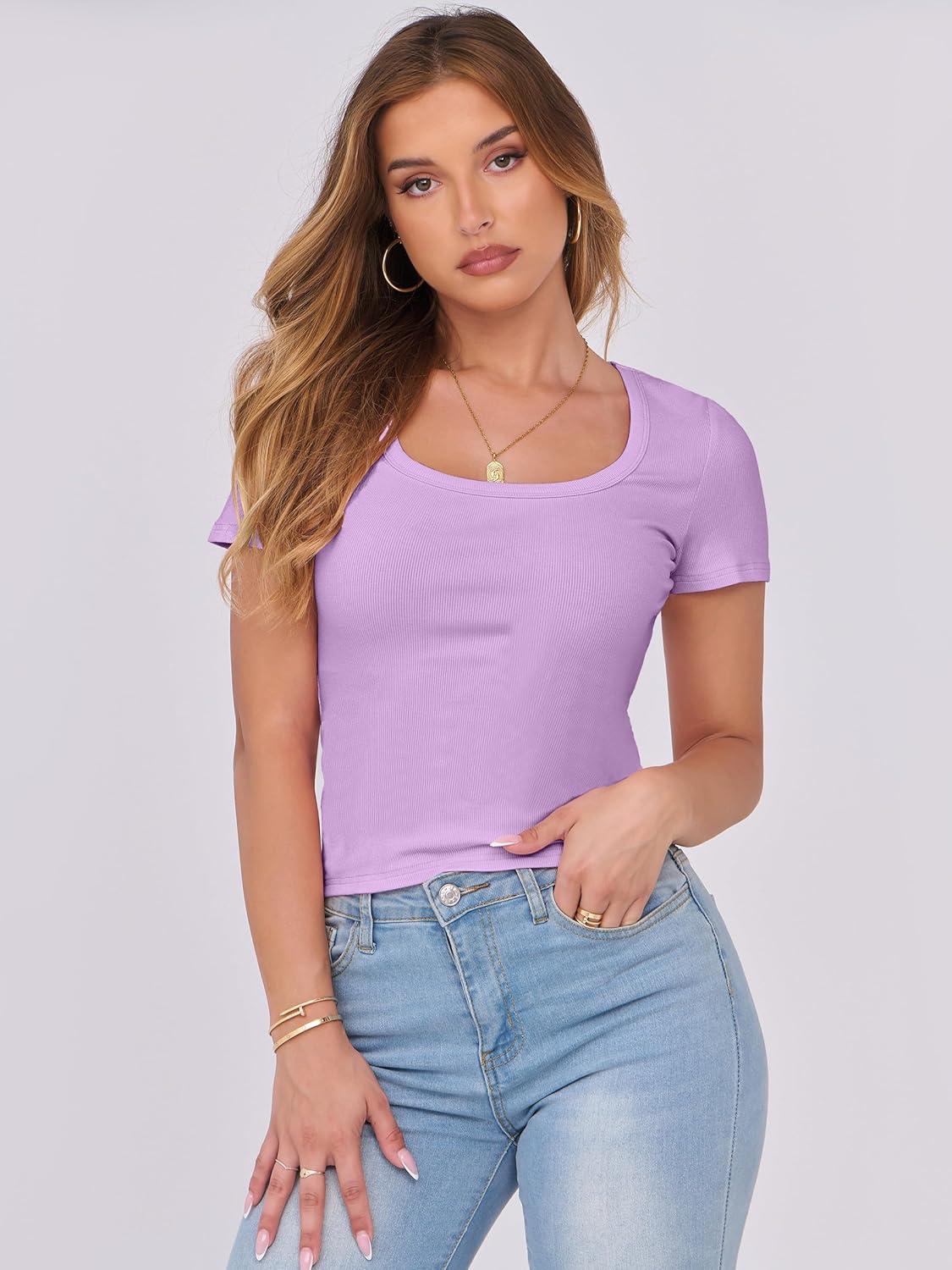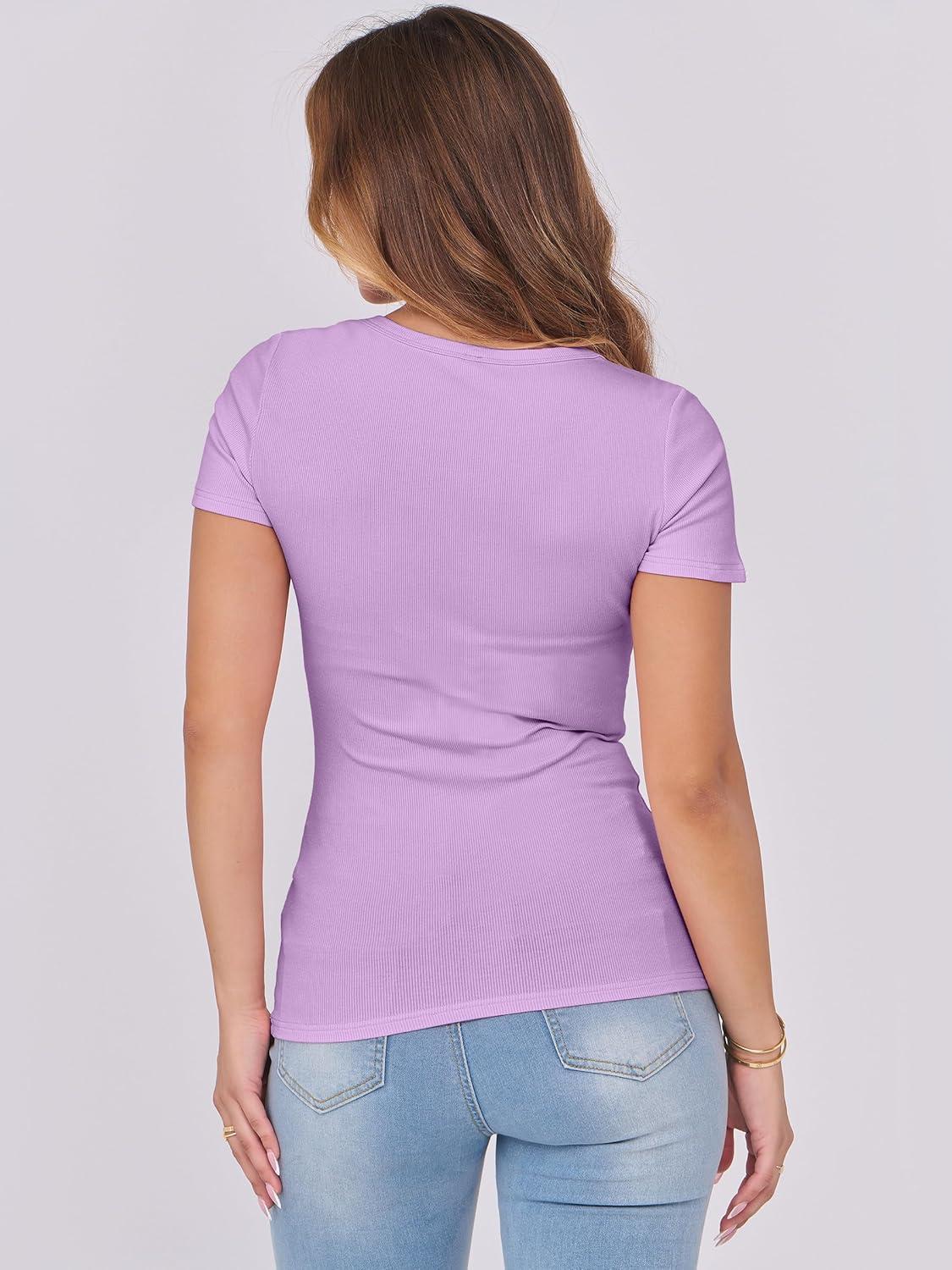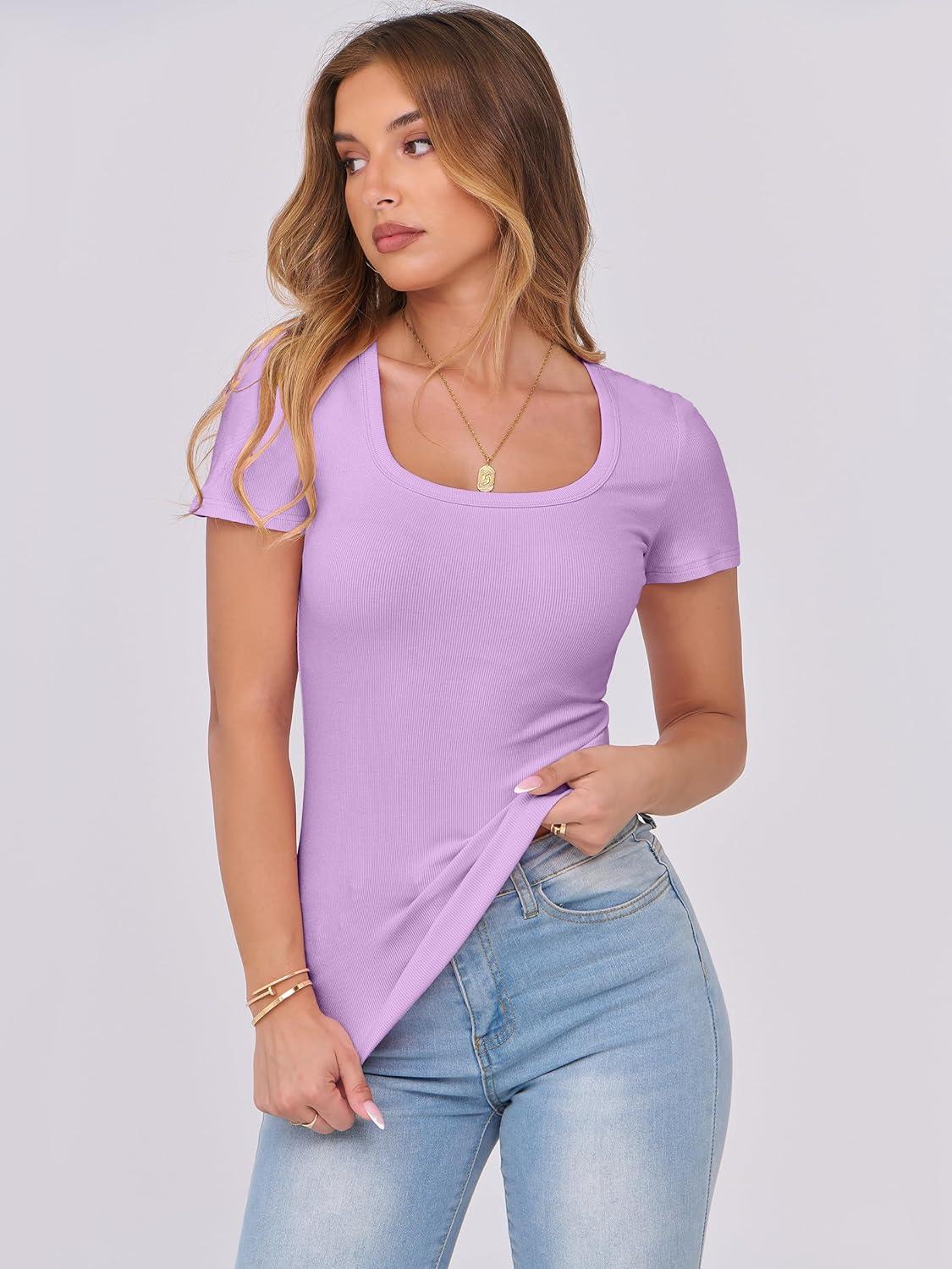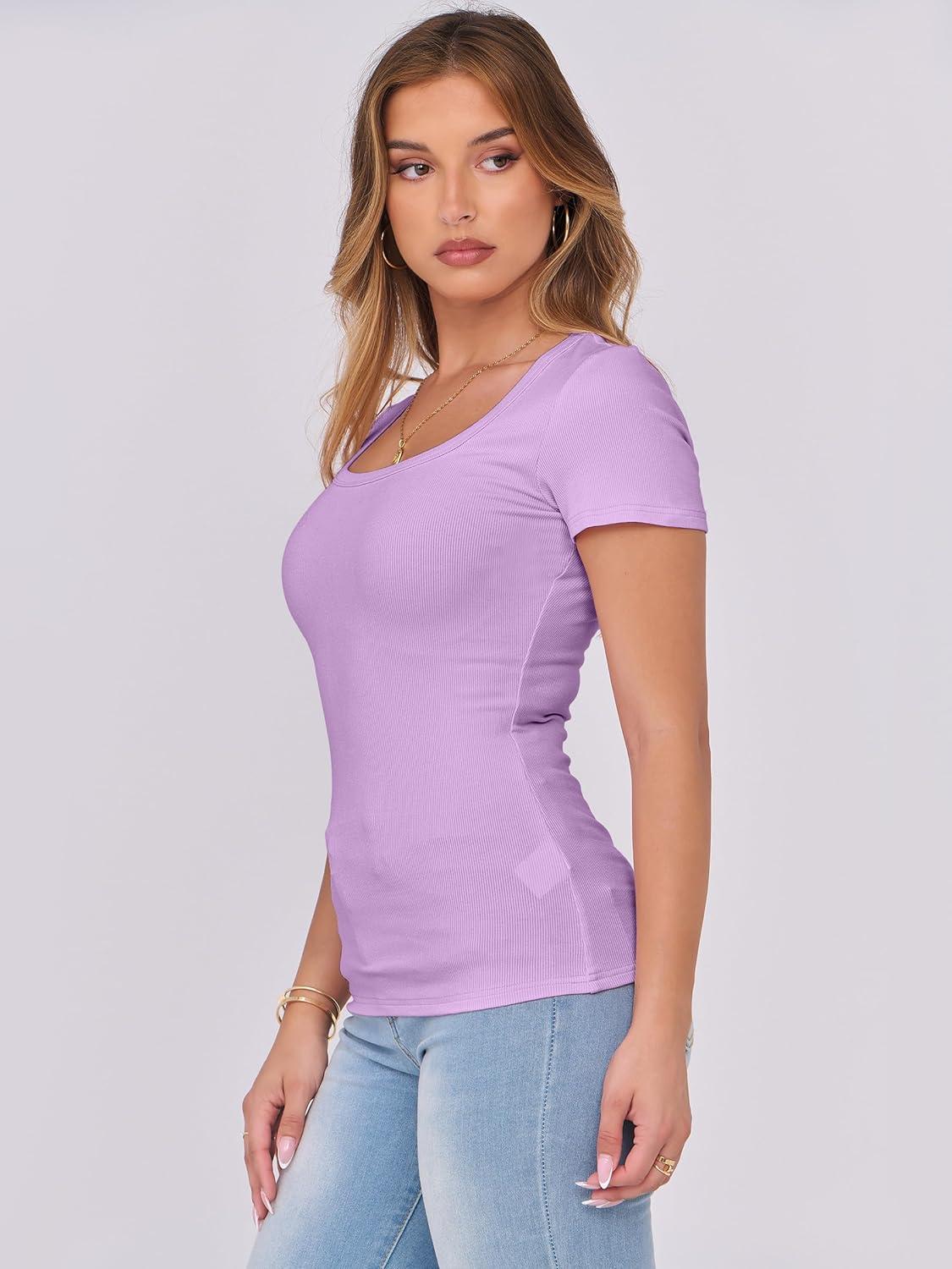 ANRABESS Women Short Sleeve Tops Scoop Neck Ribbed Knit Slim Fitted Basic Tee Shirts Casual Summer Clothes 2025 Fall Outfits(Light Purple)