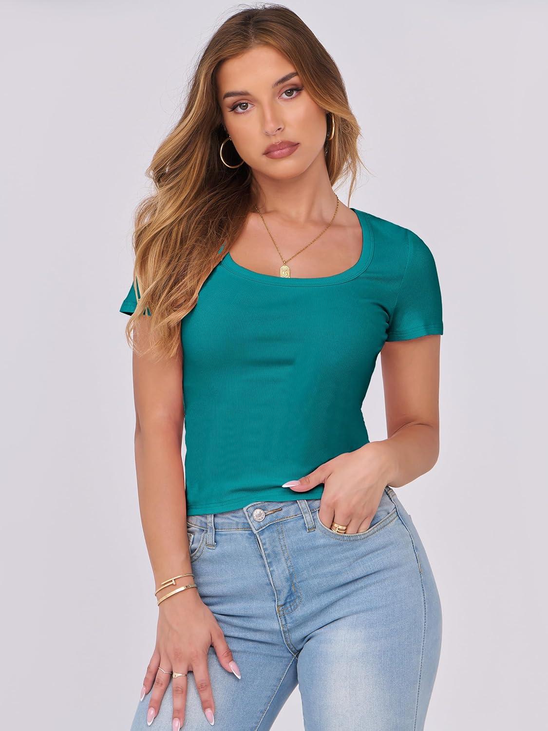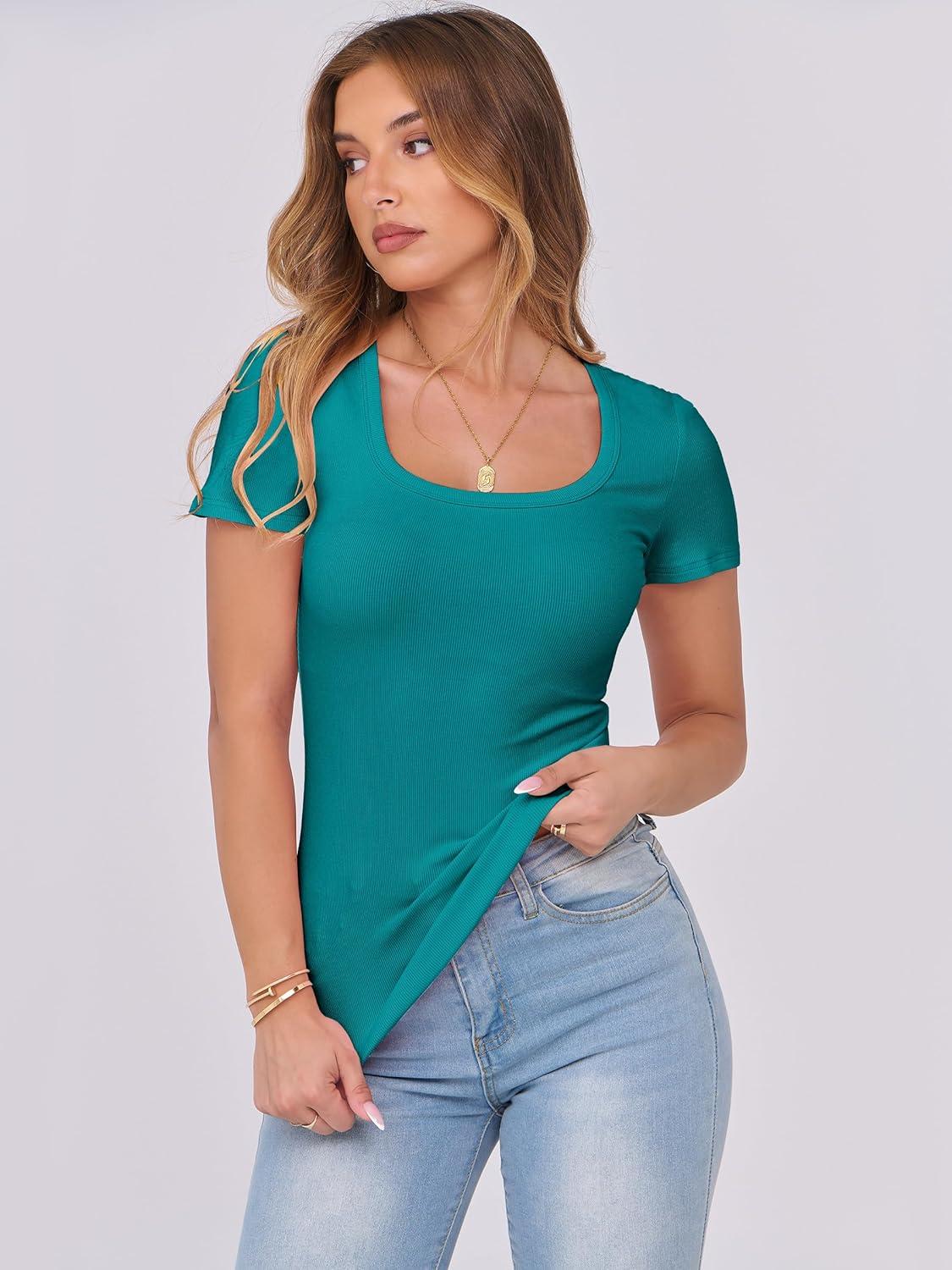 ANRABESS Women Short Sleeve Tops Scoop Neck Ribbed Knit Slim Fitted Basic Tee Shirts Casual Summer Clothes 2025 Fall Outfits(Teal)
