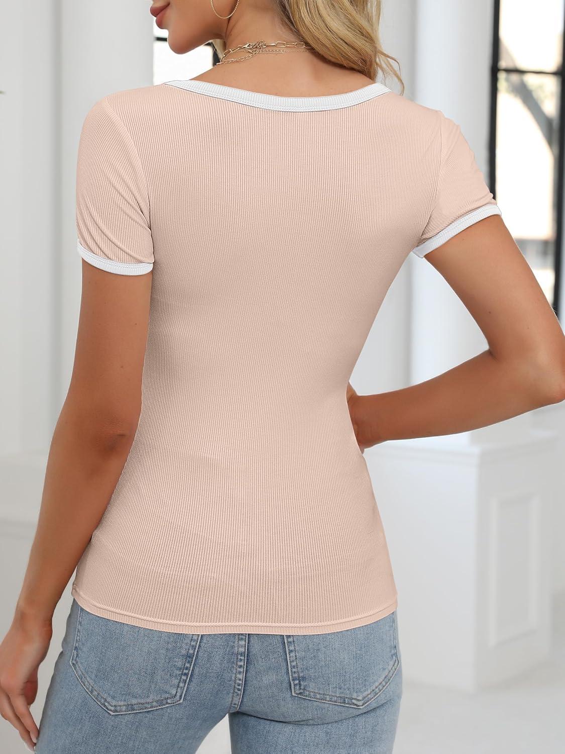 ANRABESS Women Short Sleeve Tops Square Neck Ribbed Knit Color Block T Shirts Fitted Casual Summer 2025 Trendy Basic Tees(Apricot)