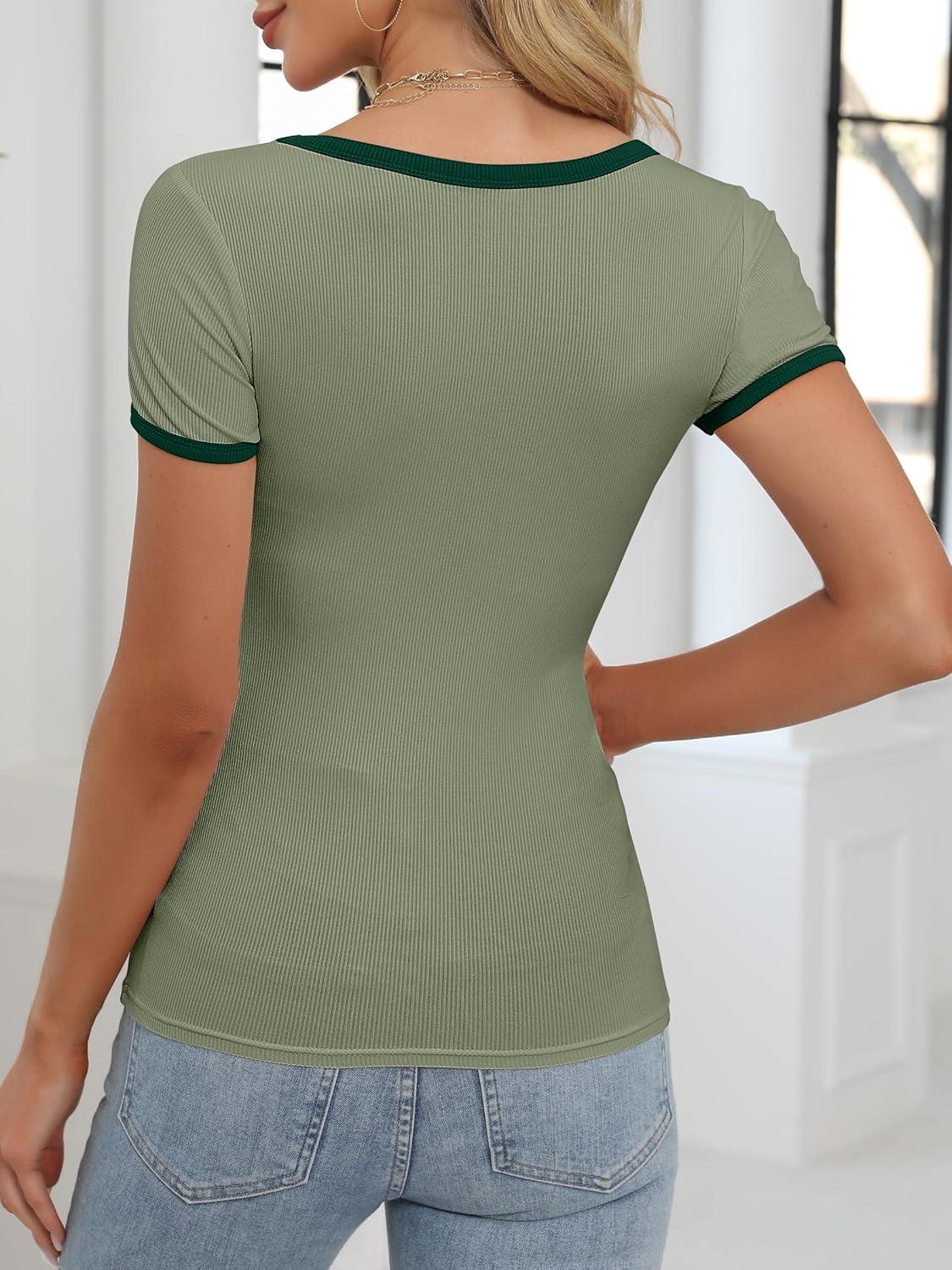 ANRABESS Women Short Sleeve Tops Square Neck Ribbed Knit Color Block T Shirts Fitted Casual Summer 2025 Trendy Basic Tees(Army Green)
