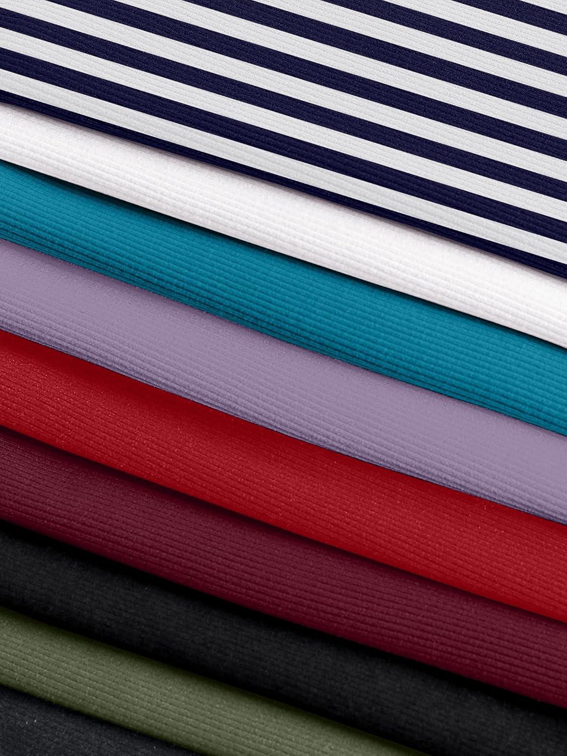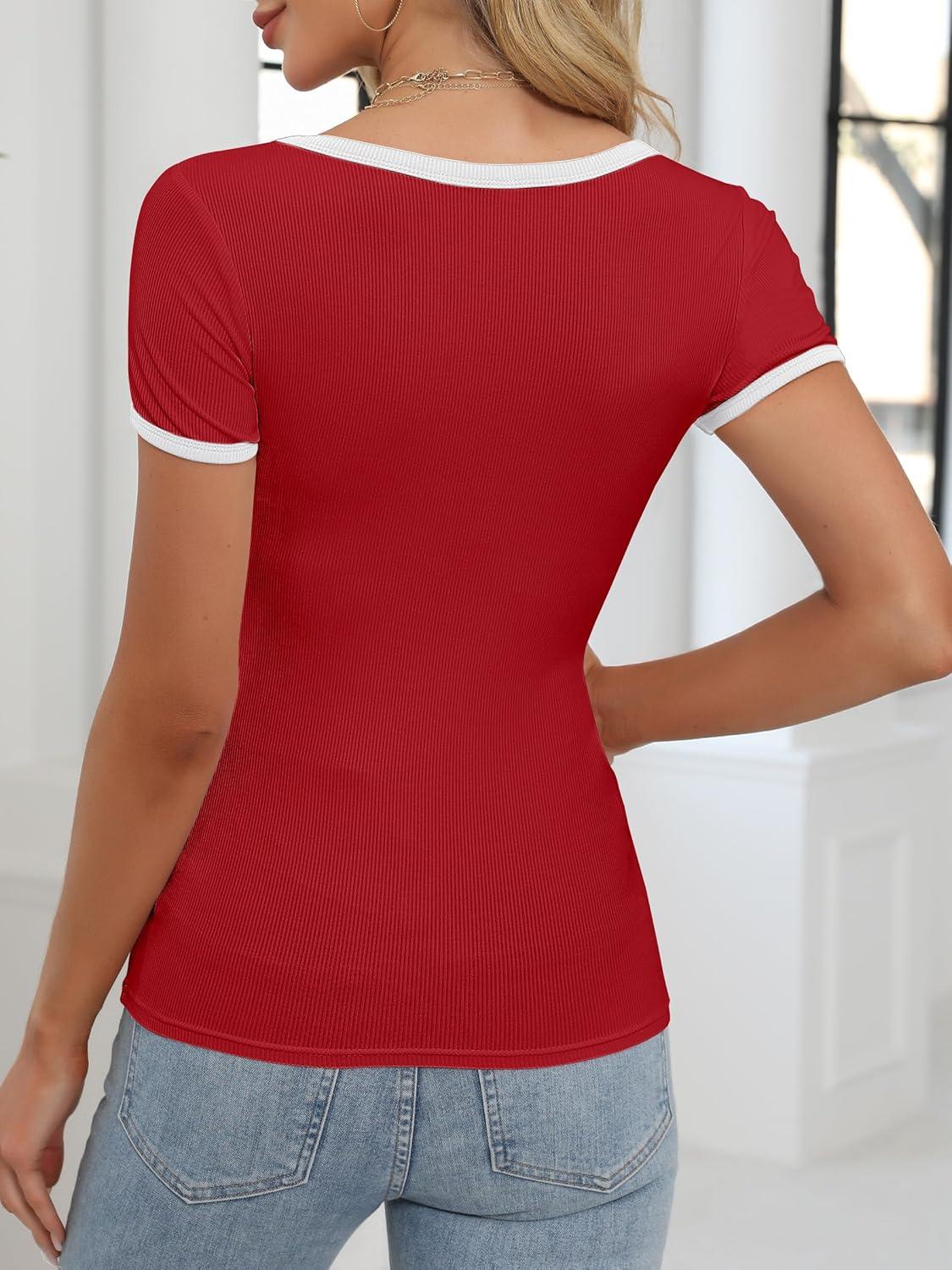 ANRABESS Women Short Sleeve Tops Square Neck Ribbed Knit Color Block T Shirts Fitted Casual Summer 2025 Trendy Basic Tees(Deep Red)