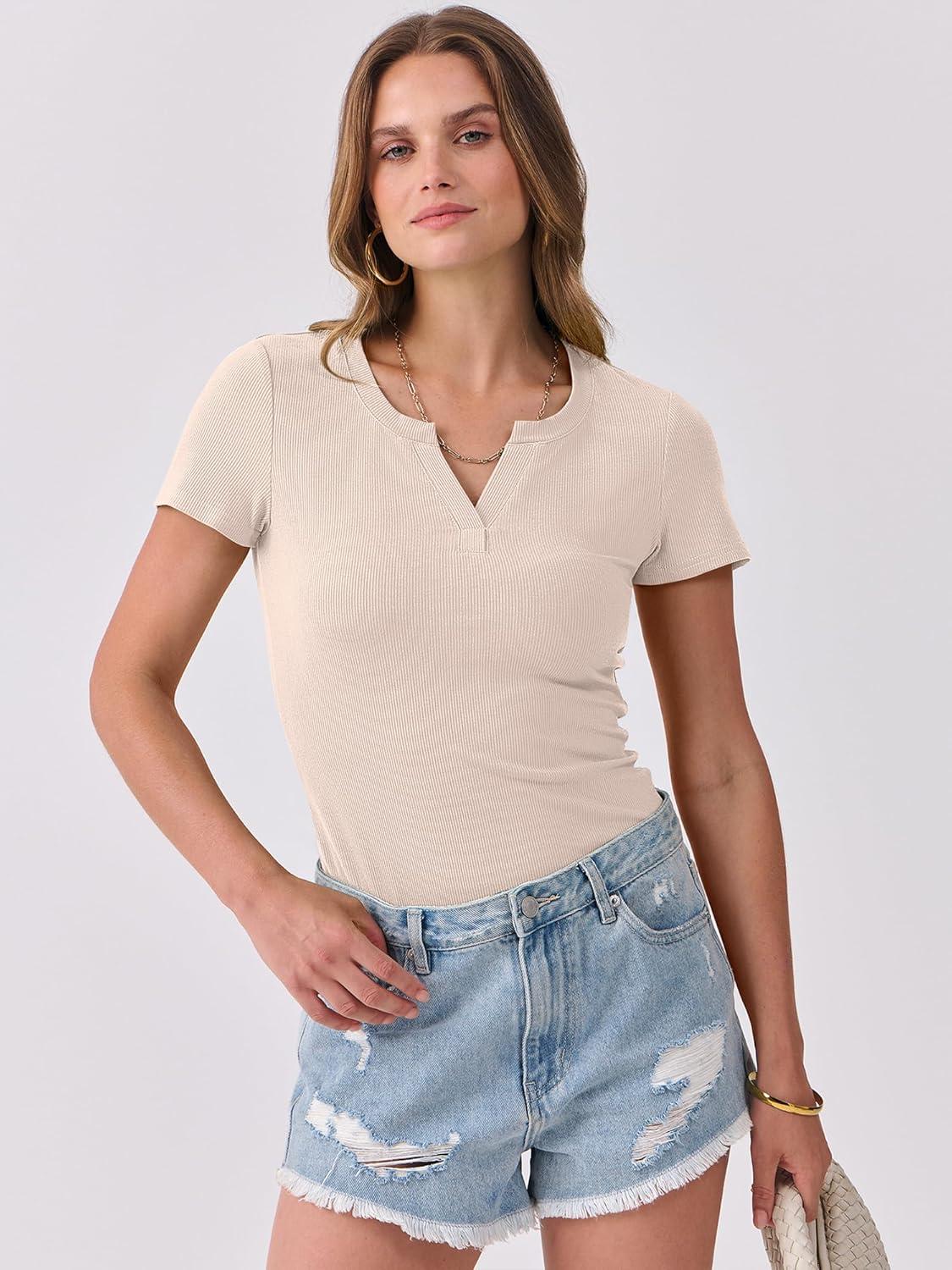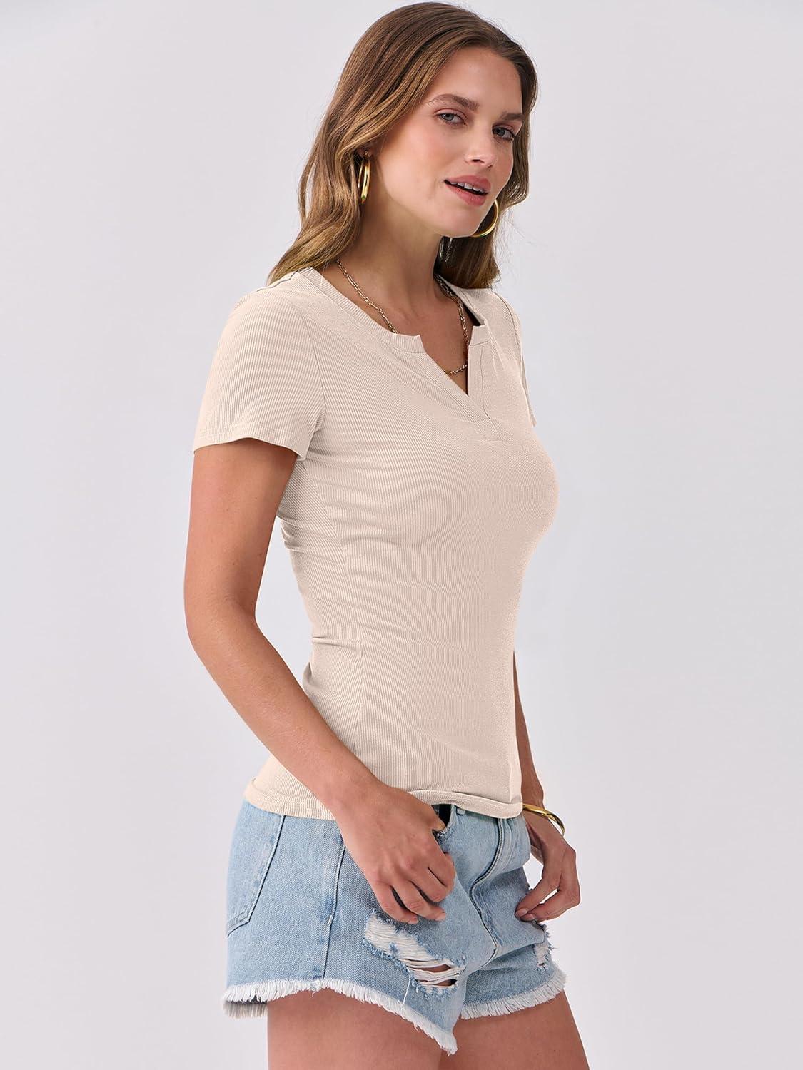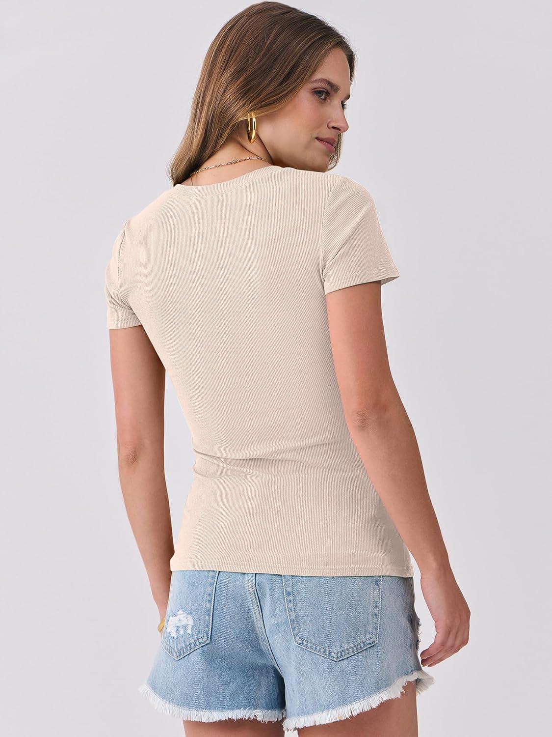 ANRABESS Women Short Sleeve Tops V Neck Rib Knit Slim Fit Shirts Basic Tee 2025 Summer Casual T-Shirt Outfits Clothes(Beige)