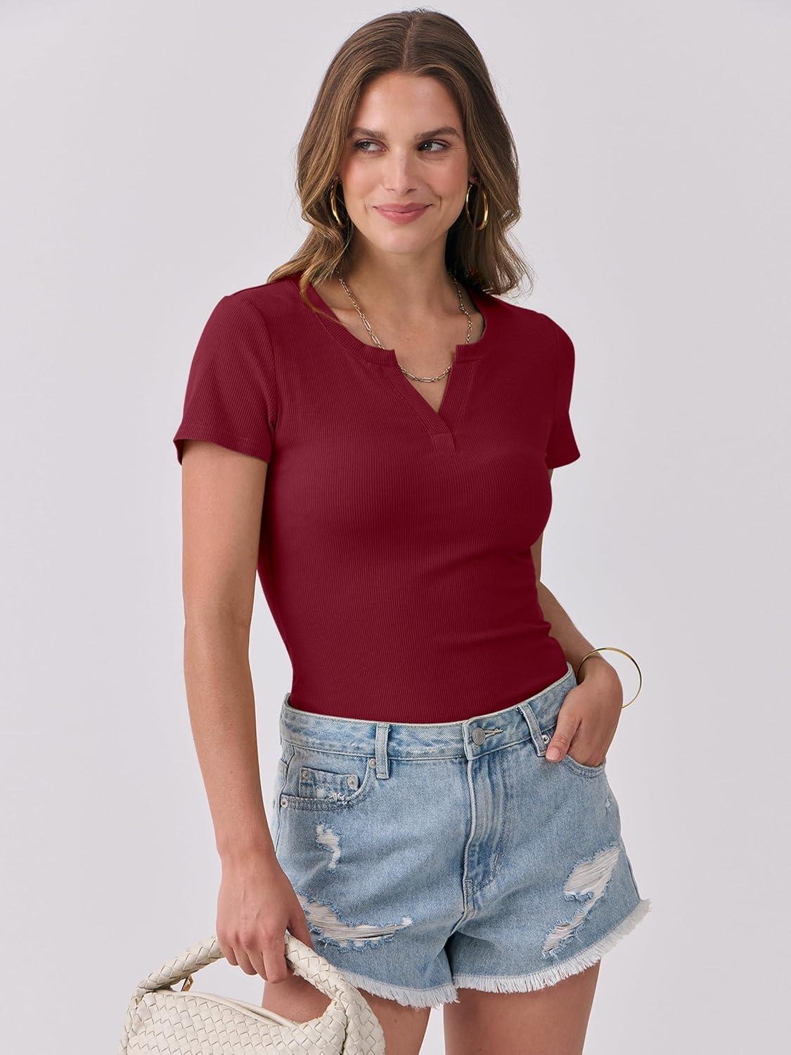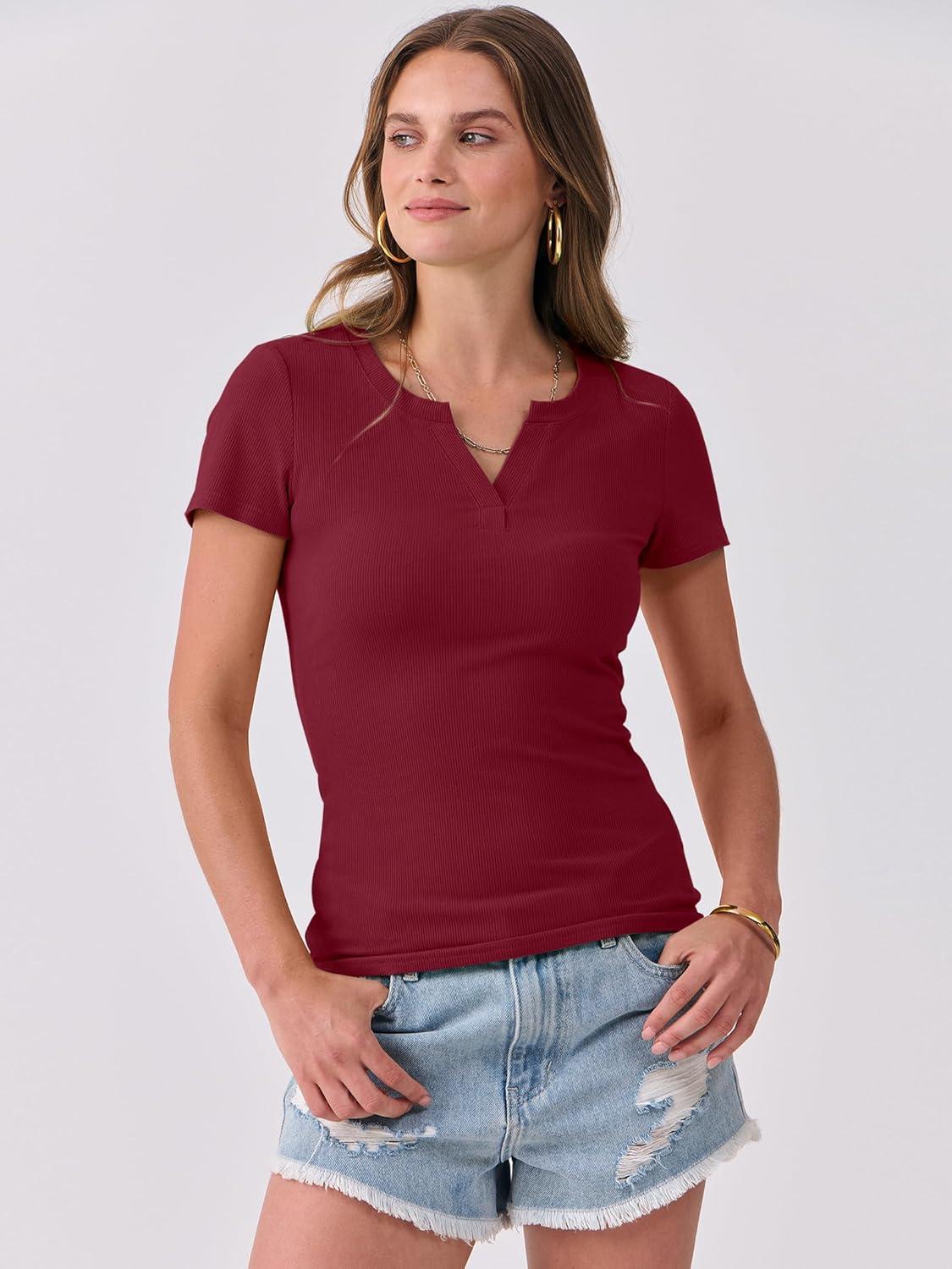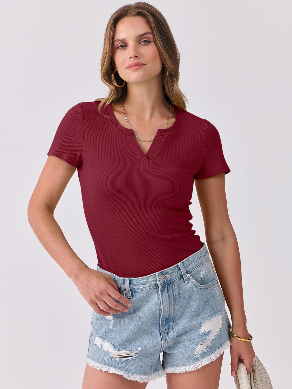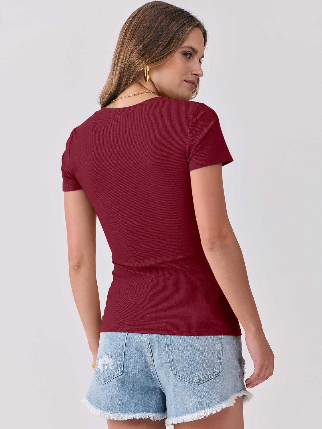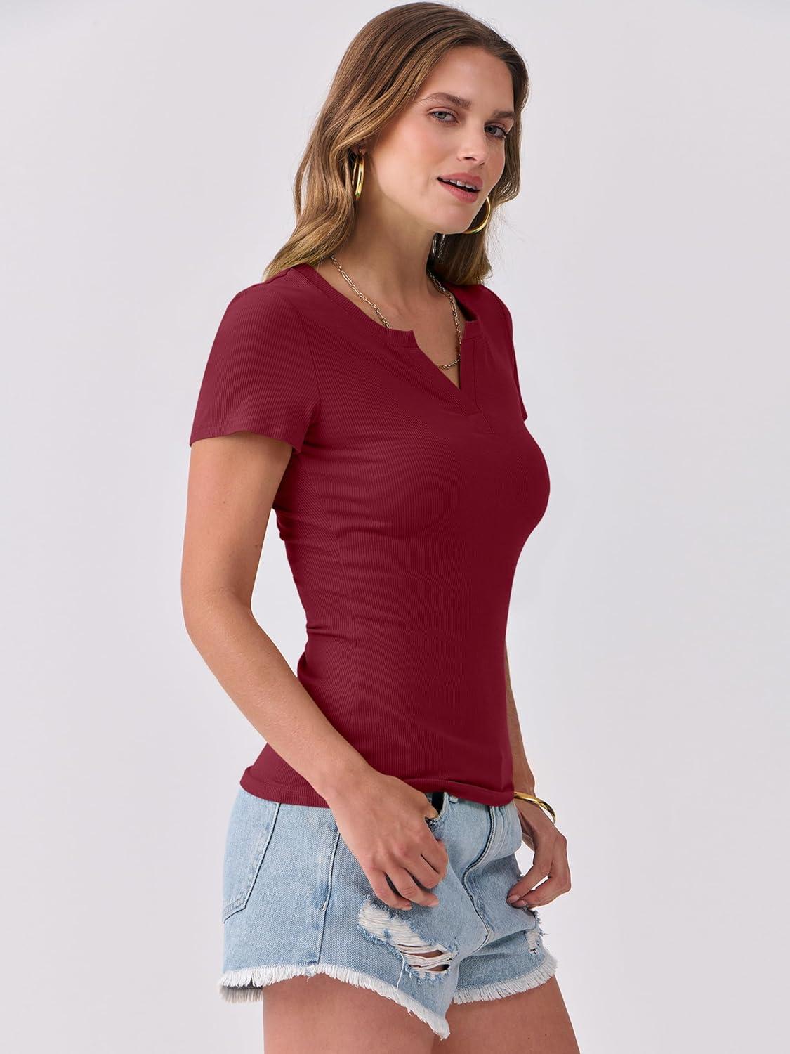 ANRABESS Women Short Sleeve Tops V Neck Rib Knit Slim Fit Shirts Basic Tee 2025 Summer Casual T-Shirt Outfits Clothes(Deep Red)
