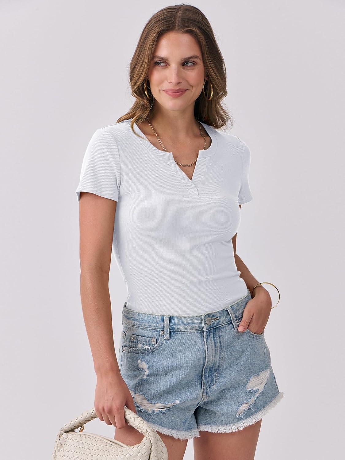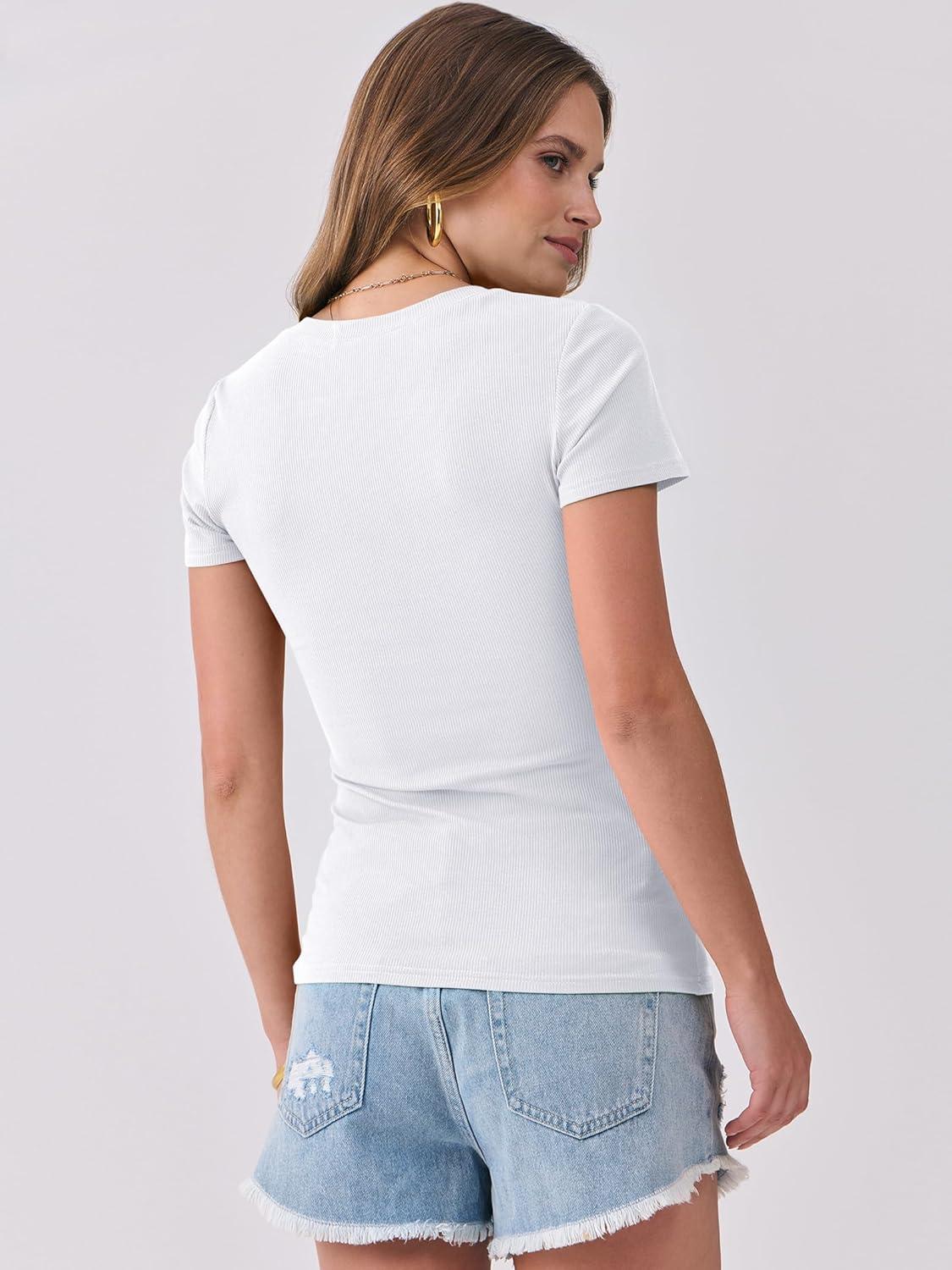 ANRABESS Women Short Sleeve Tops V Neck Rib Knit Slim Fit Shirts Basic Tee 2025 Summer Casual T-Shirt Outfits Clothes(White)