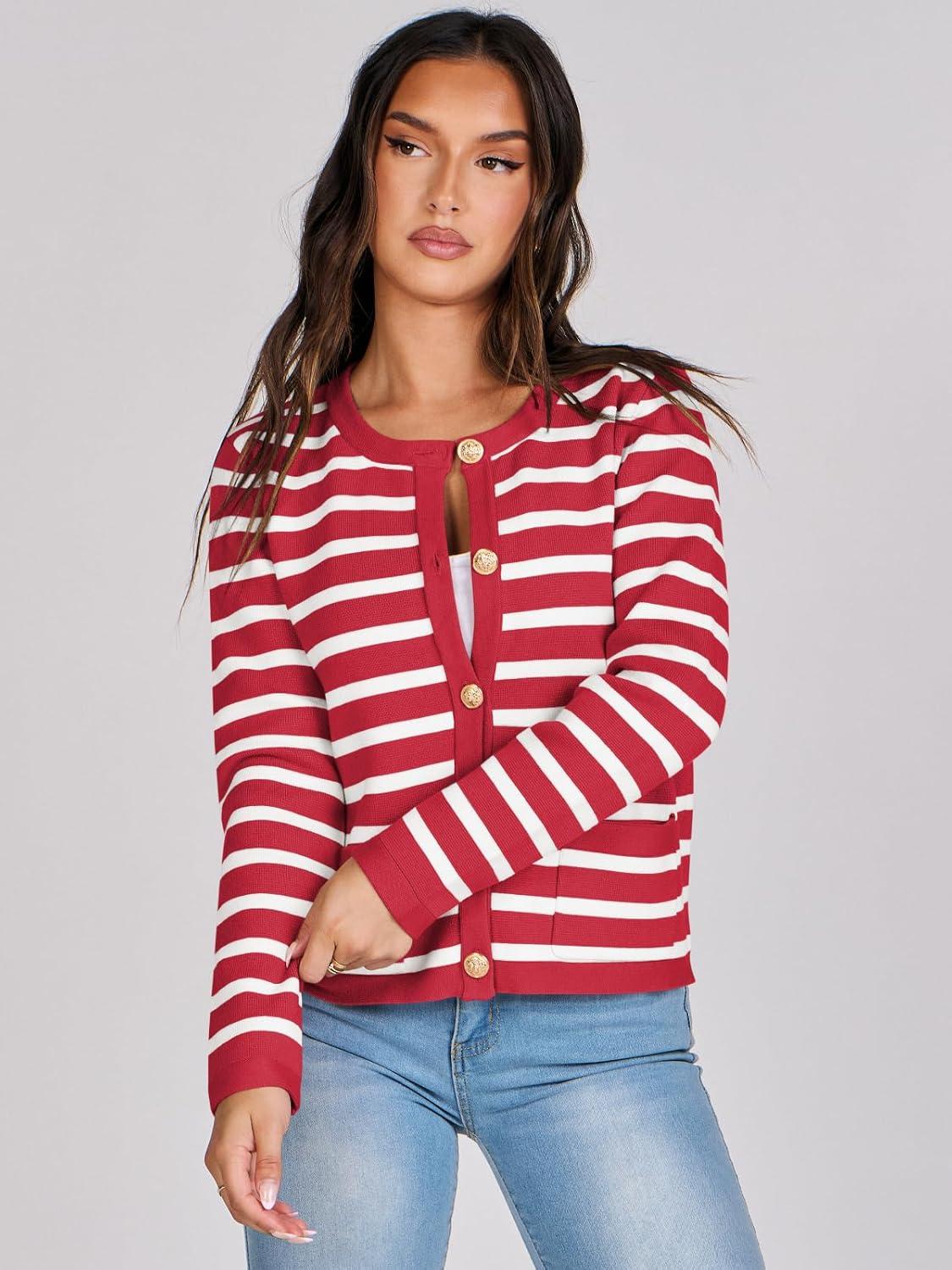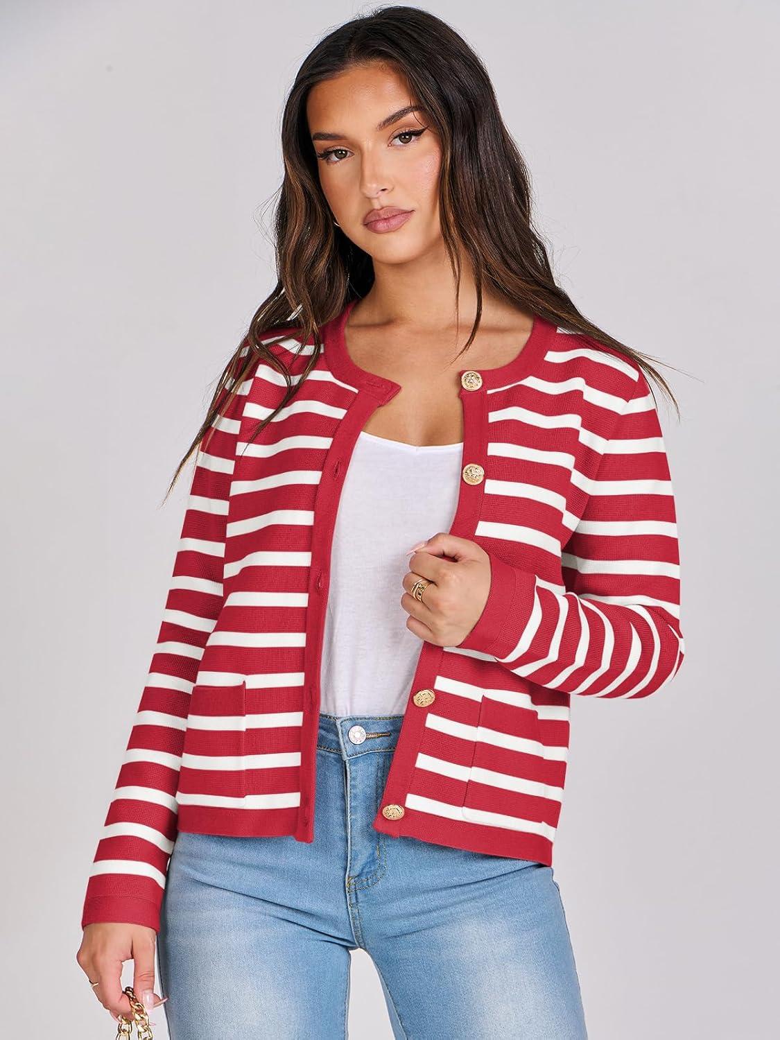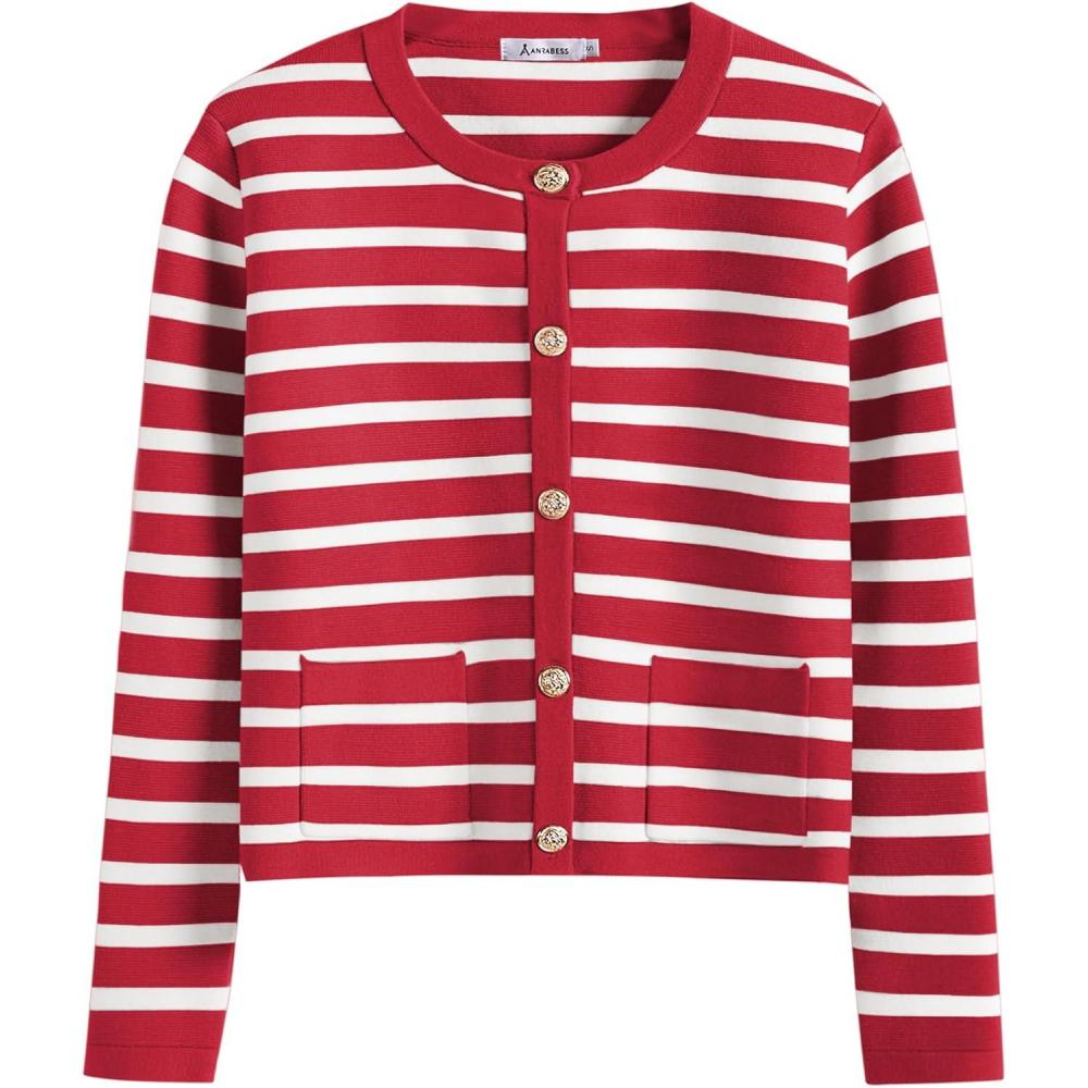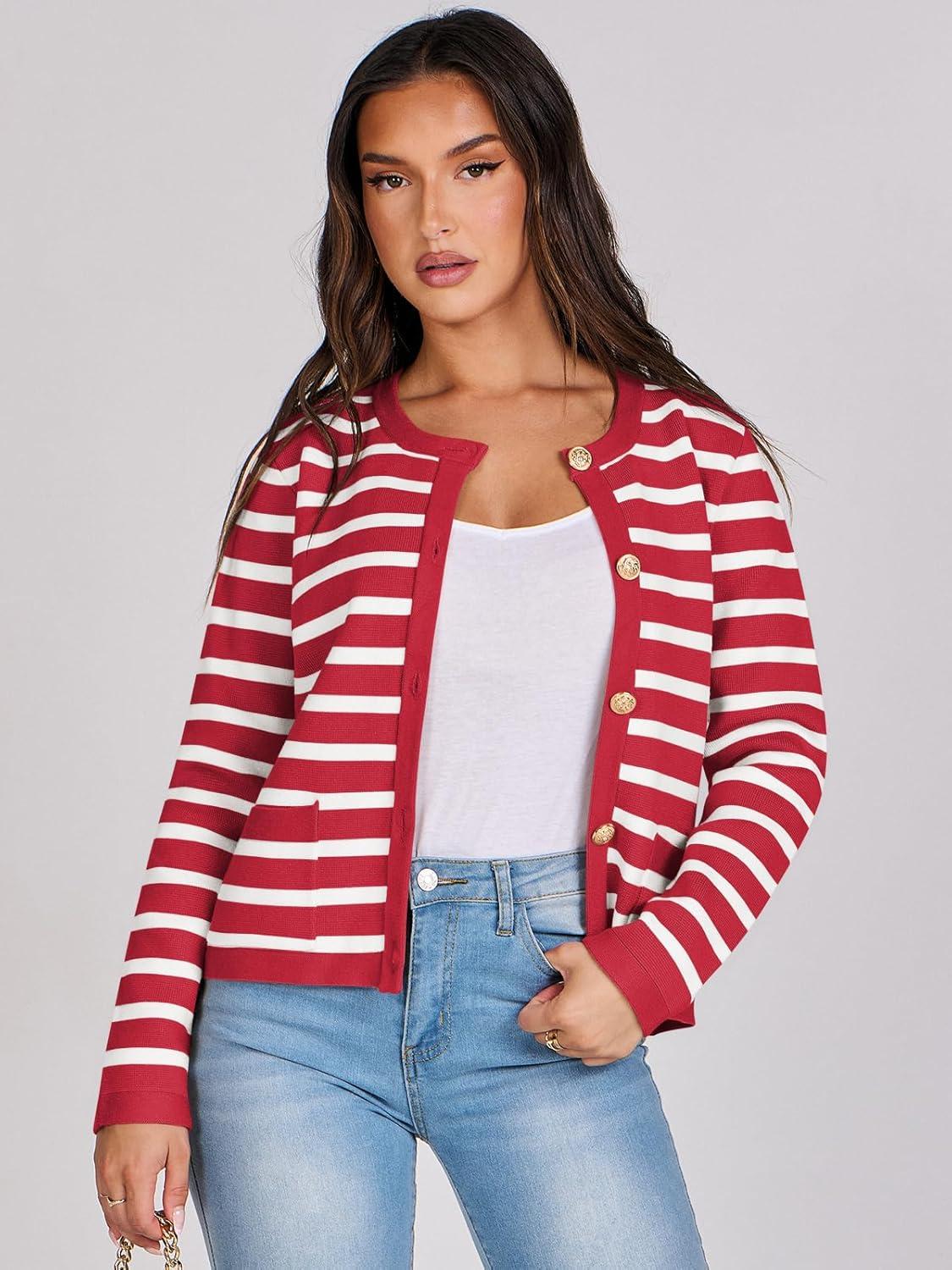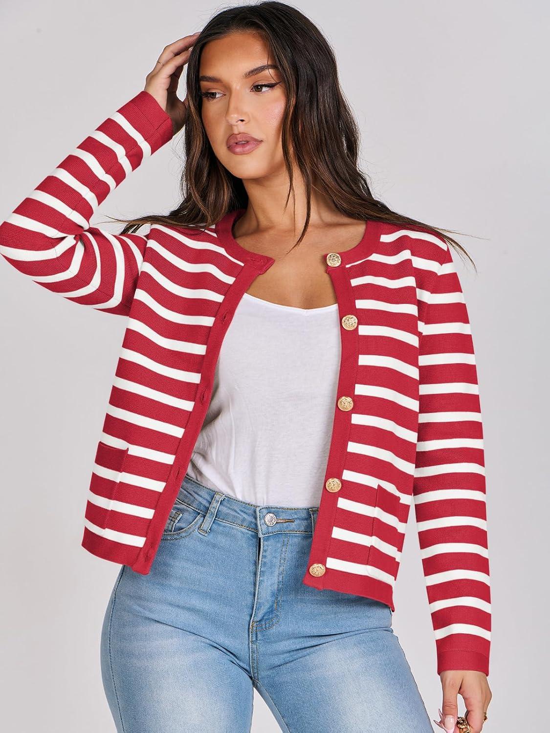 ANRABESS Women Striped Cardigan Sweaters Button Down Cropped Knit Lady Jackets Coat 2025 Fall Outfits Trendy Clothes(Red White Stripe)