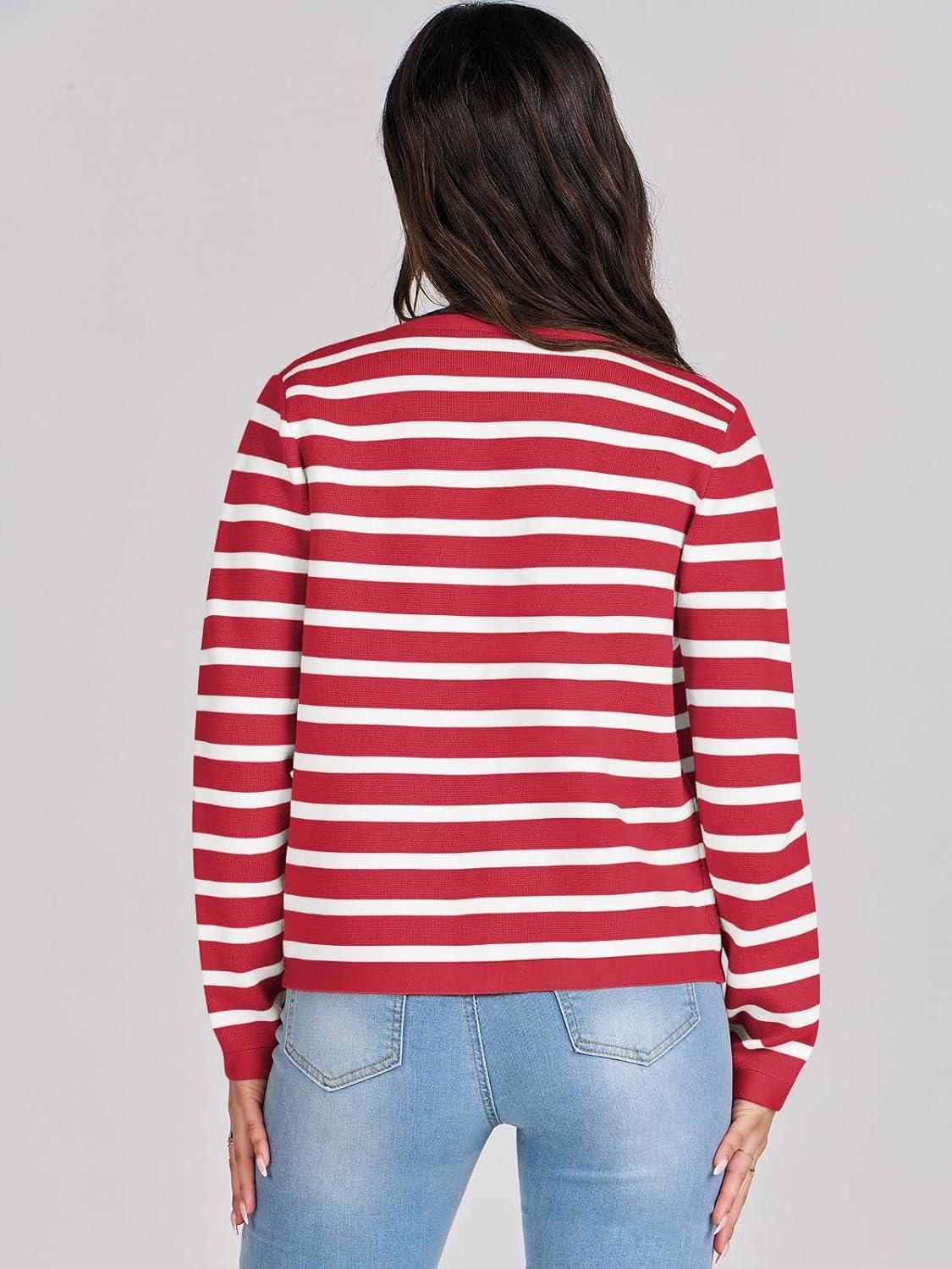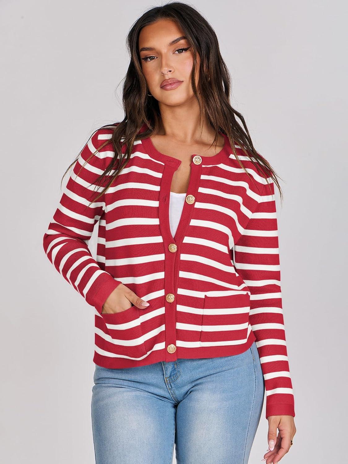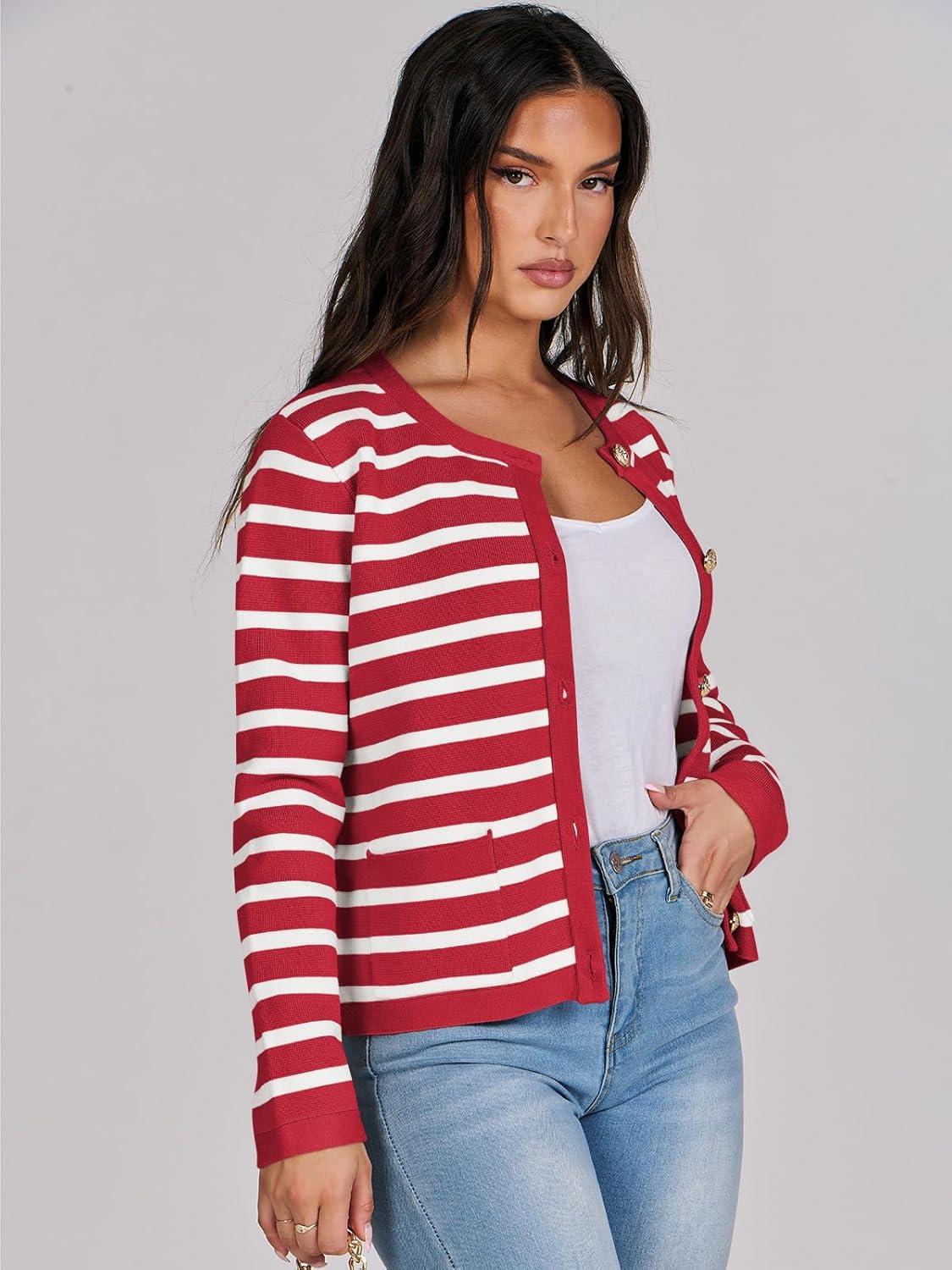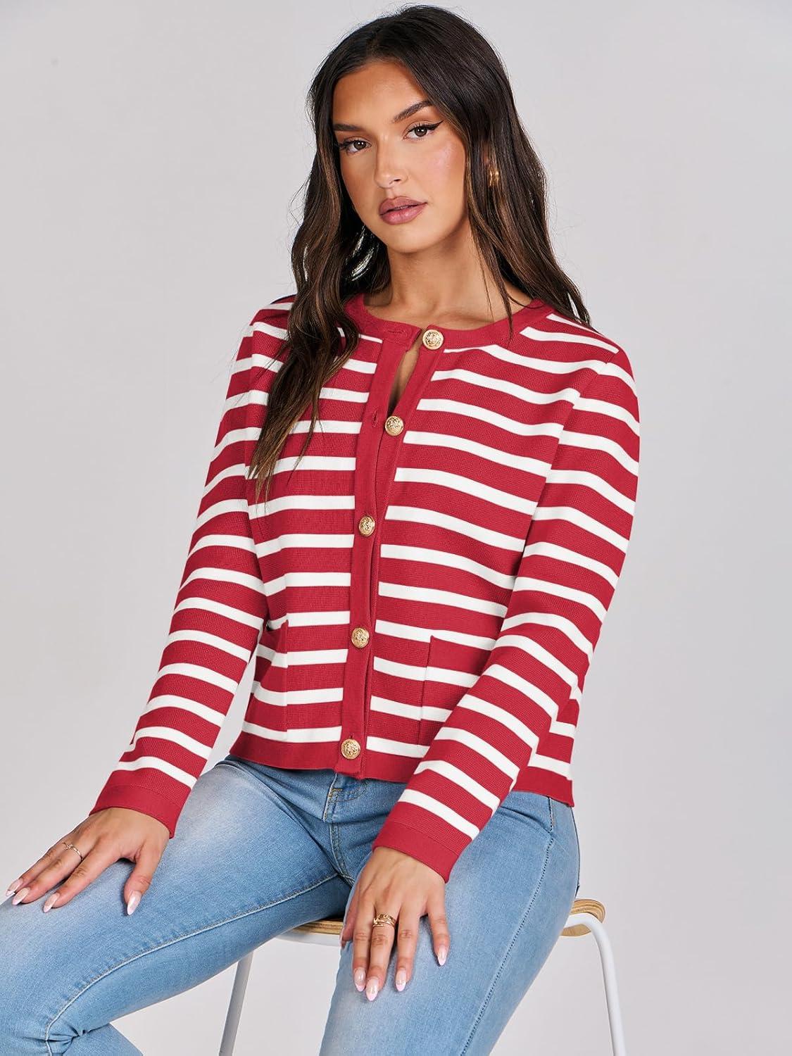 ANRABESS Women Striped Cardigan Sweaters Button Down Cropped Knit Lady Jackets Coat 2025 Fall Outfits Trendy Clothes(Red White Stripe)