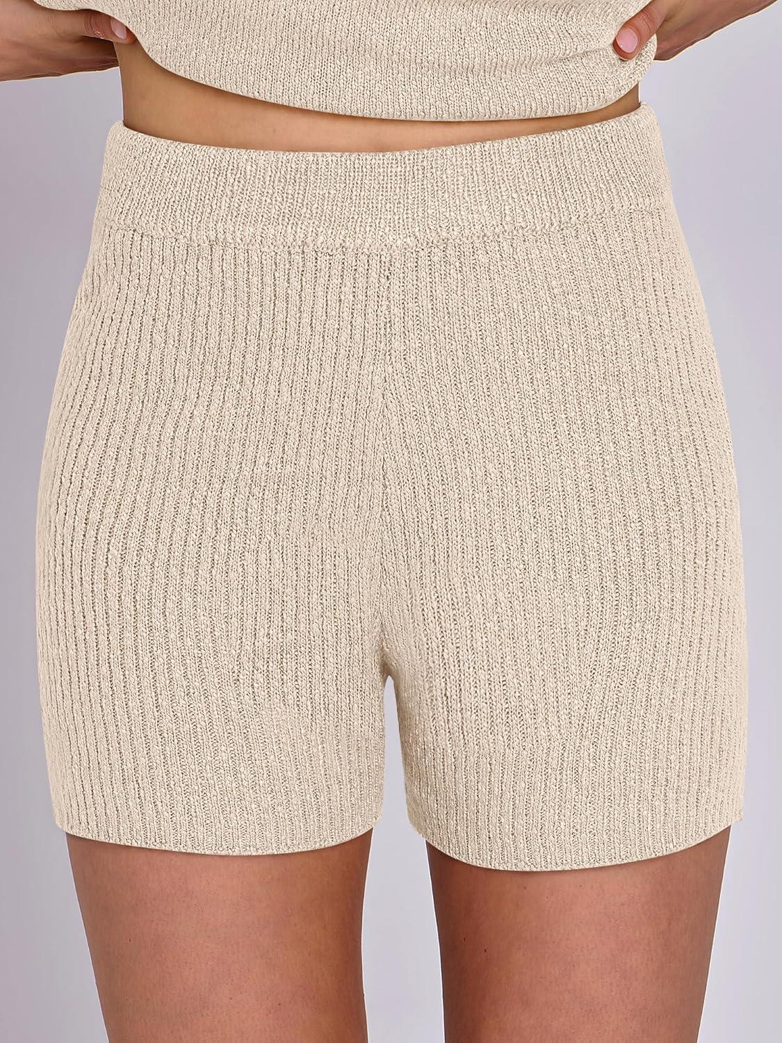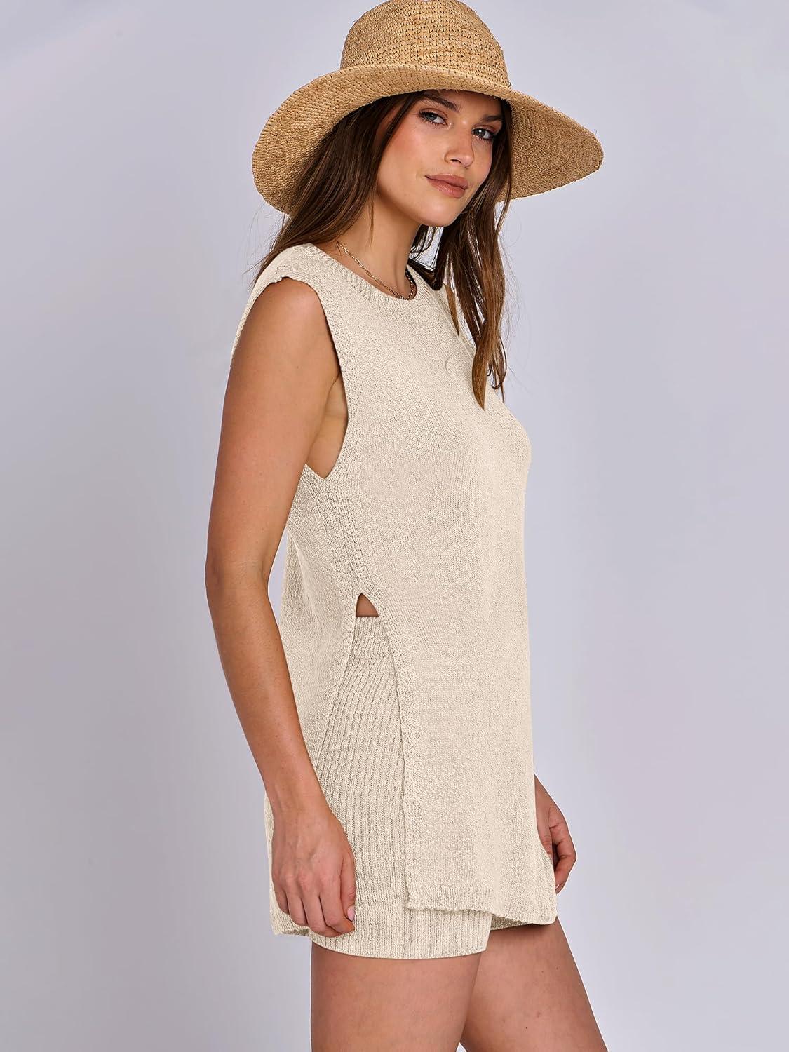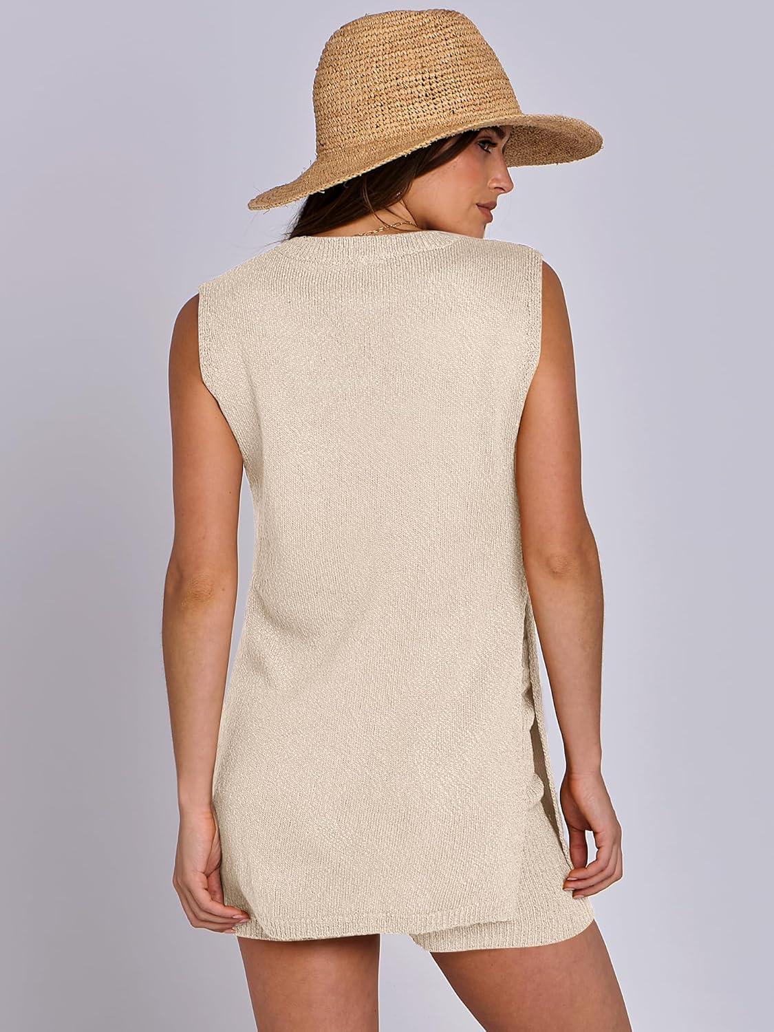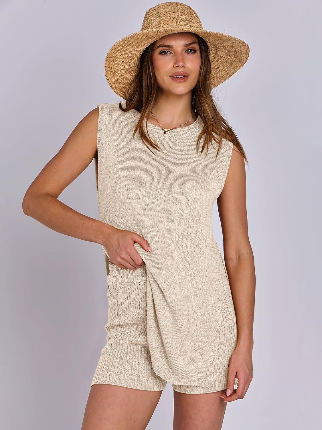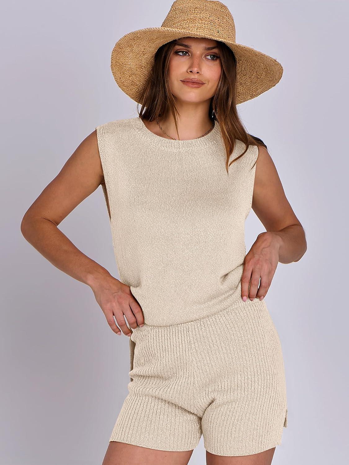 ANRABESS Women Summer 2 Piece Outfits Sleeveless Knit Sweater Top & Shorts Soft Lounge Sets Travel Beach 2025 Spring Clothes(Beige)