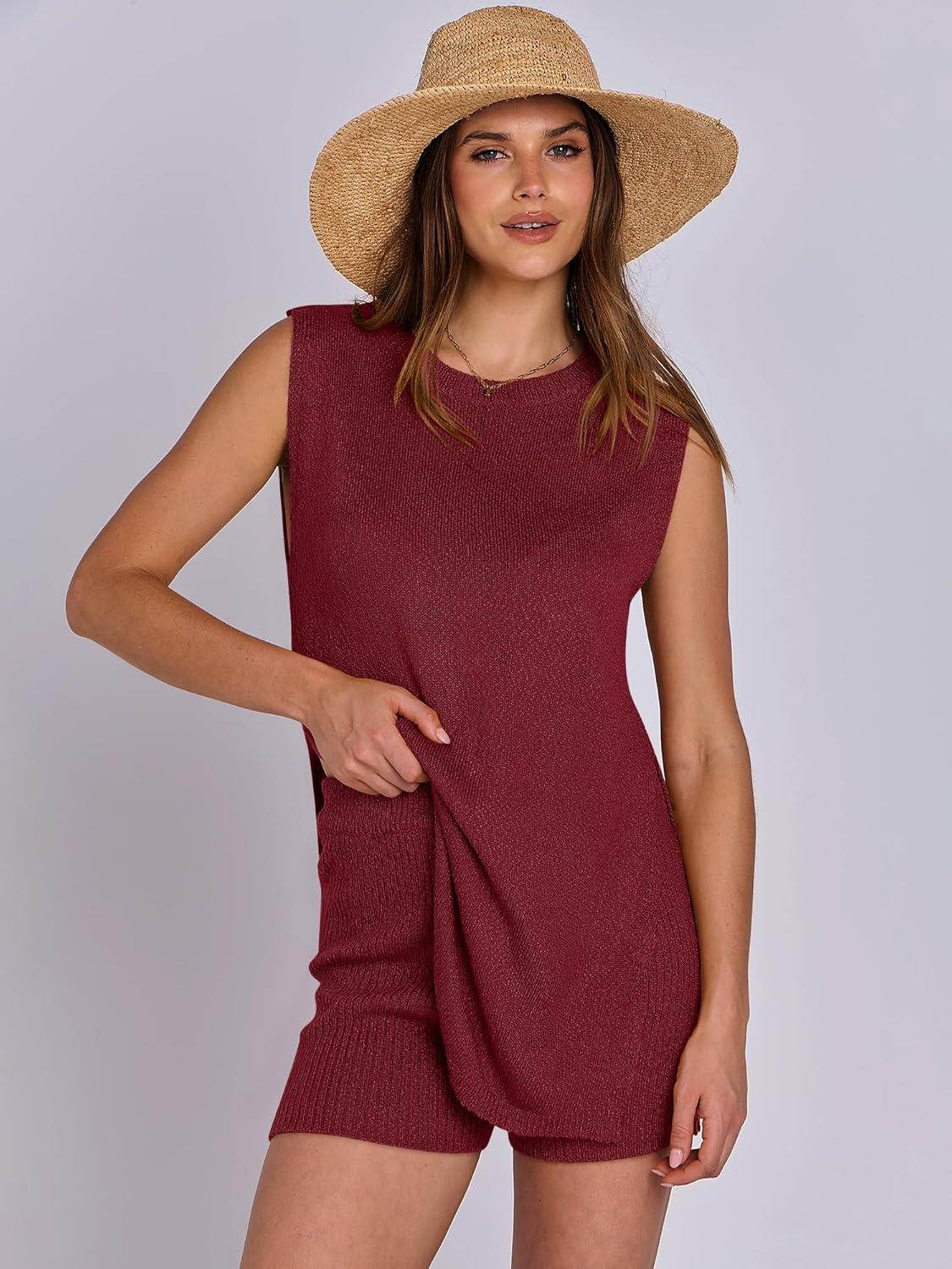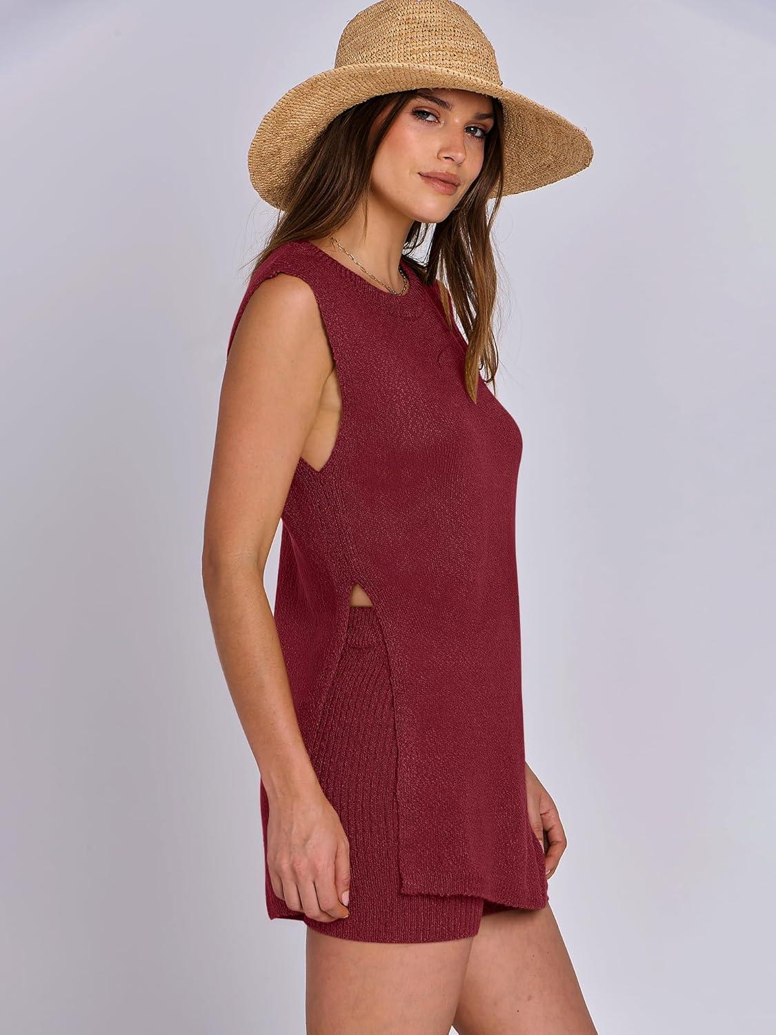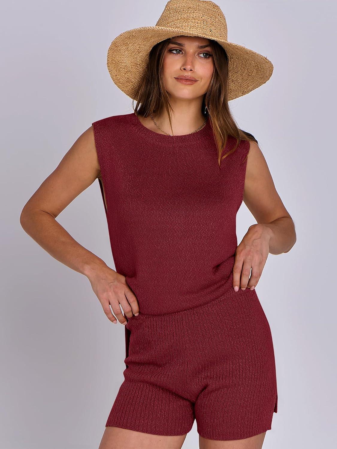ANRABESS Women Summer 2 Piece Outfits Sleeveless Knit Sweater Top & Shorts Soft Lounge Sets Travel Beach 2025 Spring Clothes(Burgundy)