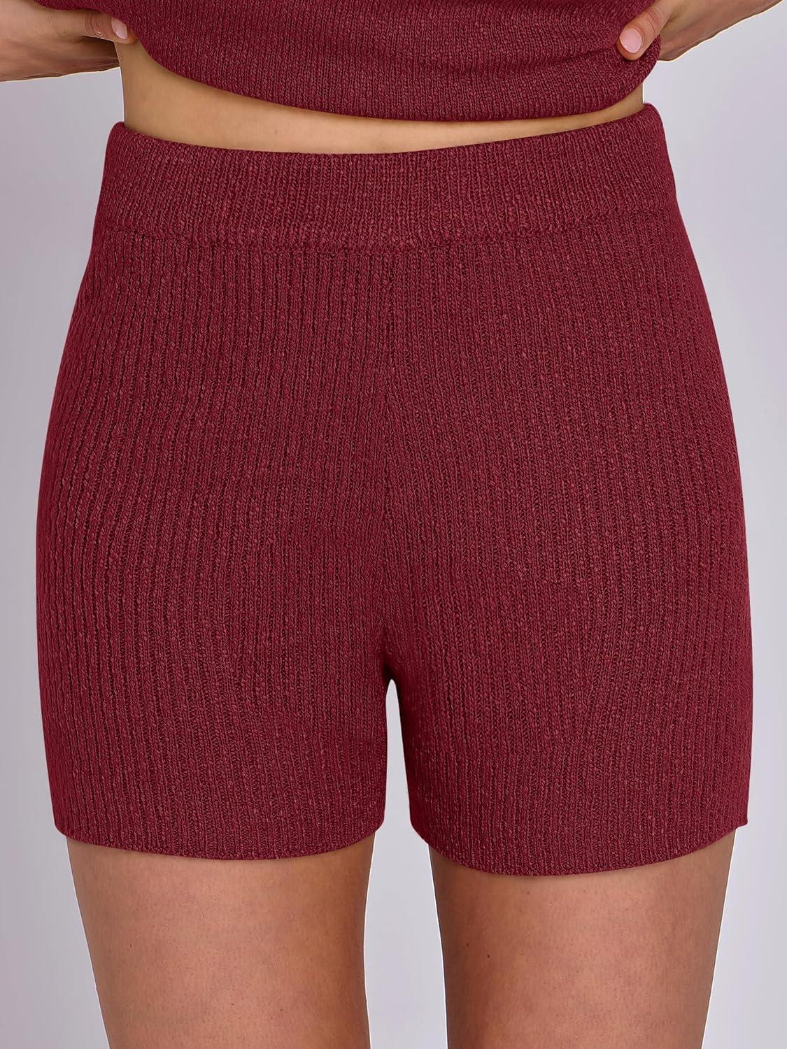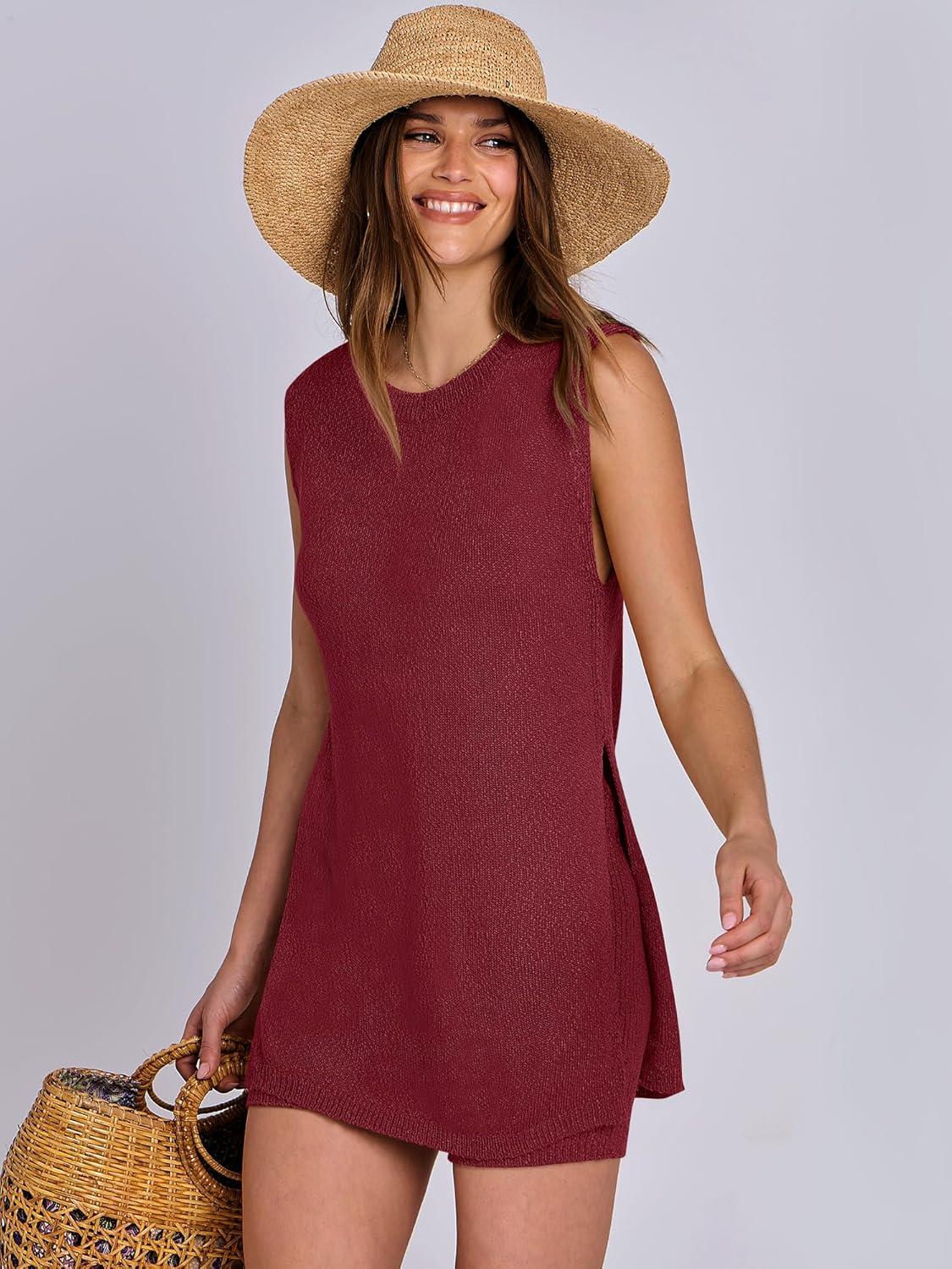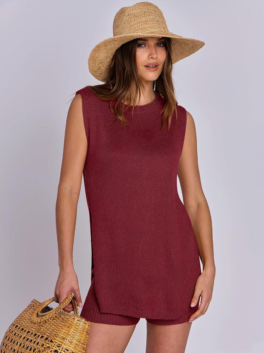 ANRABESS Women Summer 2 Piece Outfits Sleeveless Knit Sweater Top & Shorts Soft Lounge Sets Travel Beach 2025 Spring Clothes(Burgundy)