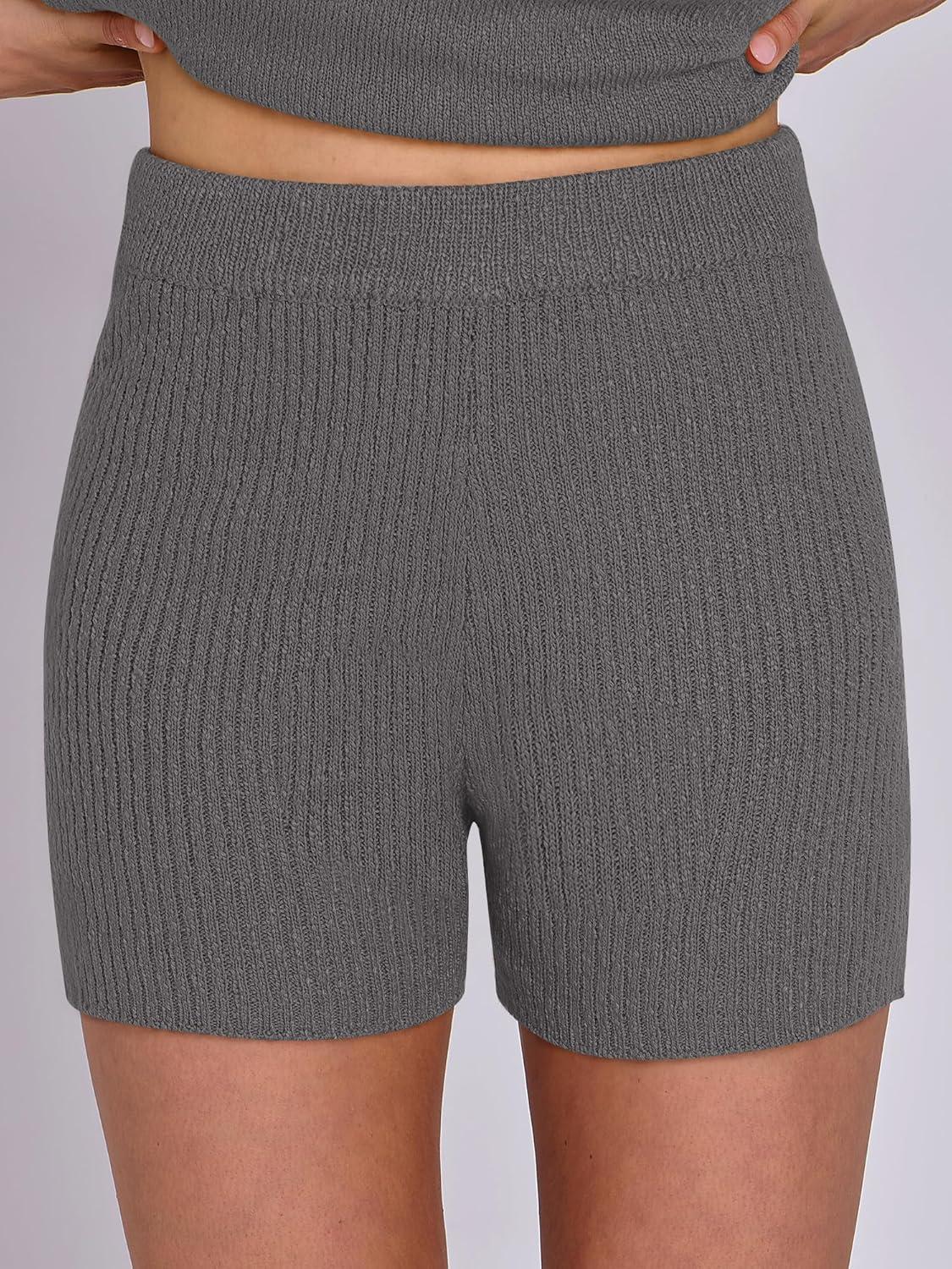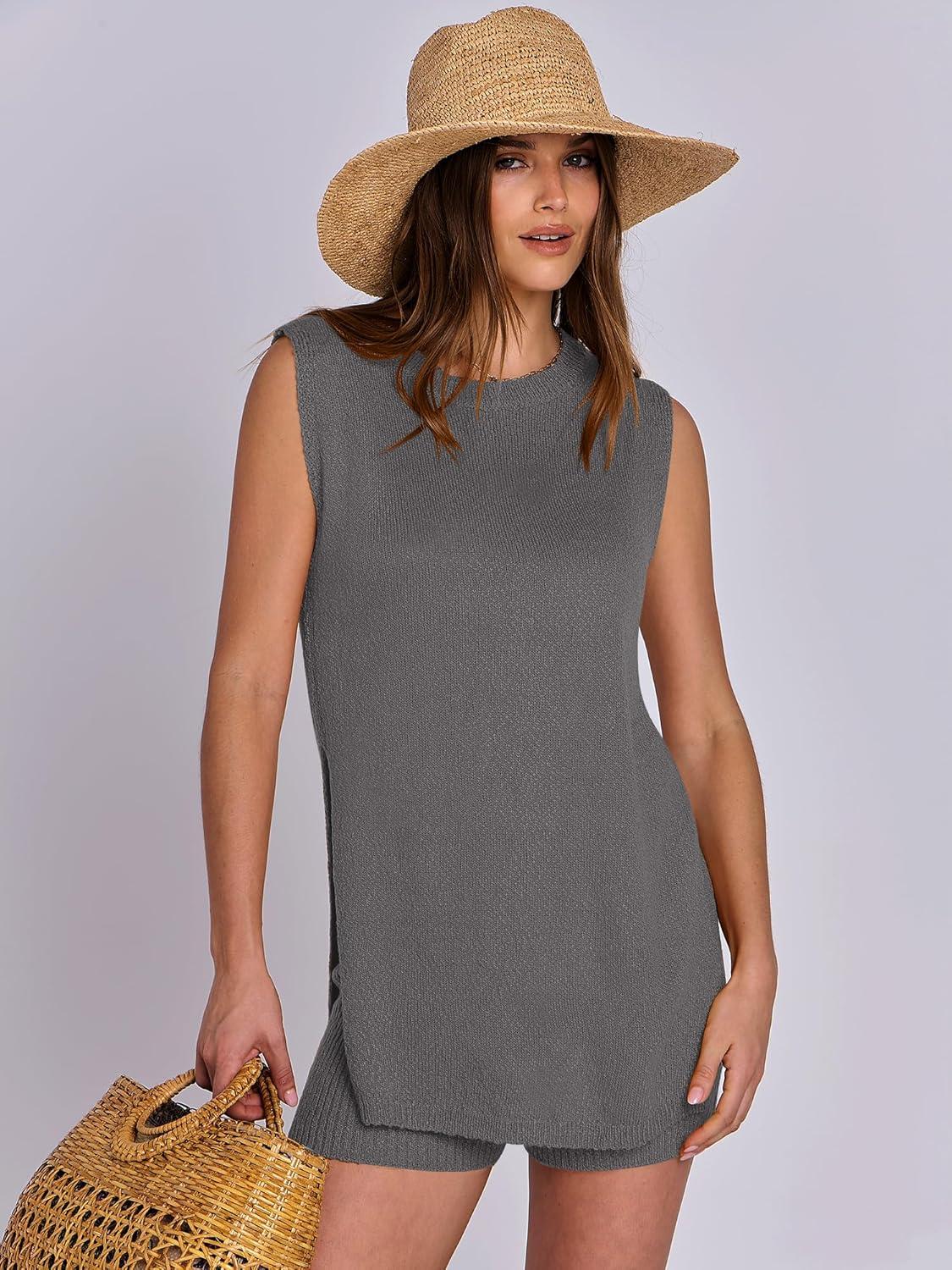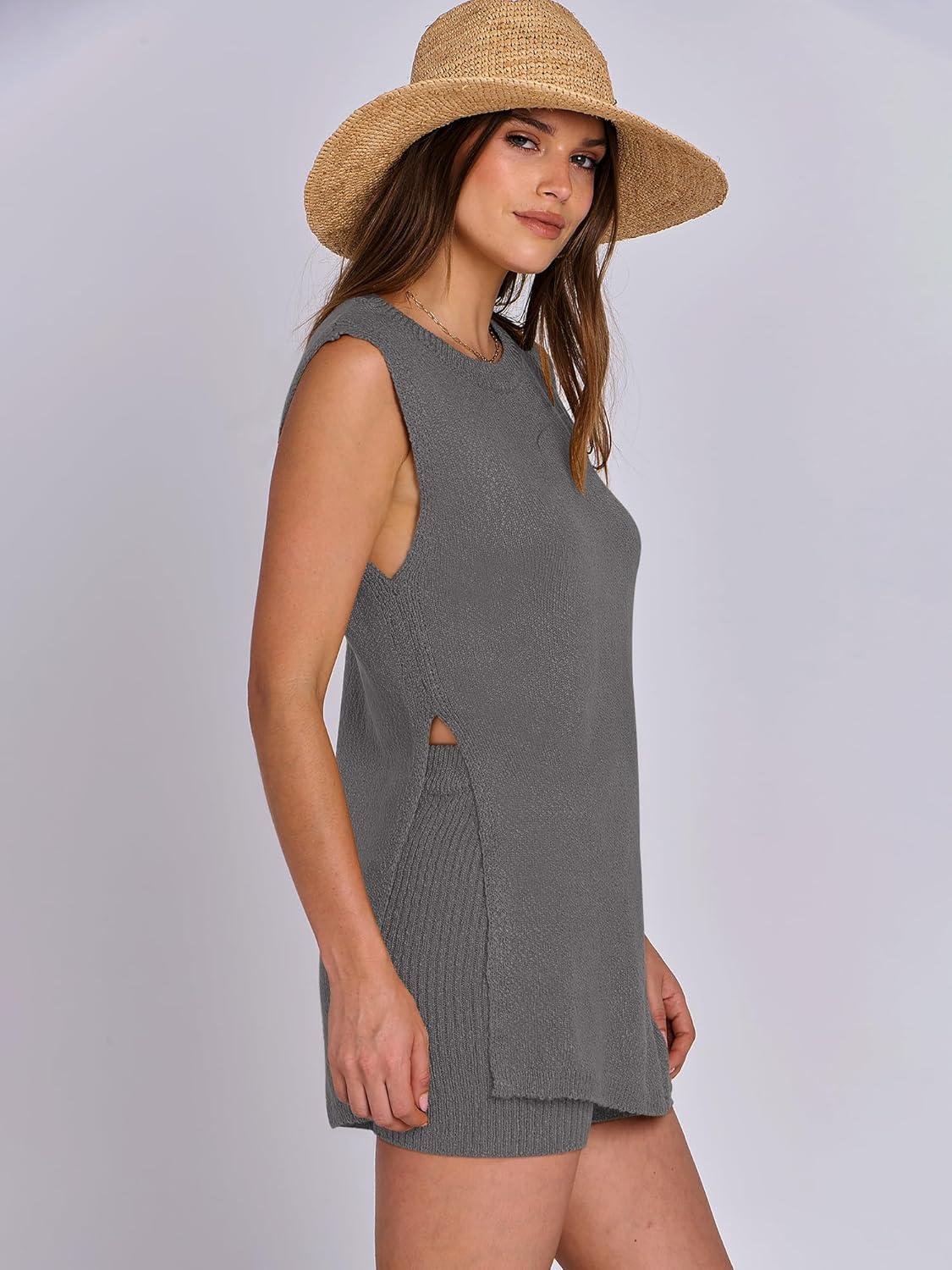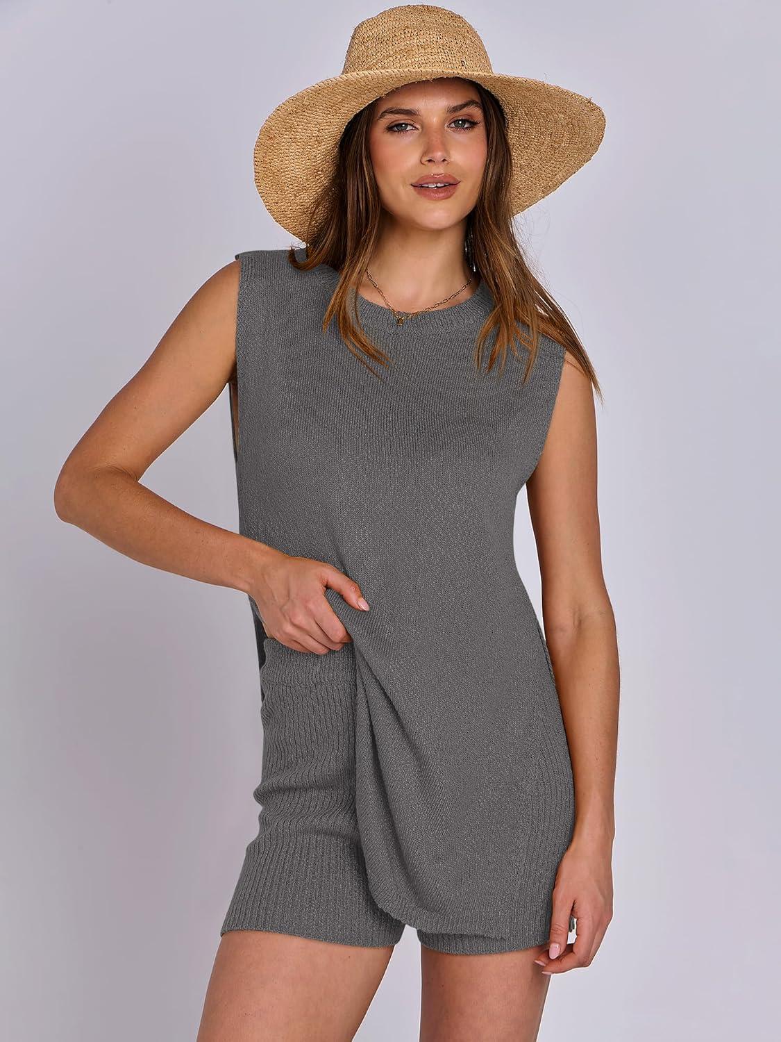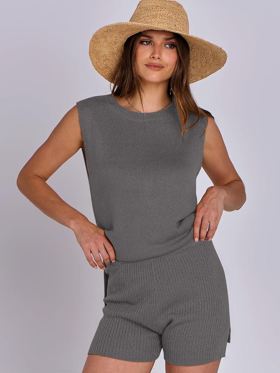ANRABESS Women Summer 2 Piece Outfits Sleeveless Knit Sweater Top & Shorts Soft Lounge Sets Travel Beach 2025 Spring Clothes(Dark Grey)