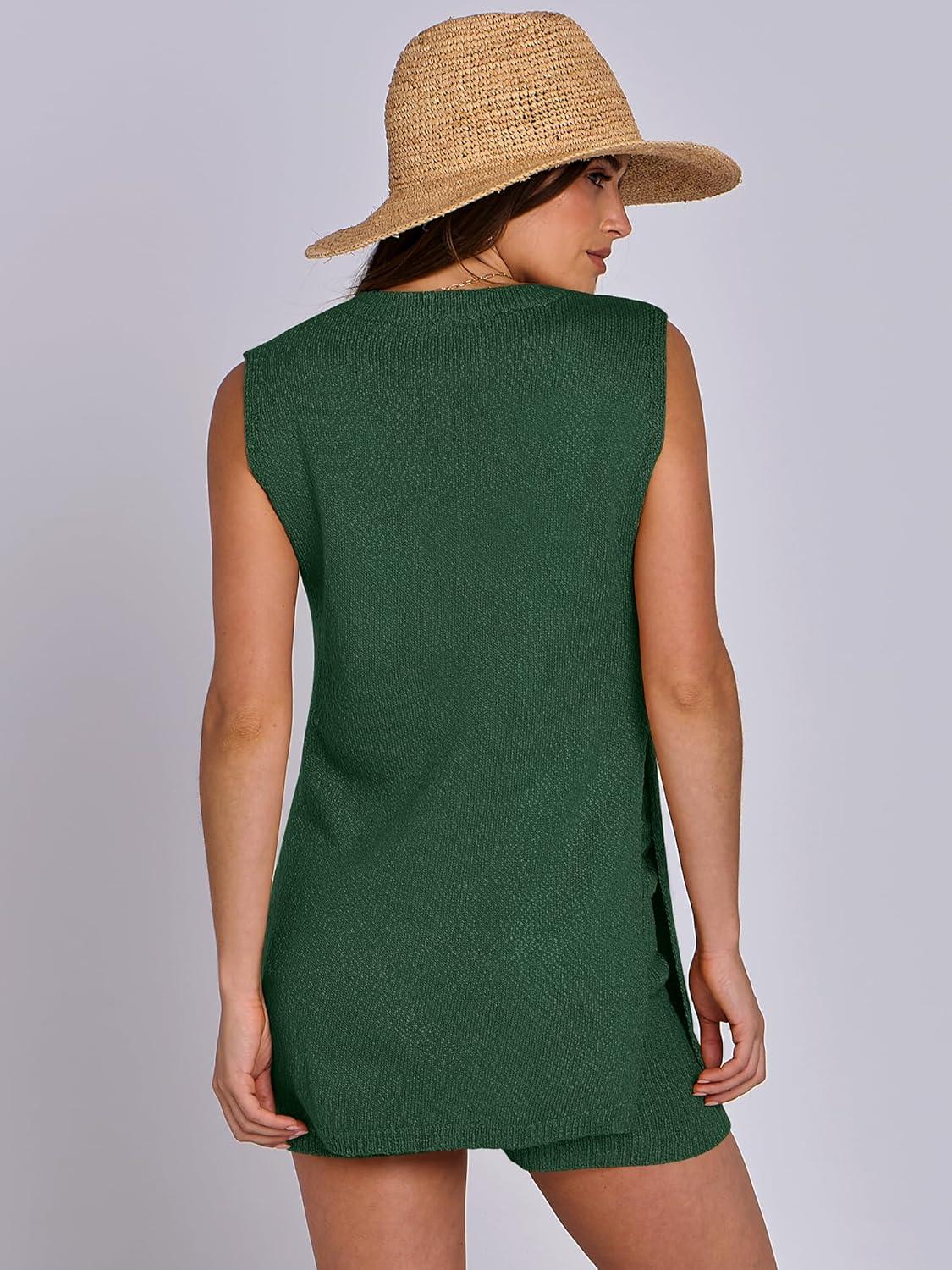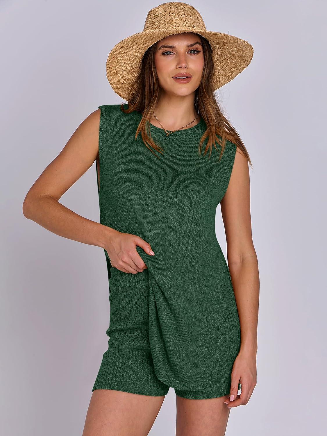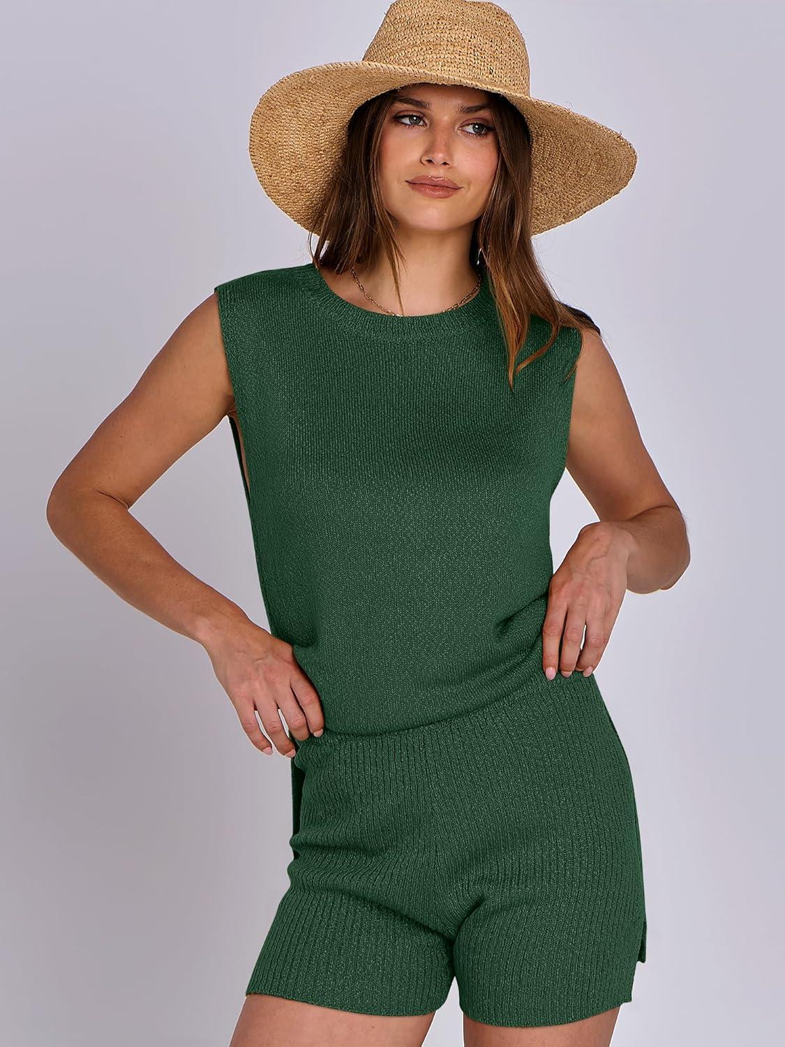 ANRABESS Women Summer 2 Piece Outfits Sleeveless Knit Sweater Top & Shorts Soft Lounge Sets Travel Beach 2025 Spring Clothes(Forest)