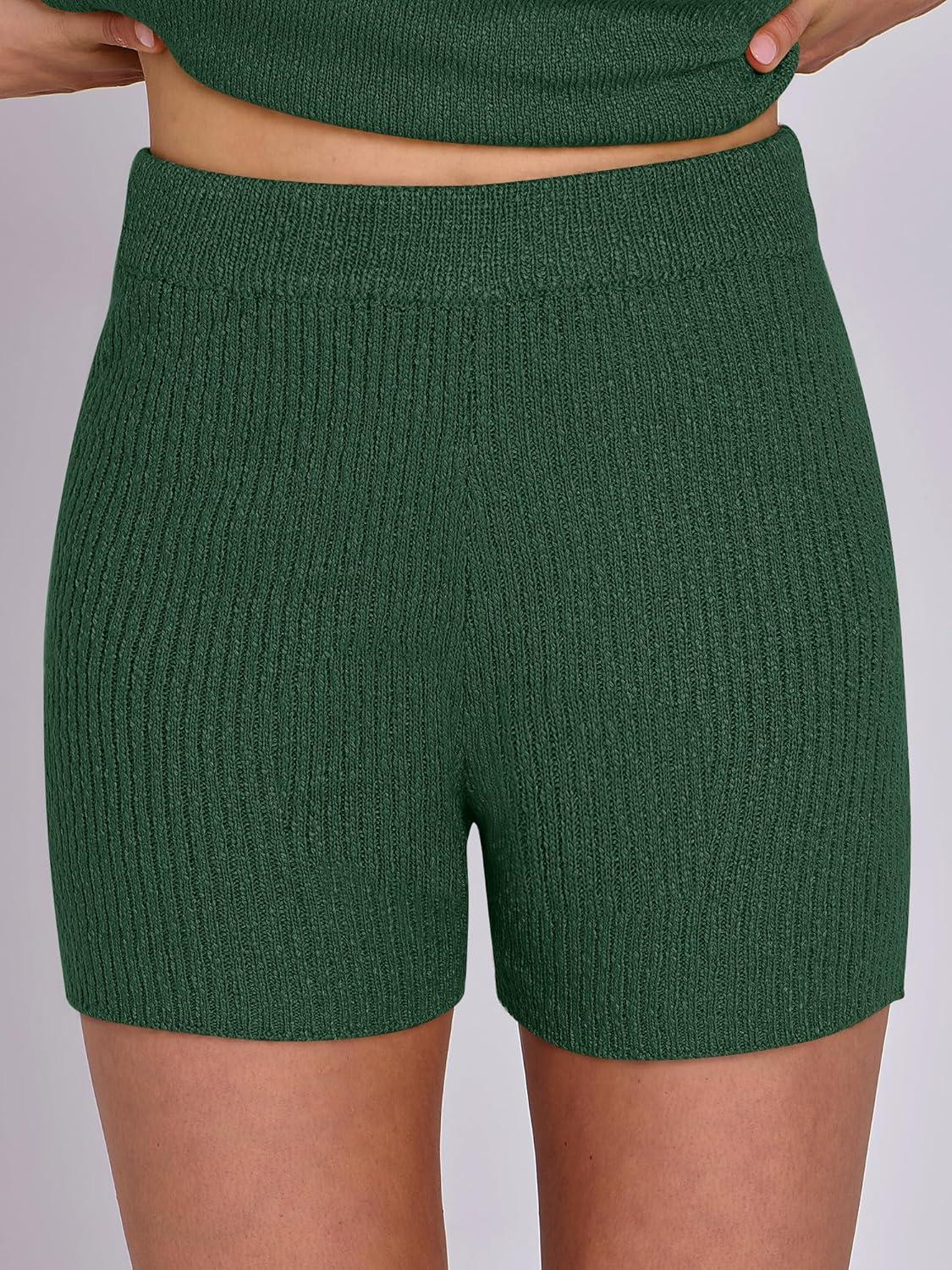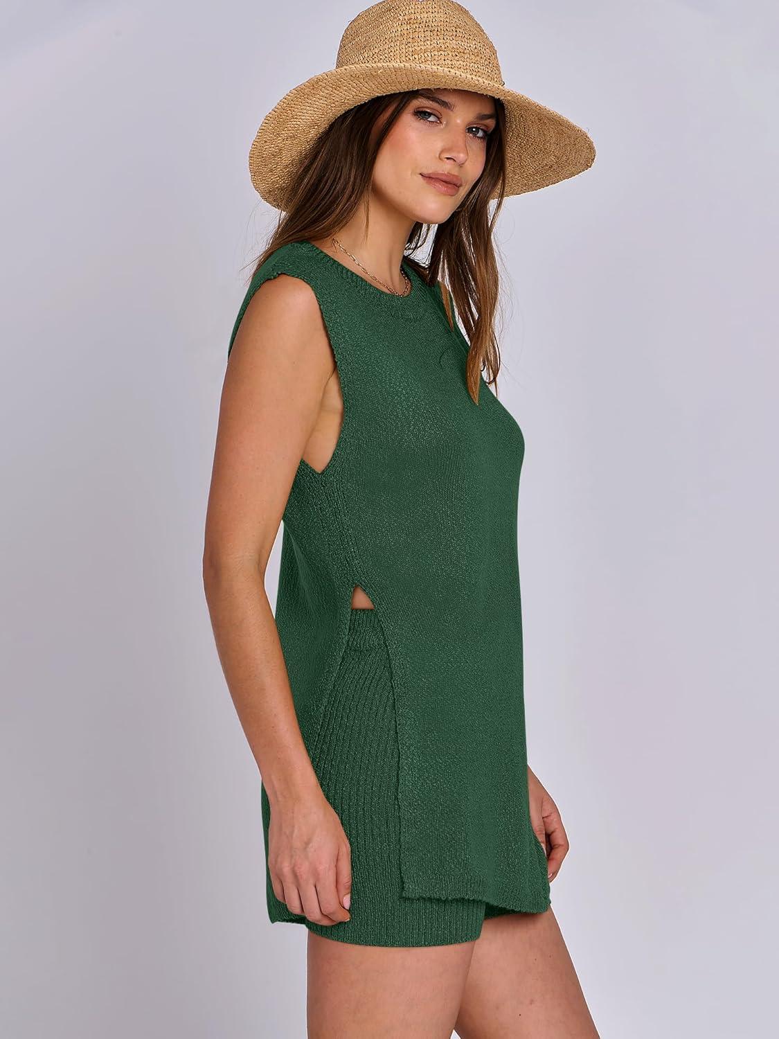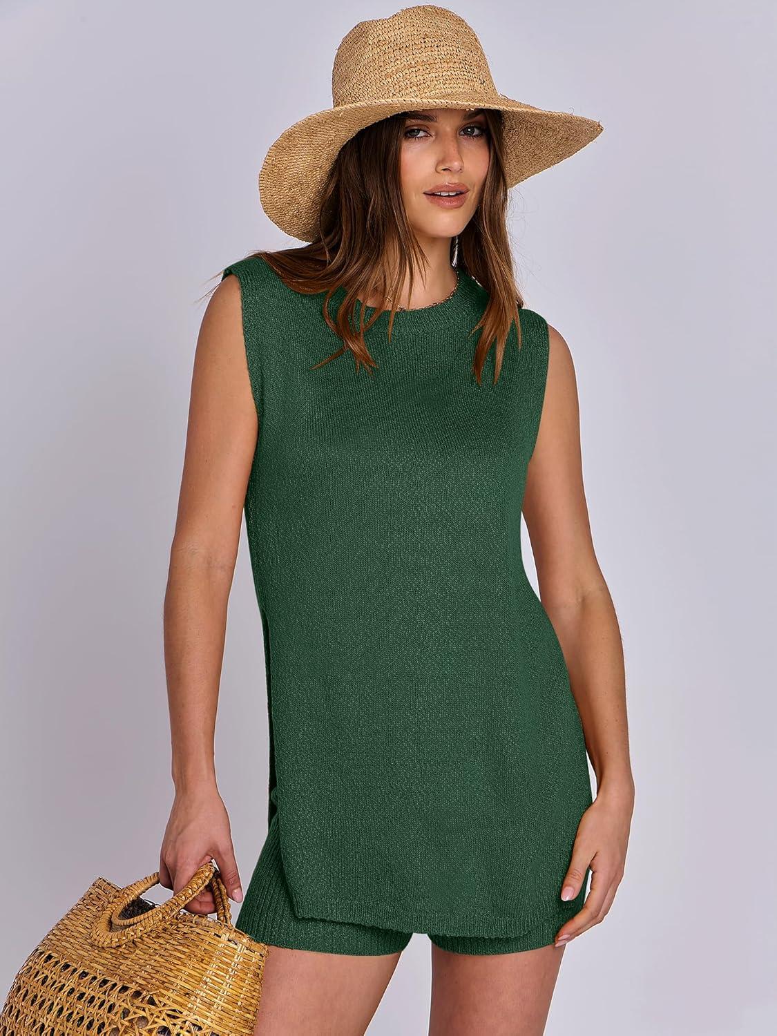 ANRABESS Women Summer 2 Piece Outfits Sleeveless Knit Sweater Top & Shorts Soft Lounge Sets Travel Beach 2025 Spring Clothes(Forest)