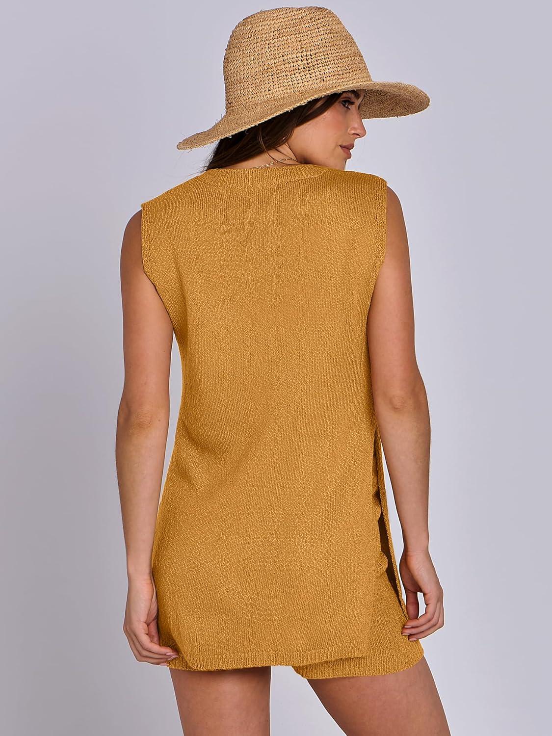 ANRABESS Women Summer 2 Piece Outfits Sleeveless Knit Sweater Top & Shorts Soft Lounge Sets Travel Beach 2025 Spring Clothes(Turmeric)