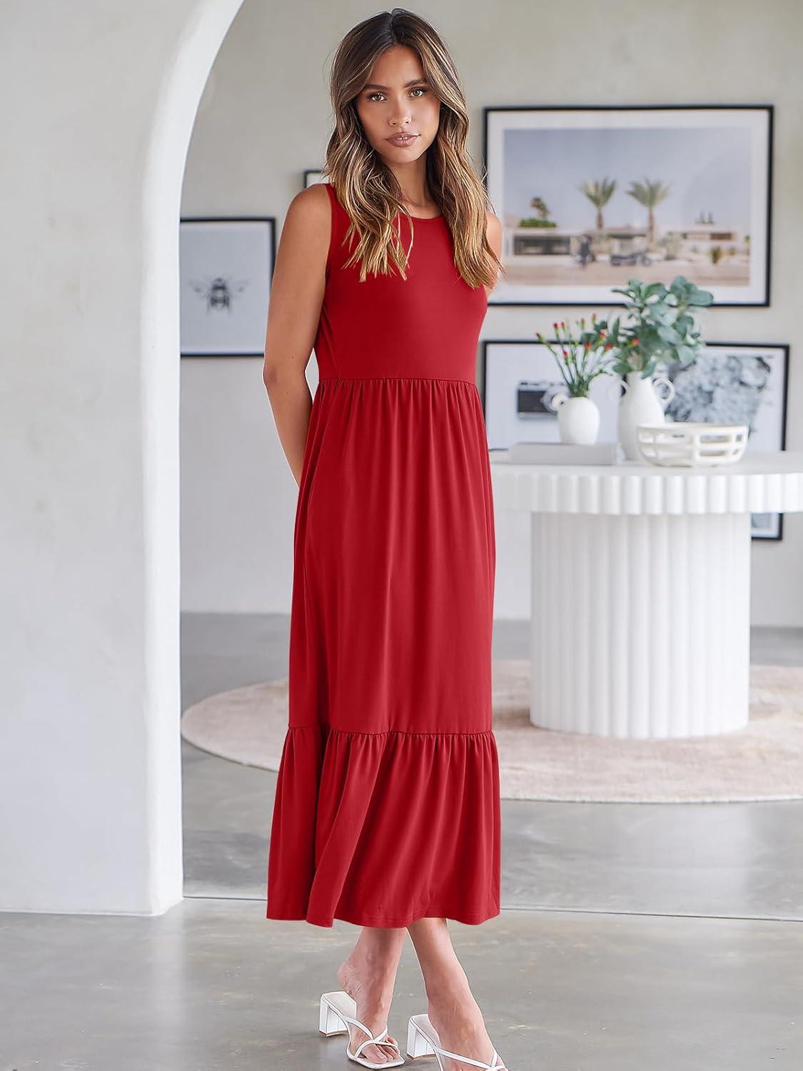 ANRABESS Women Summer Casual Sleeveless Crewneck Sundress Aline Flowy Tiered Maxi Long Beach Dress Vacation Outfits(Bright Red)
