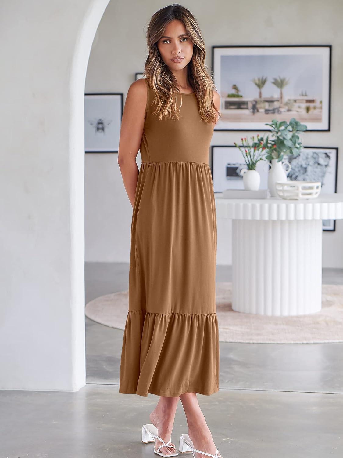 ANRABESS Women Summer Casual Sleeveless Crewneck Sundress Aline Flowy Tiered Maxi Long Beach Dress Vacation Outfits(Khaki)