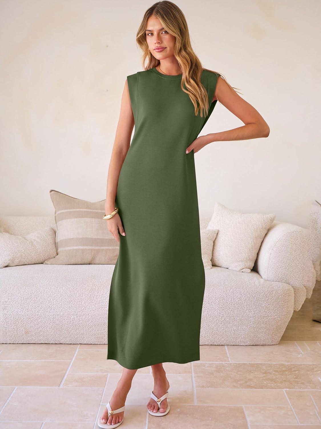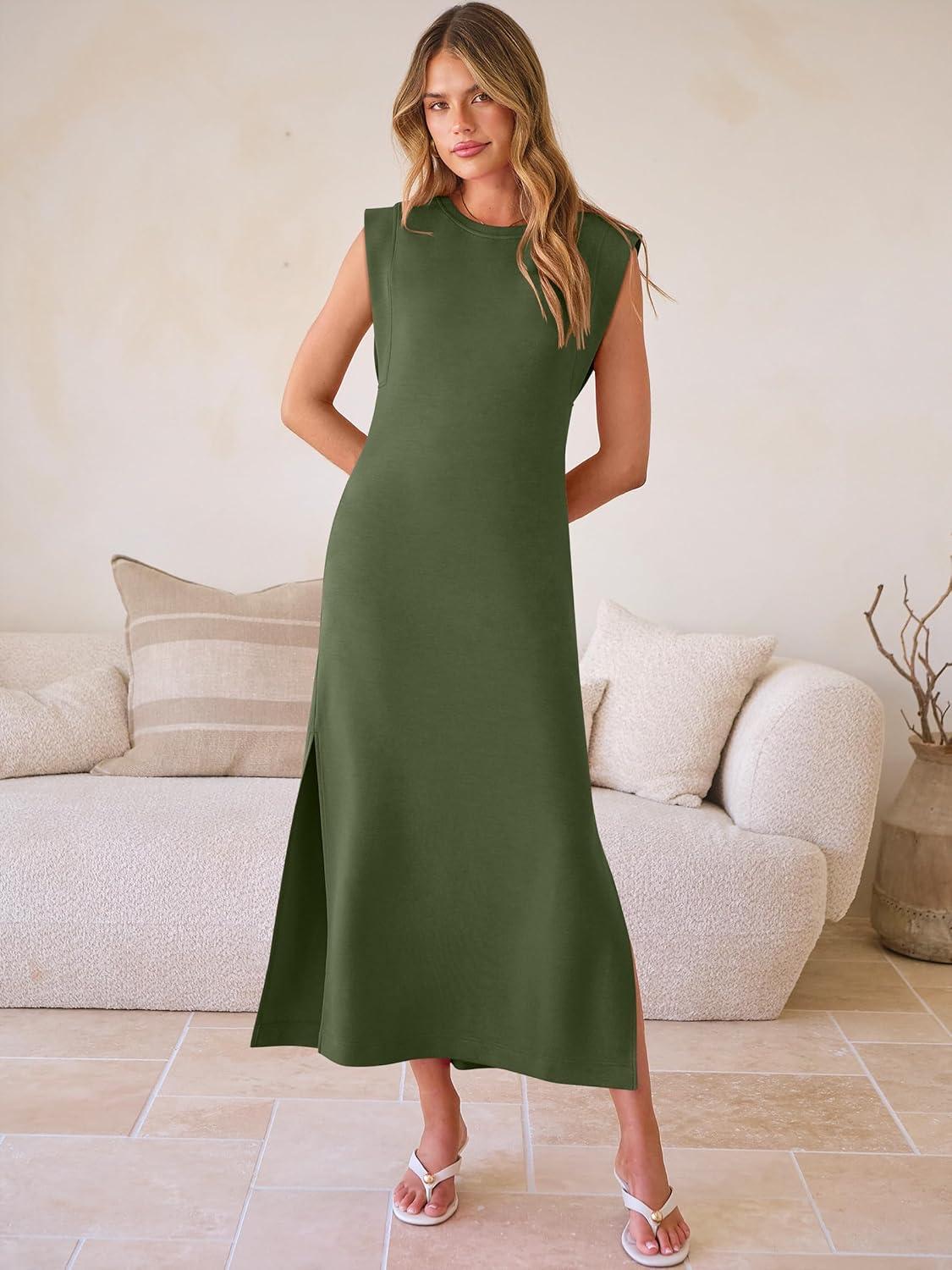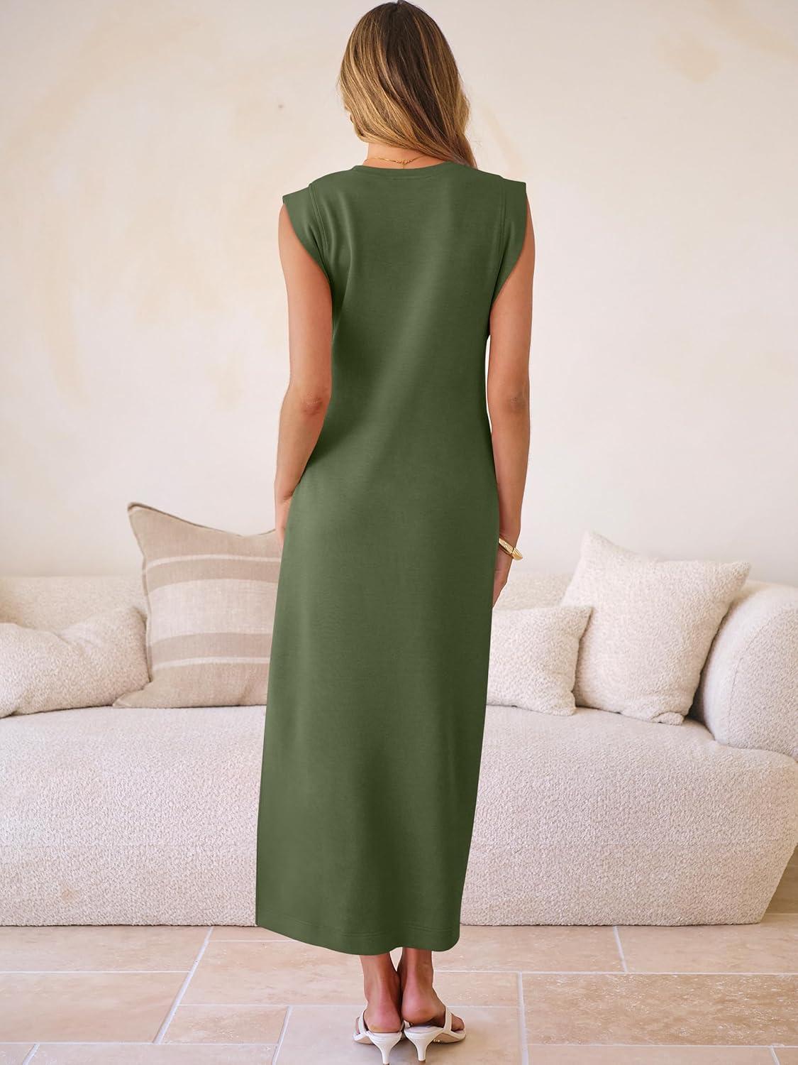 ANRABESS Women Summer Casual Sleeveless Maxi Dress 2026 Crewneck Loose Split Wrinkle-Free Beach Travel Vacation Long Sundress(Army Green)