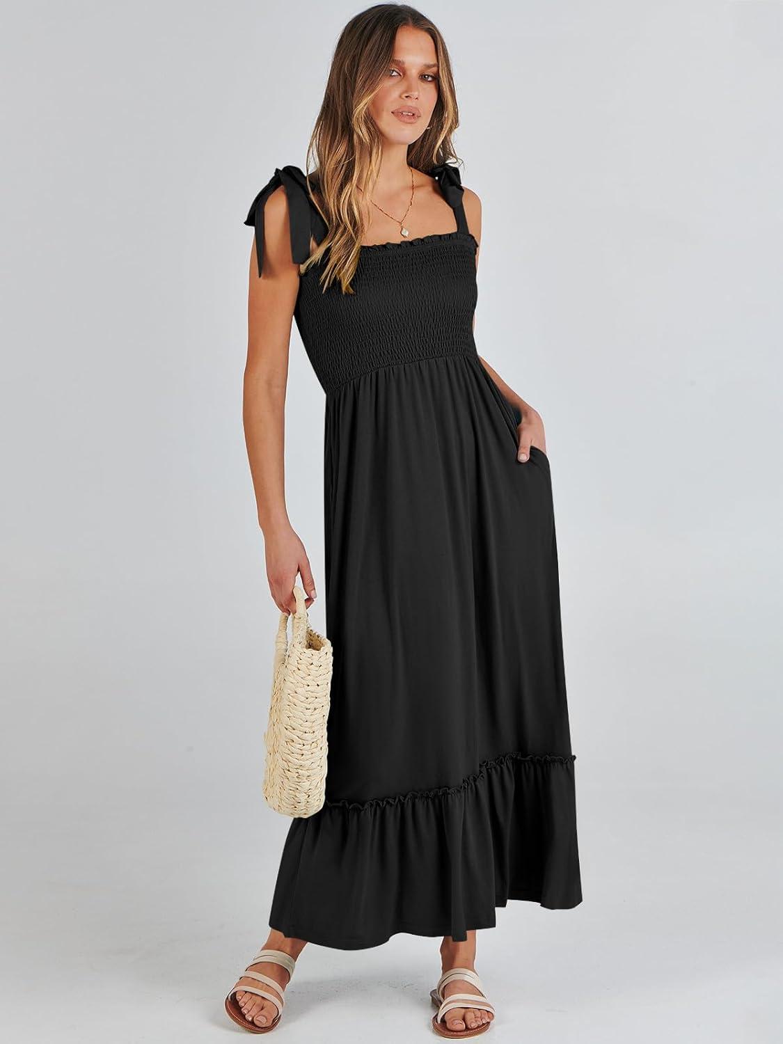 ANRABESS Women Summer Casual Strap Smocked Maxi Flowy Tiered A Line Beach Travel Sundress Wedding Guest Outfits(Black)