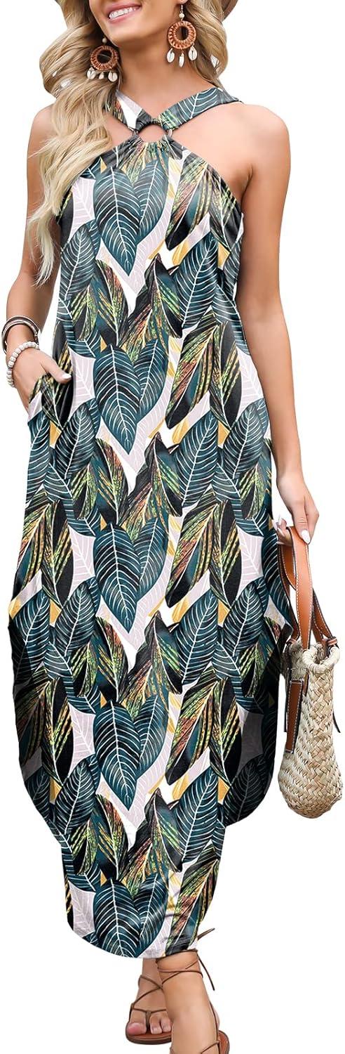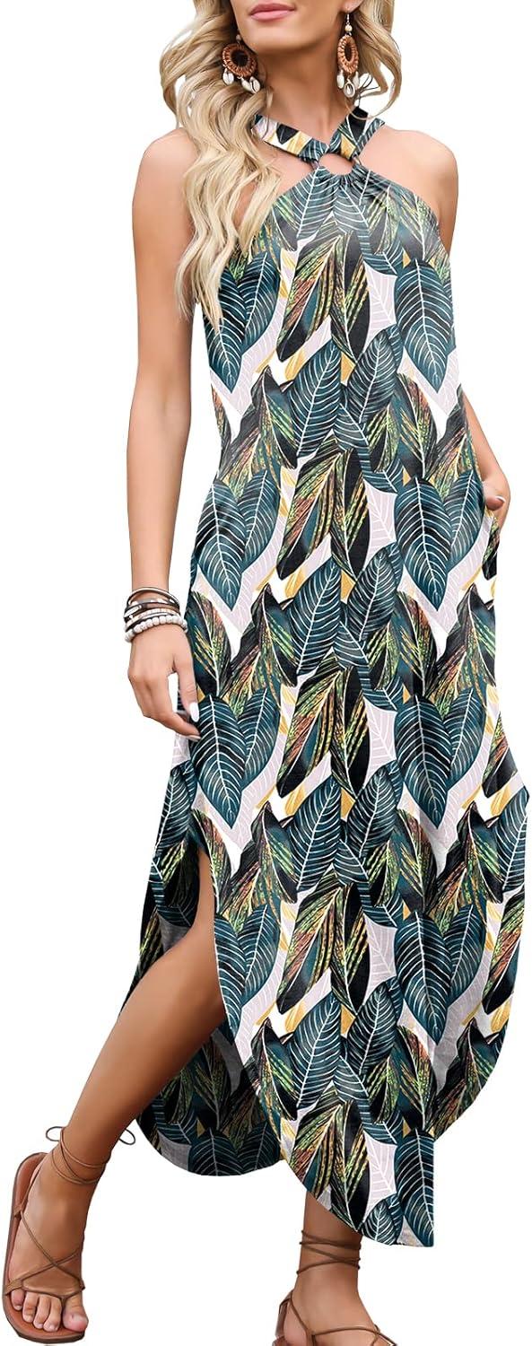ANRABESS Women Summer Halter Neck Sundress Sleeveless Split Side Casual Beach Travel Vacation Maxi Long Dress with Pockets(Leaf)