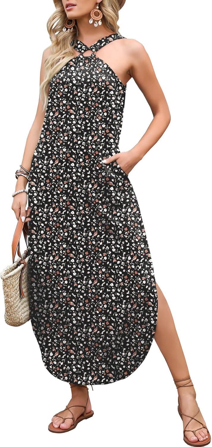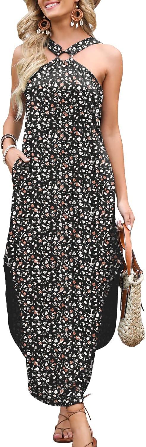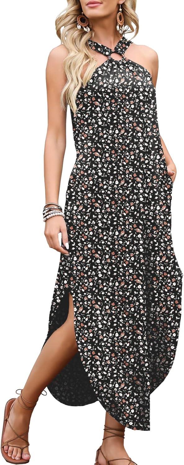 ANRABESS Women Summer Halter Neck Sundress Sleeveless Split Side Casual Beach Travel Vacation Maxi Long Dress with Pockets(Print Black 01)