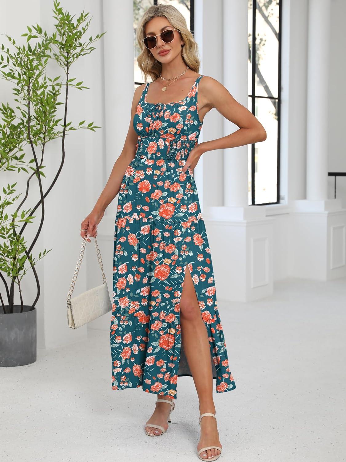 ANRABESS Women Summer Maxi Dress 2025 Square Neck Sleeveless Casual Boho Floral High Waist Slit Travel Vacation Sundress(Floral Teal)