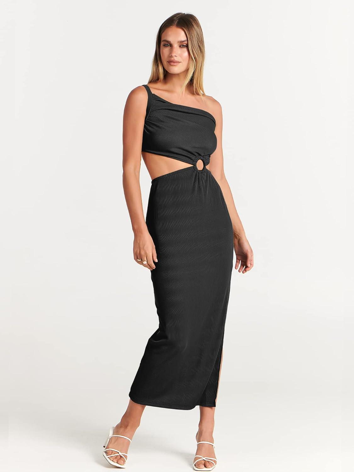 ANRABESS Women Summer One Shoulder Sleeveless Maxi Dress Cutout Sexy Bodycon Semi Formal Dinner Date Vacation Dresses(Black)