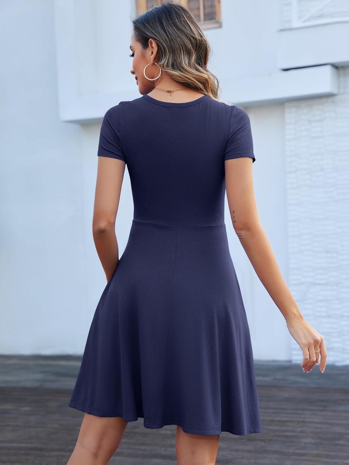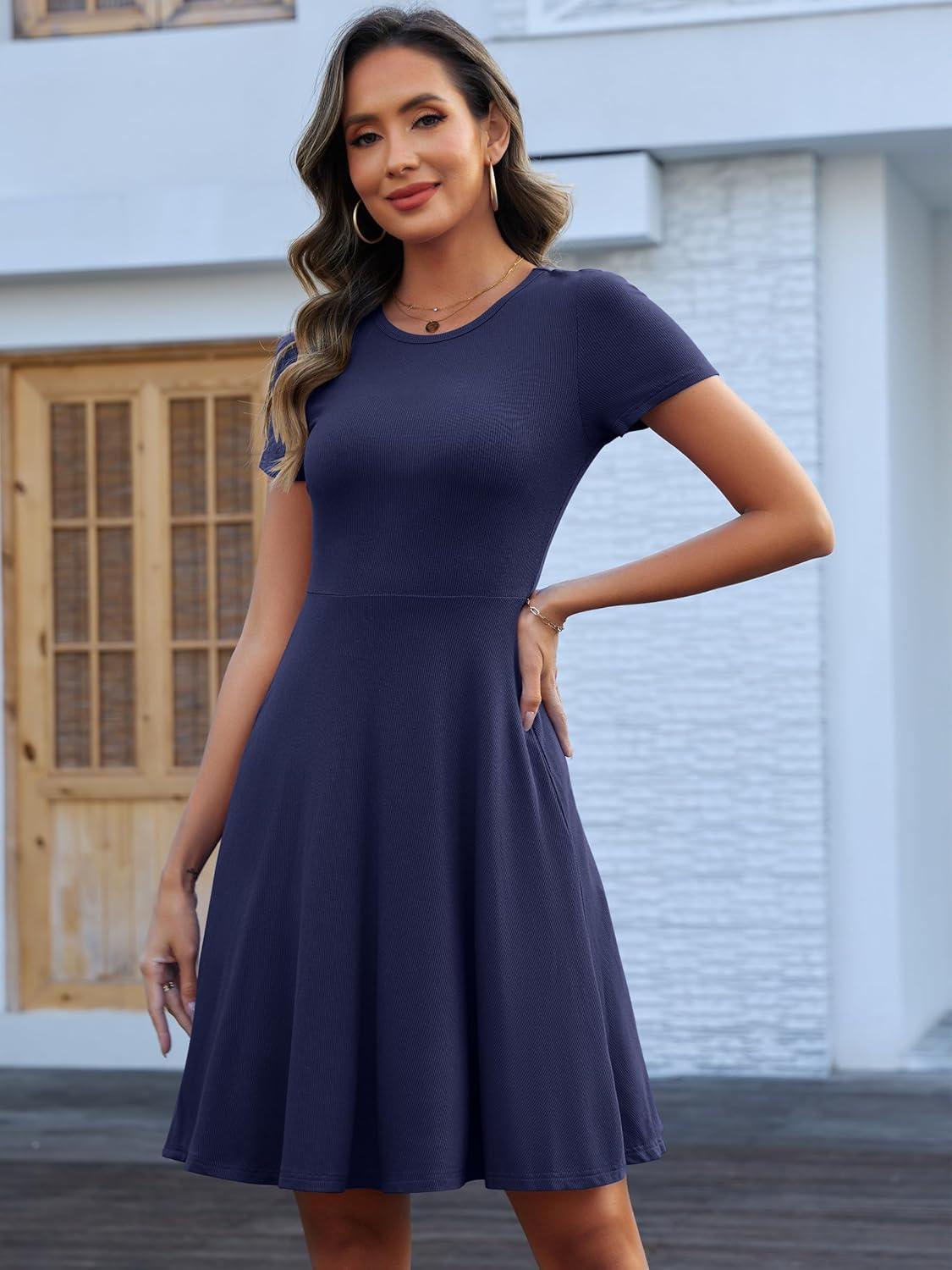 ANRABESS Women Summer Short Sleeve Ribbed Knit Fit & Flare A-Line Flowy Business Casual Work Basic Mini Dress with Pockets(Navy Blue)