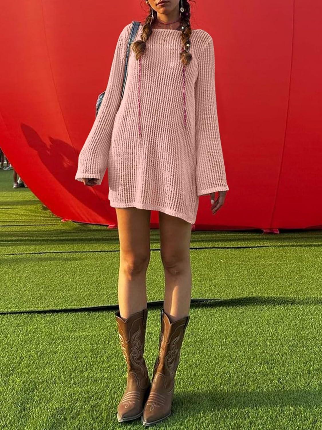 ANRABESS Women Swimsuit Swim Coverup 2025 Long Sleeve Mini Crochet Pool Bathing Suit Swimwear Mesh Knit Beach Vacation Dress(Nude Pink)
