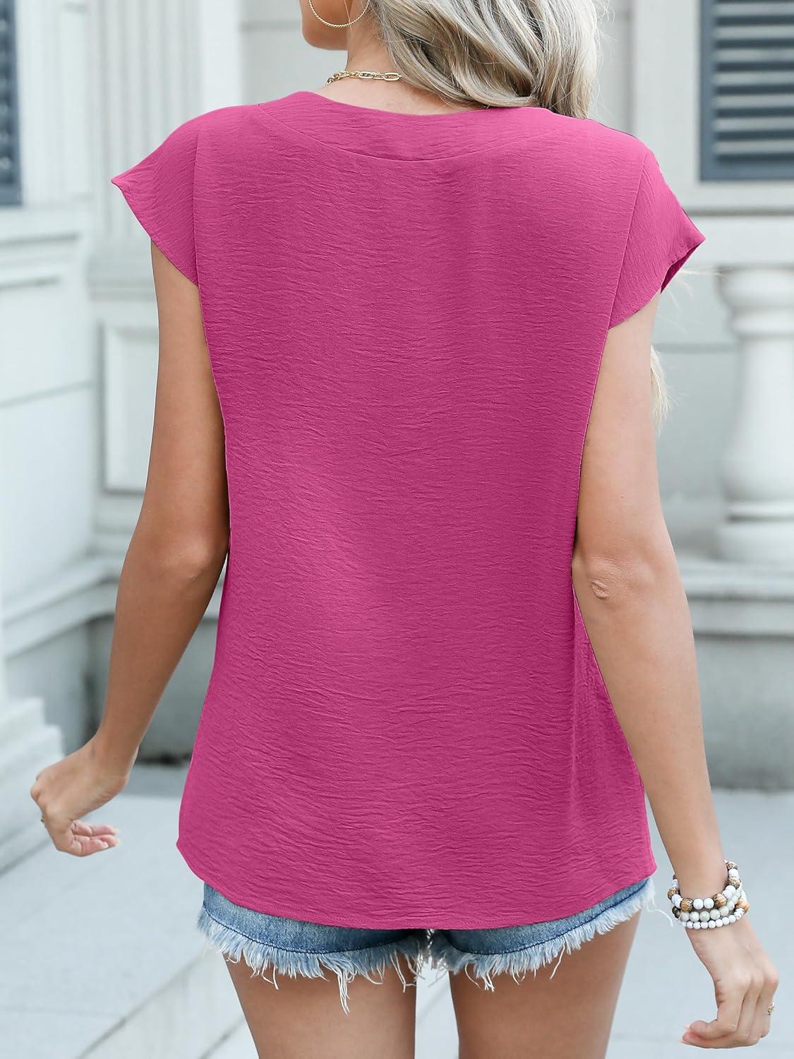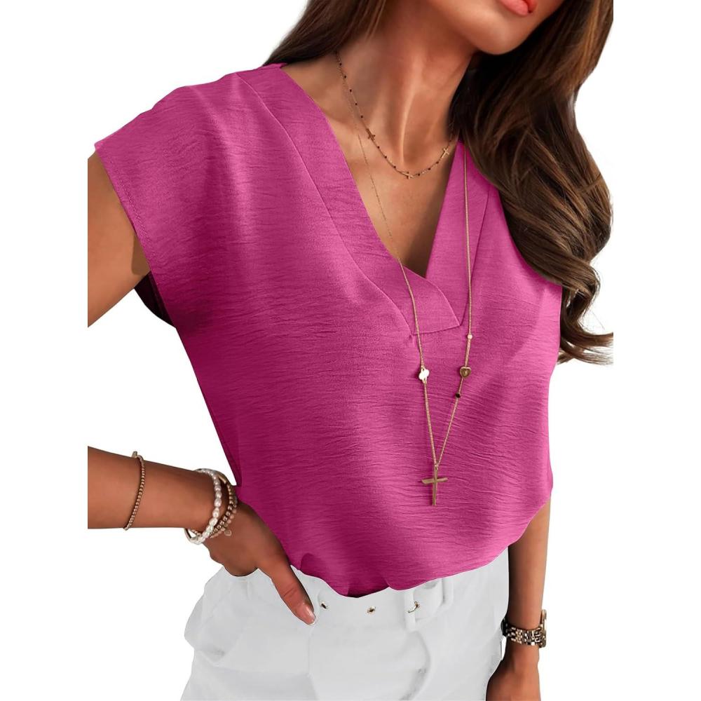 ANRABESS Women Tops Cap Sleeve Textured Dressy Casual V Neck Shirts 2025 Summer Business Work Blouses Outfits(Hot Pink)