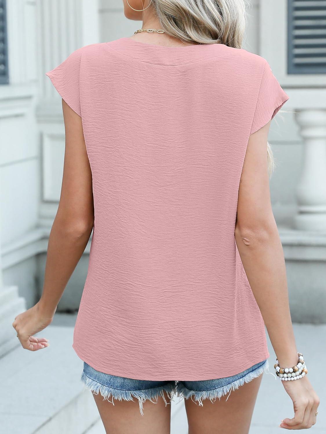 ANRABESS Women Tops Cap Sleeve Textured Dressy Casual V Neck Shirts 2025 Summer Business Work Blouses Outfits(Light Pink)