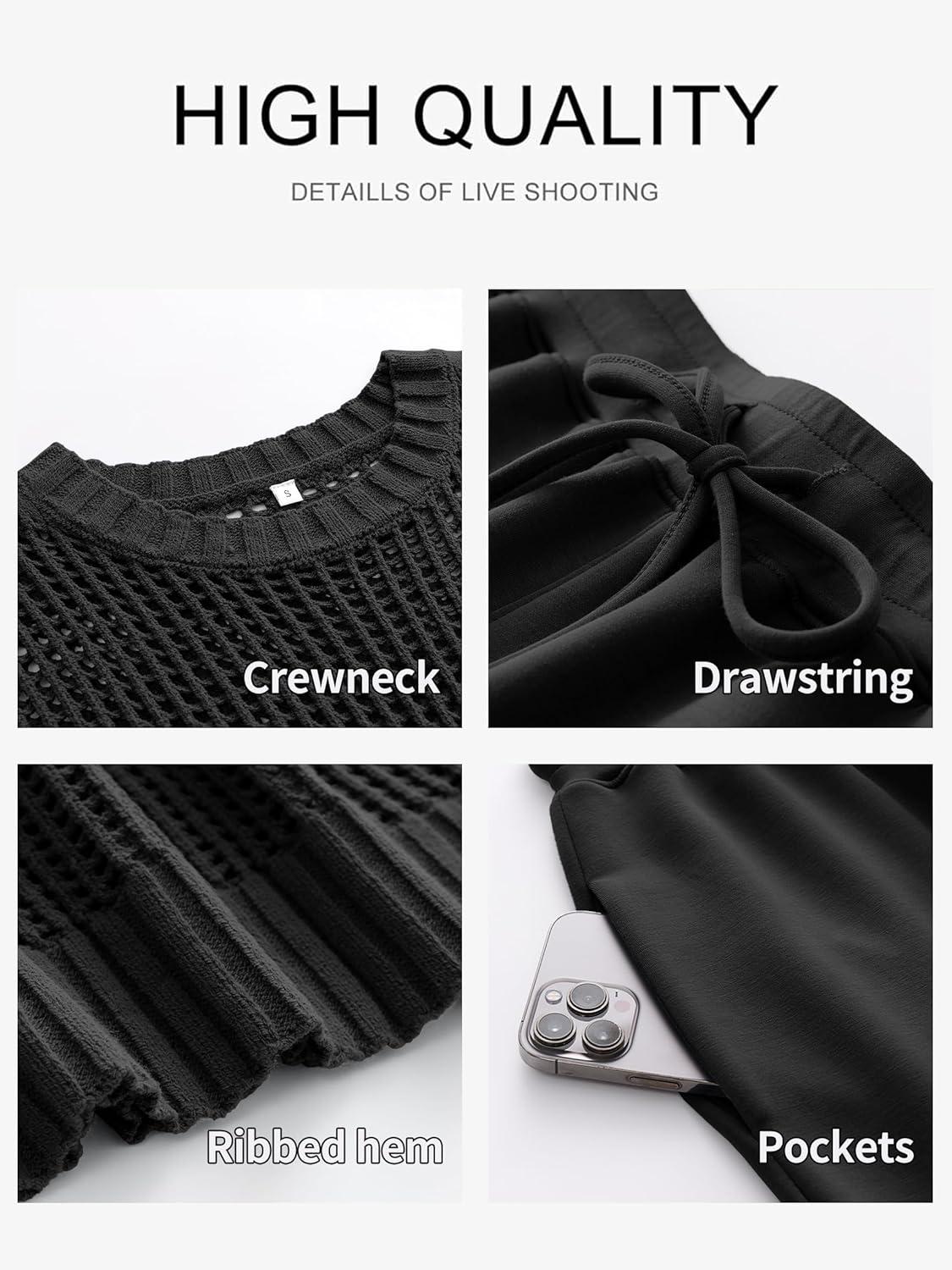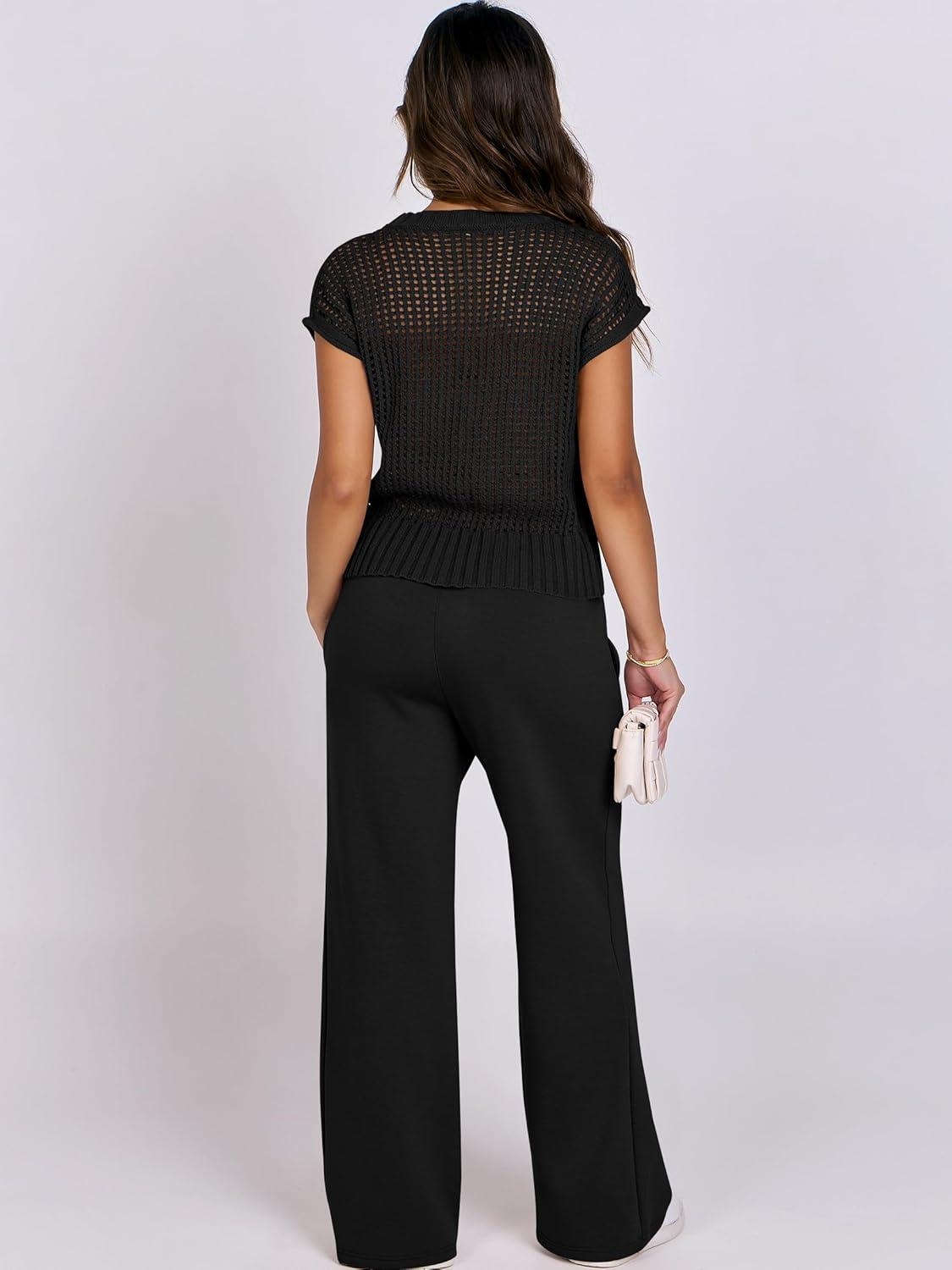 ANRABESS Women Two Piece Outfits Crochet Sheer Knit Sweater Top Wide Leg Pants Lounge Matching Sets Sweatsuit Travel Clothes(Black)