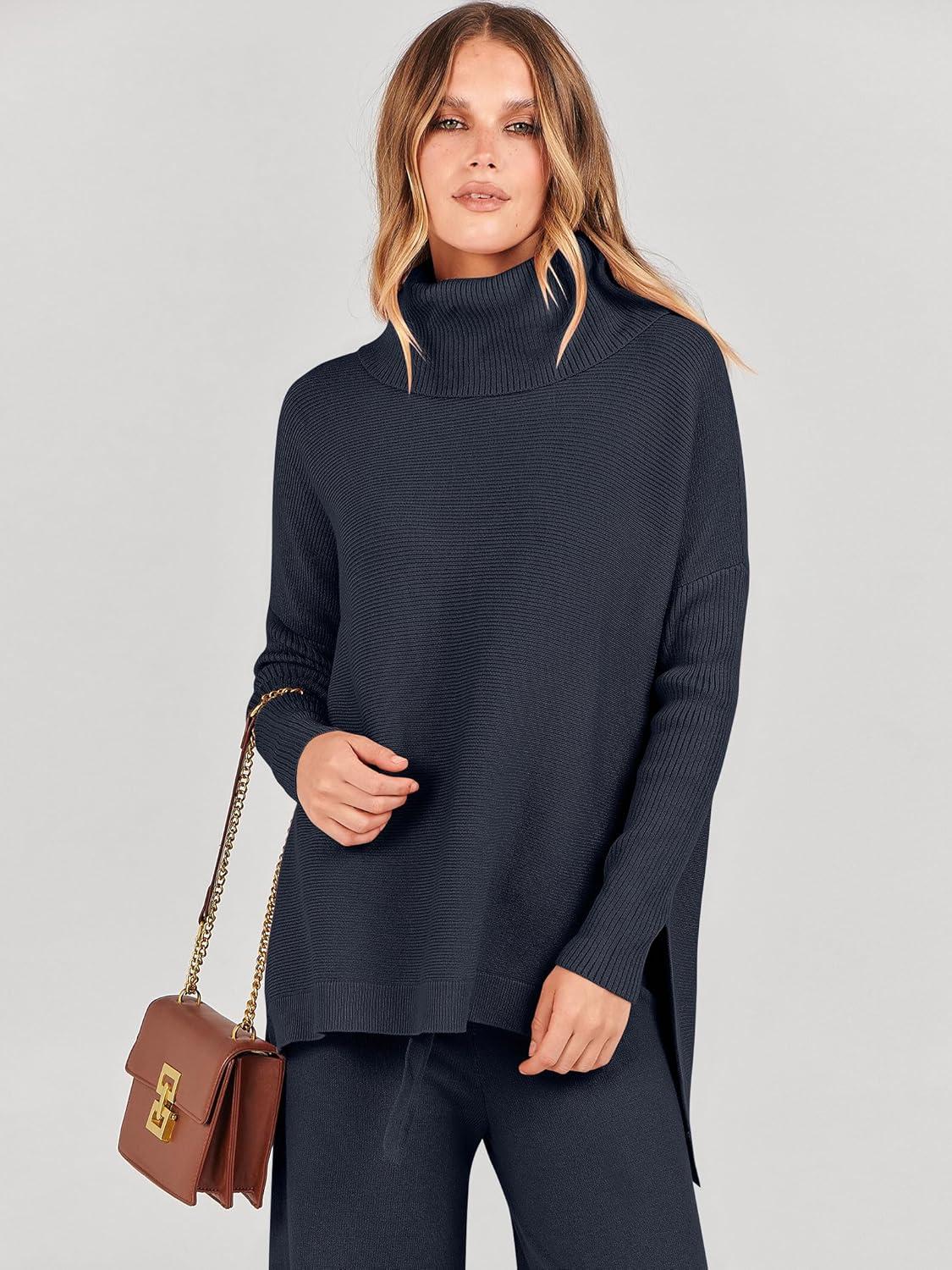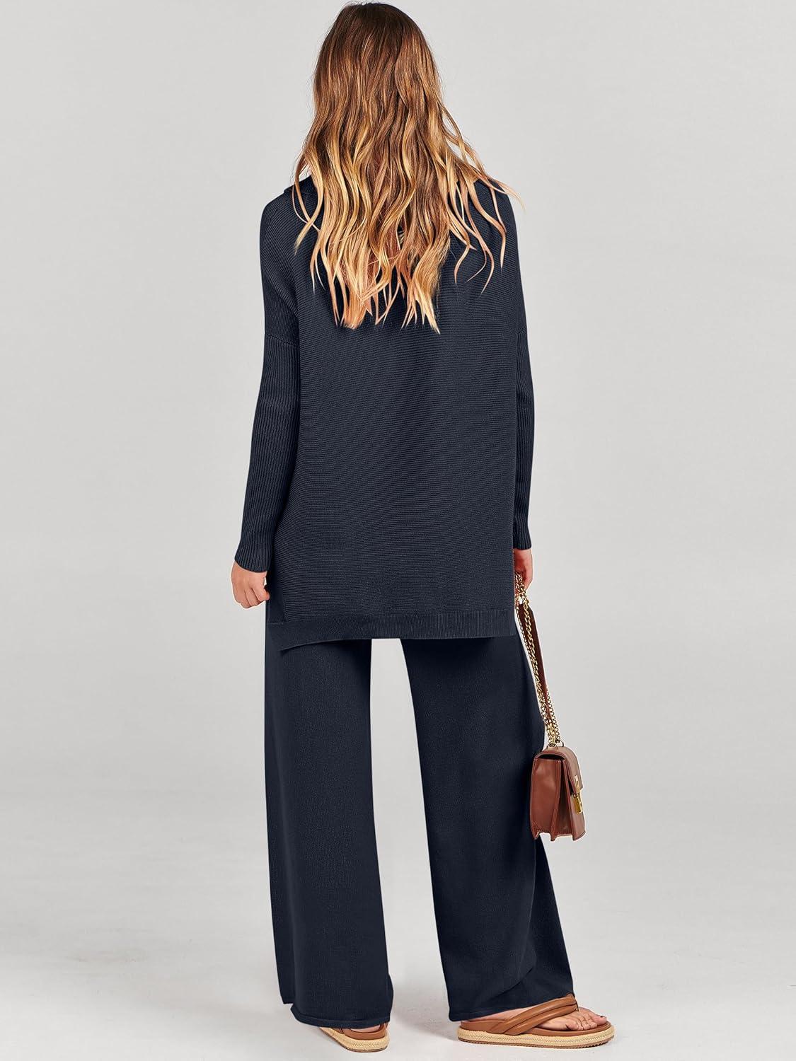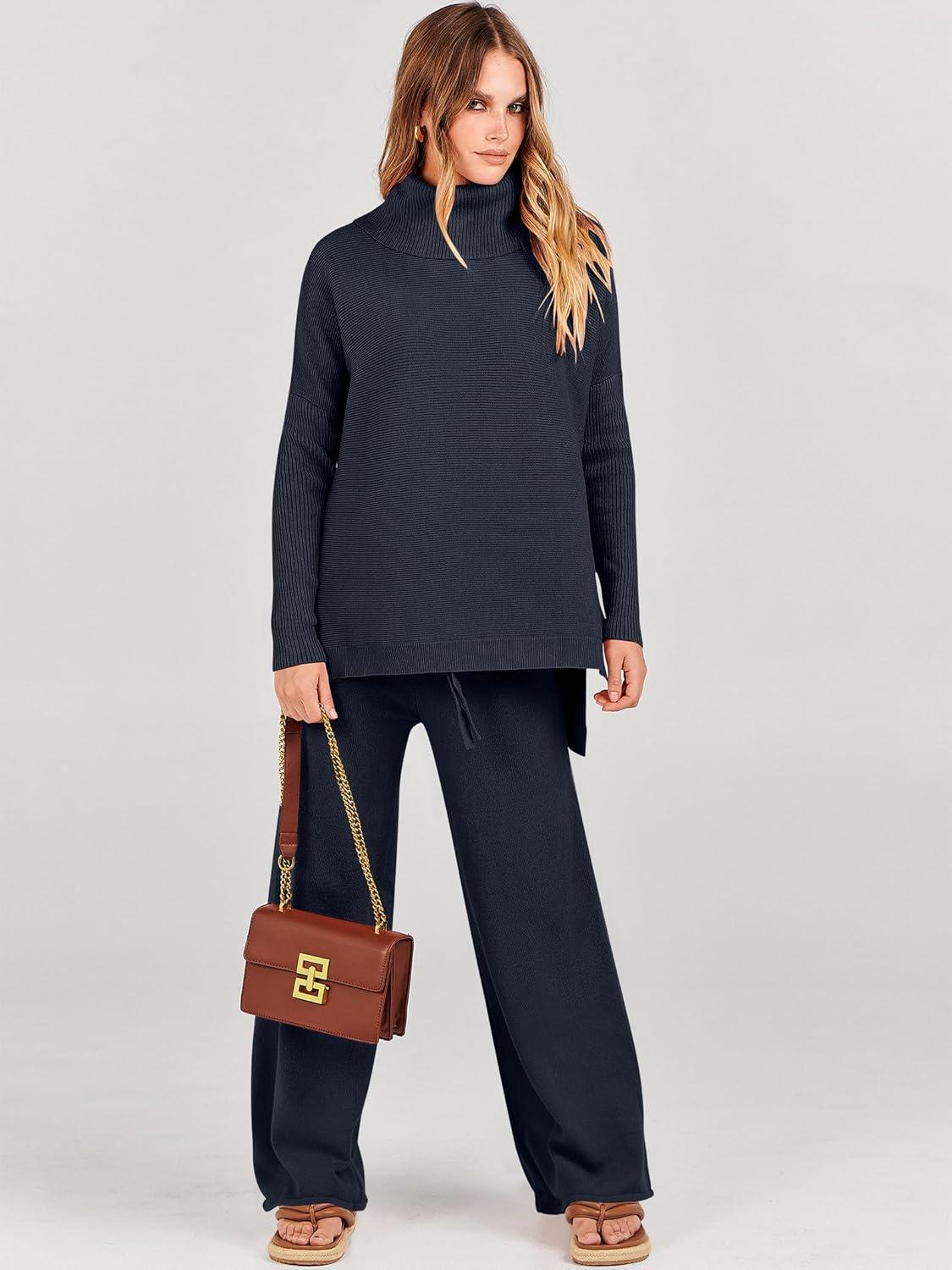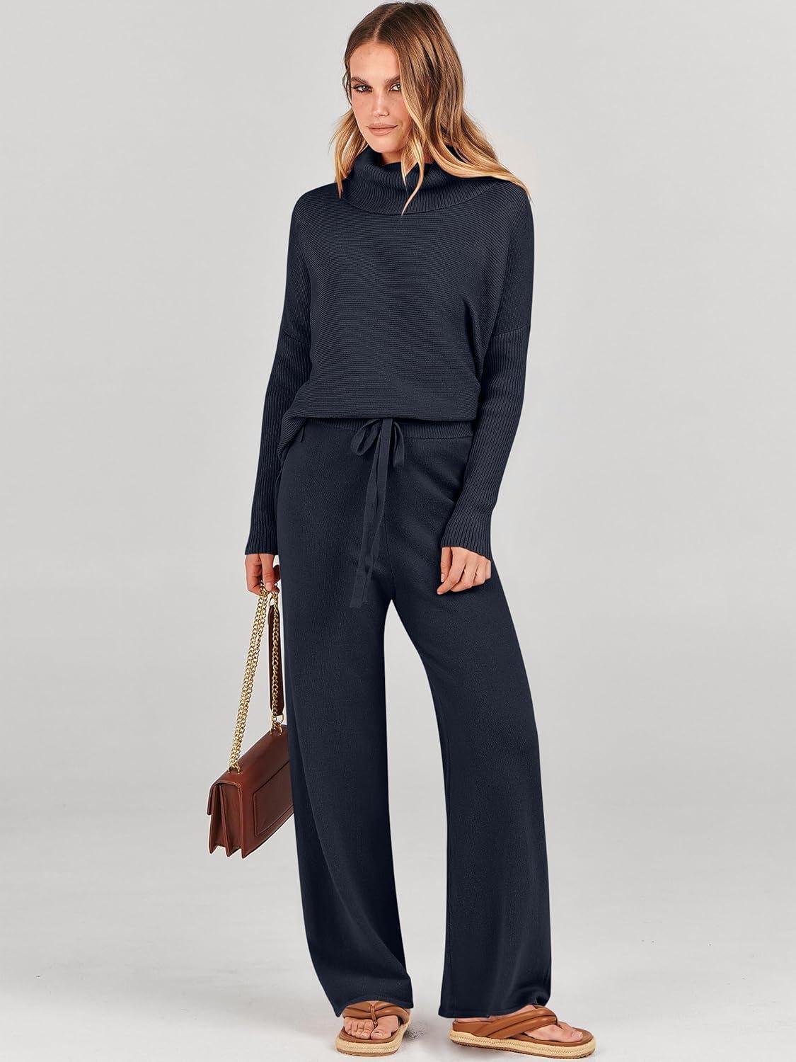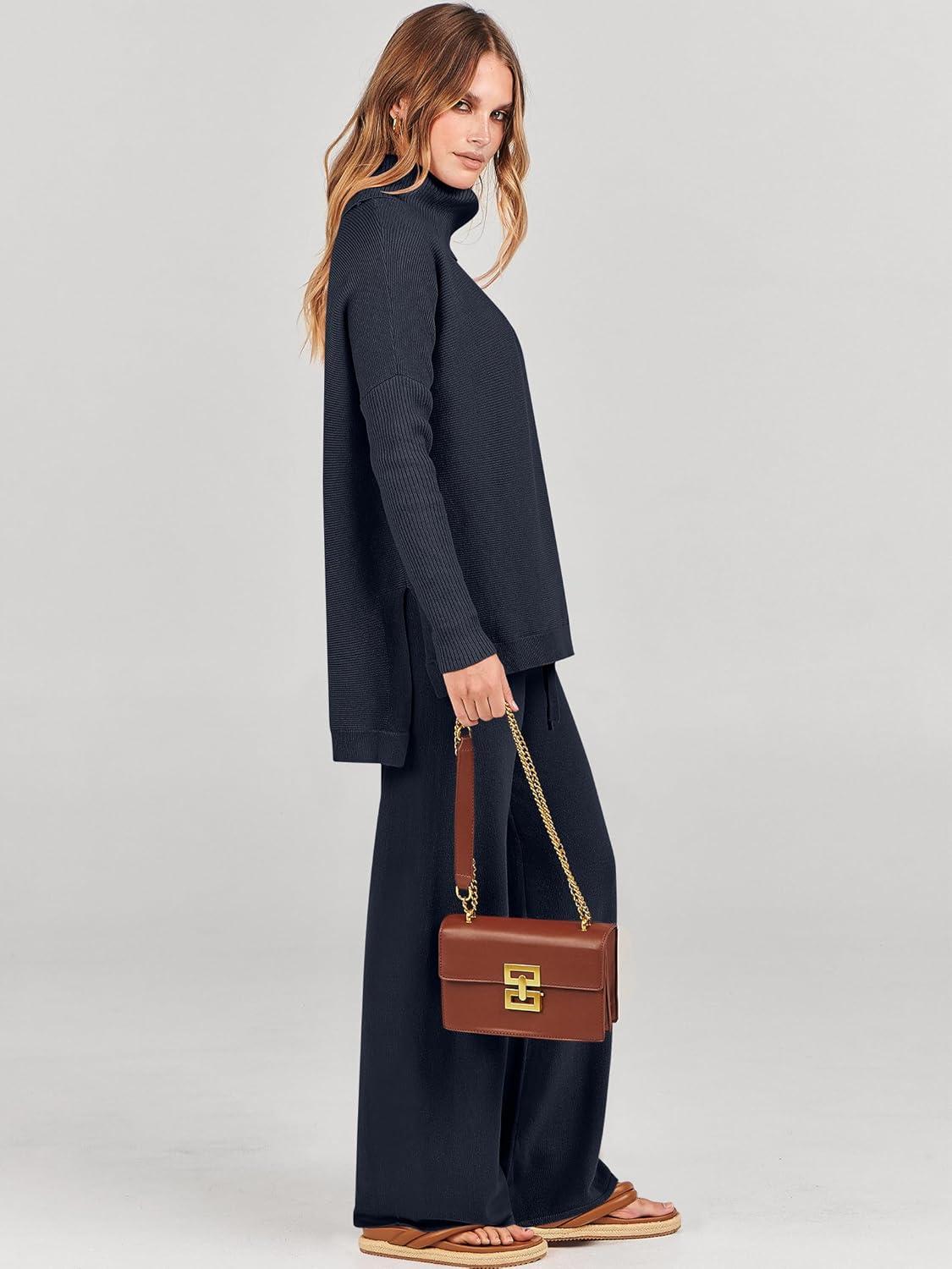 ANRABESS Women Two Piece Outfits Oversized Turtleneck Knit Pullover Sweater Top Wide Leg Pants Lounge Set Sweatsuit 2025 Fall(Navy Blue)