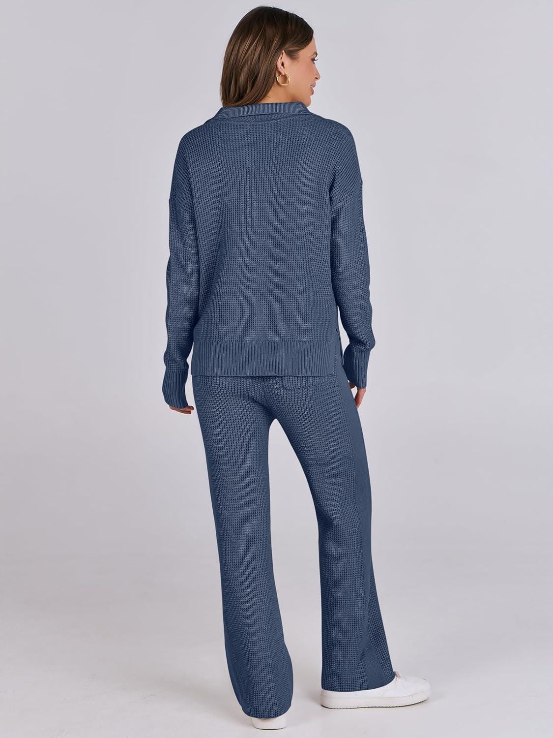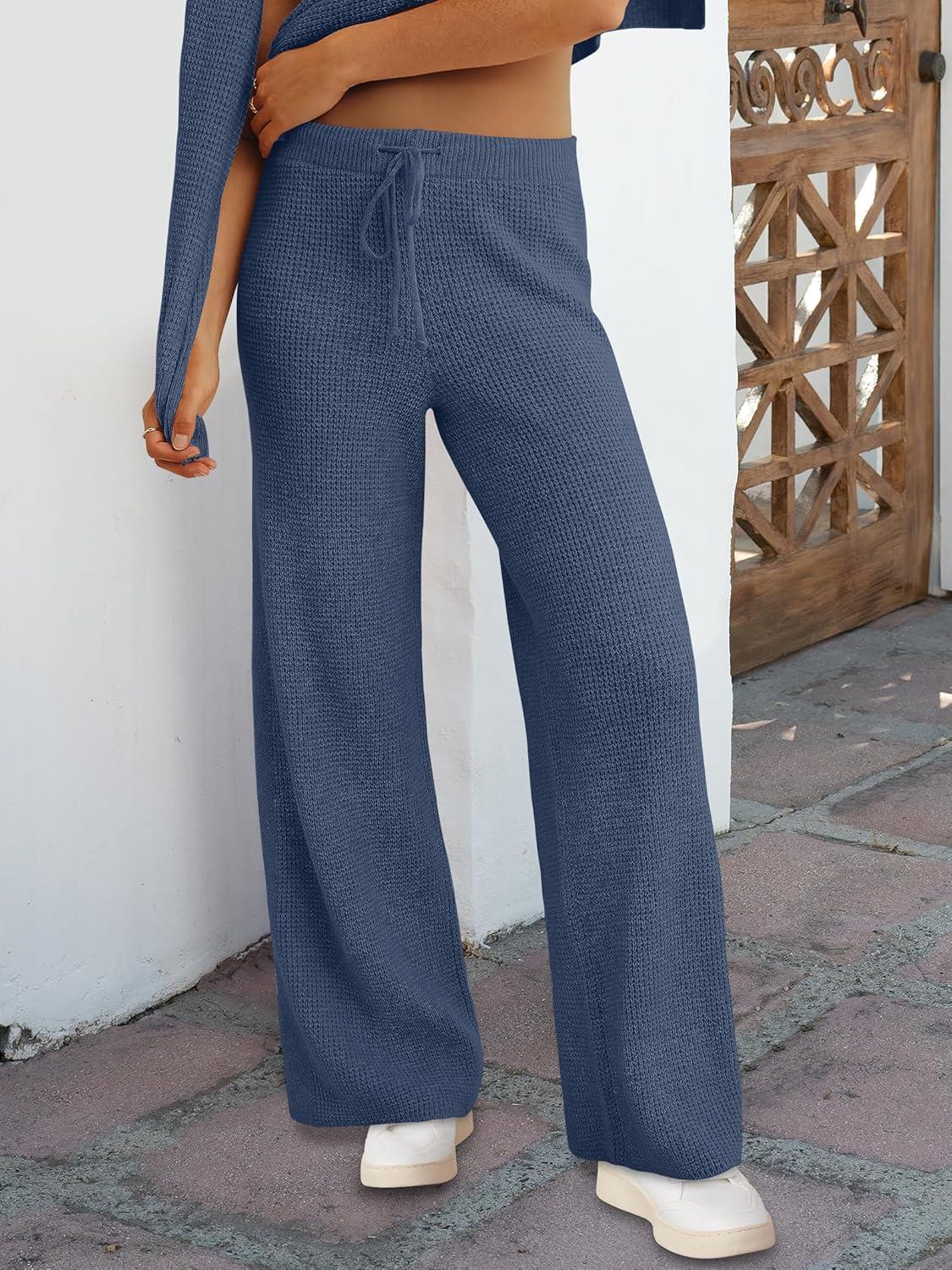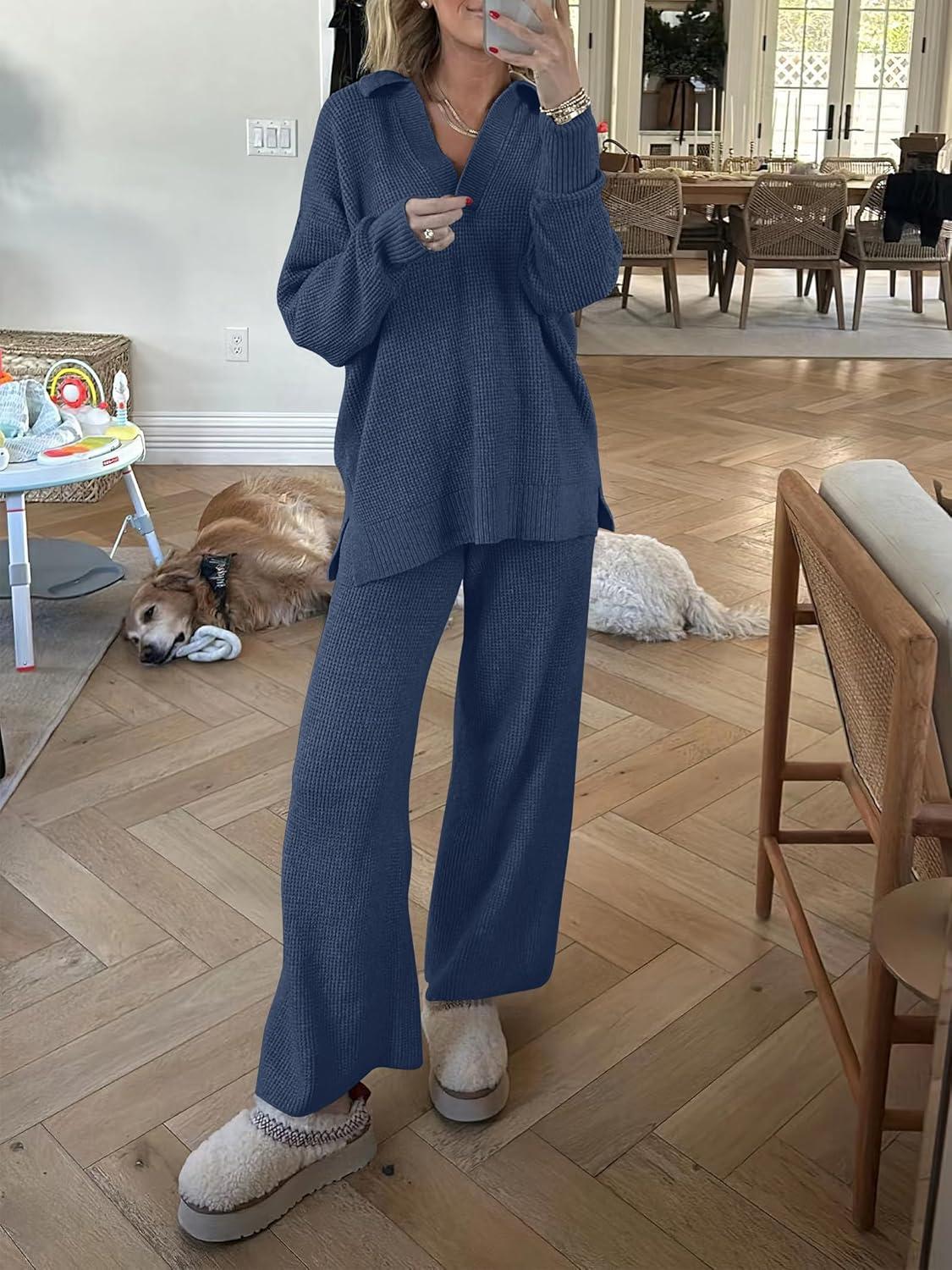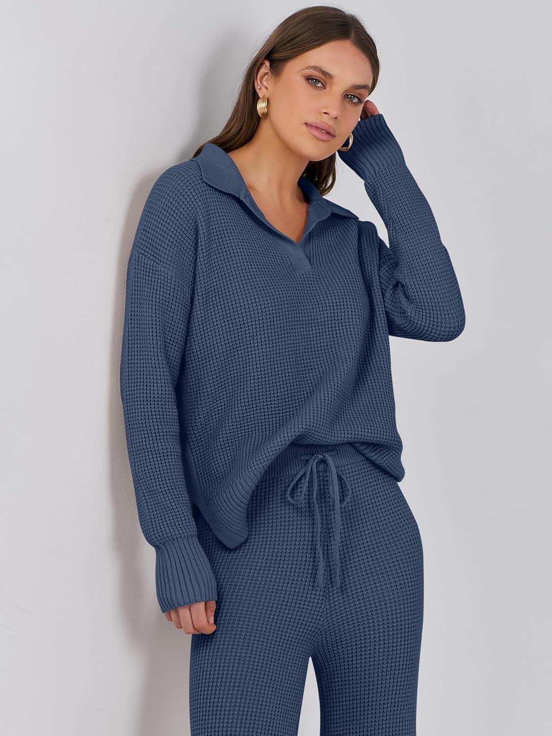 ANRABESS Women Two Piece Outfits Sweater Sets Lounge Waffle Knit Pullover Matching Wide Leg Pants Tracksuit 2025 Fall Fashion(Deep Blue)
