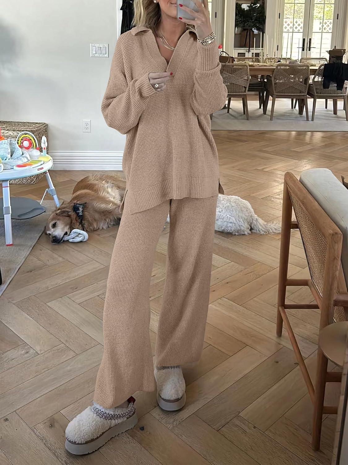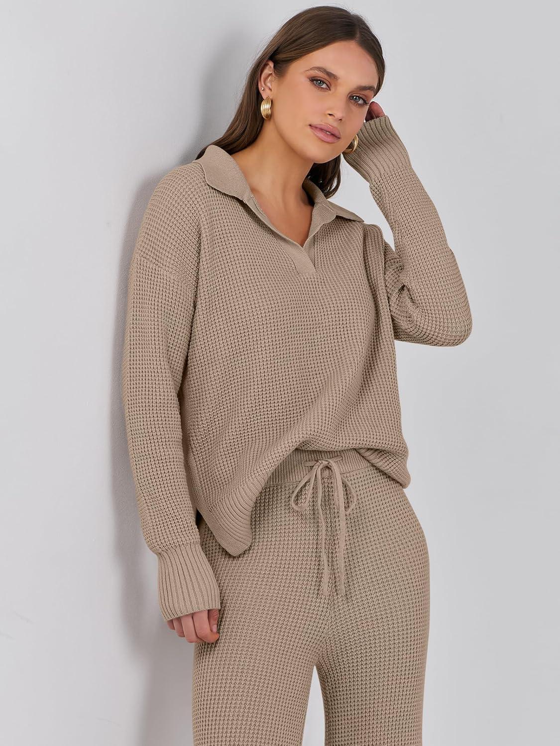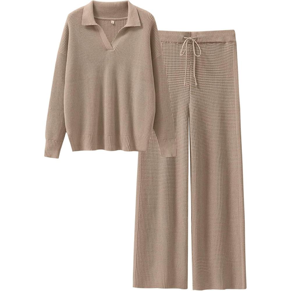 ANRABESS Women Two Piece Outfits Sweater Sets Lounge Waffle Knit Pullover Matching Wide Leg Pants Tracksuit 2025 Fall Fashion(Khaki)