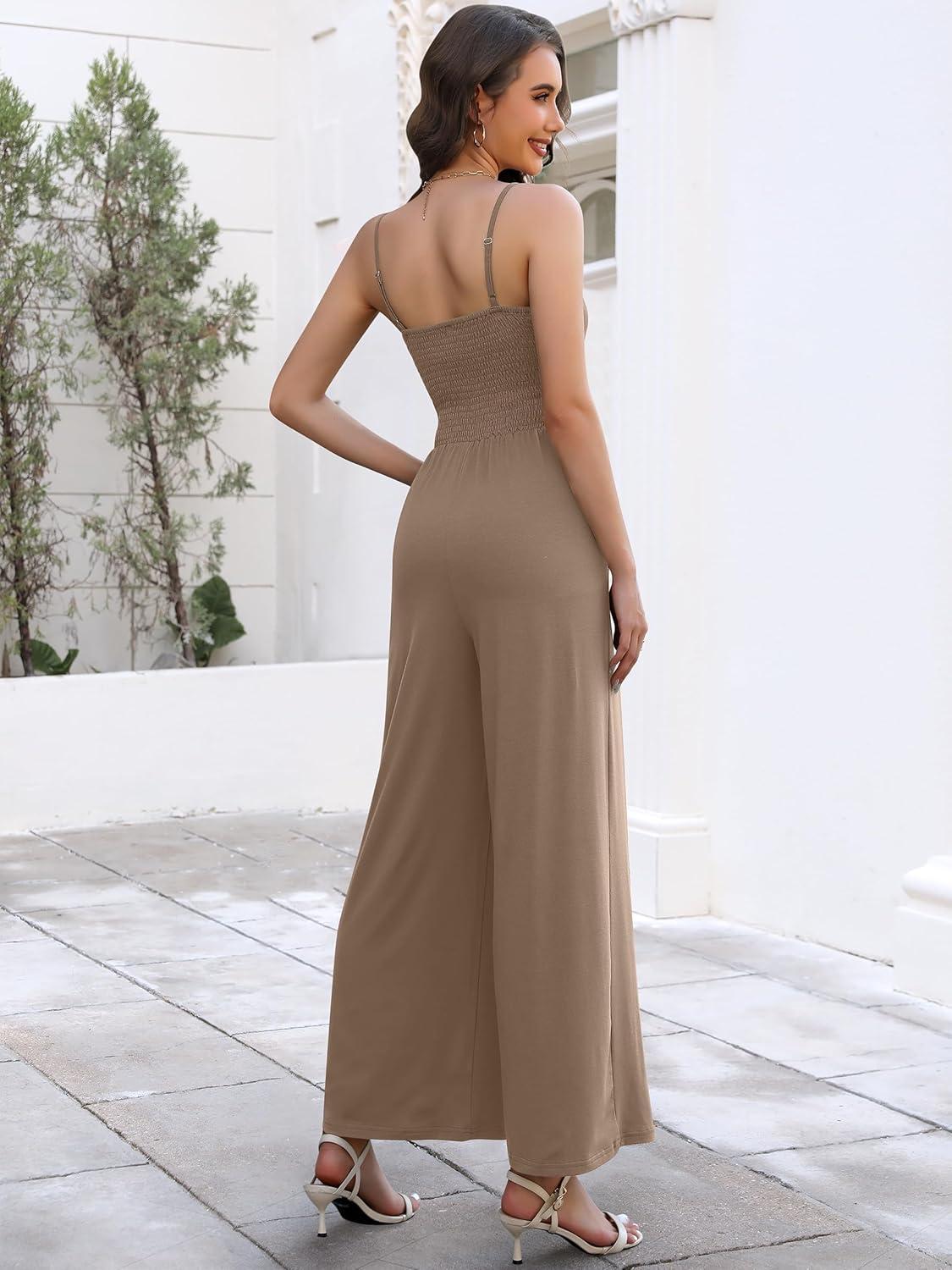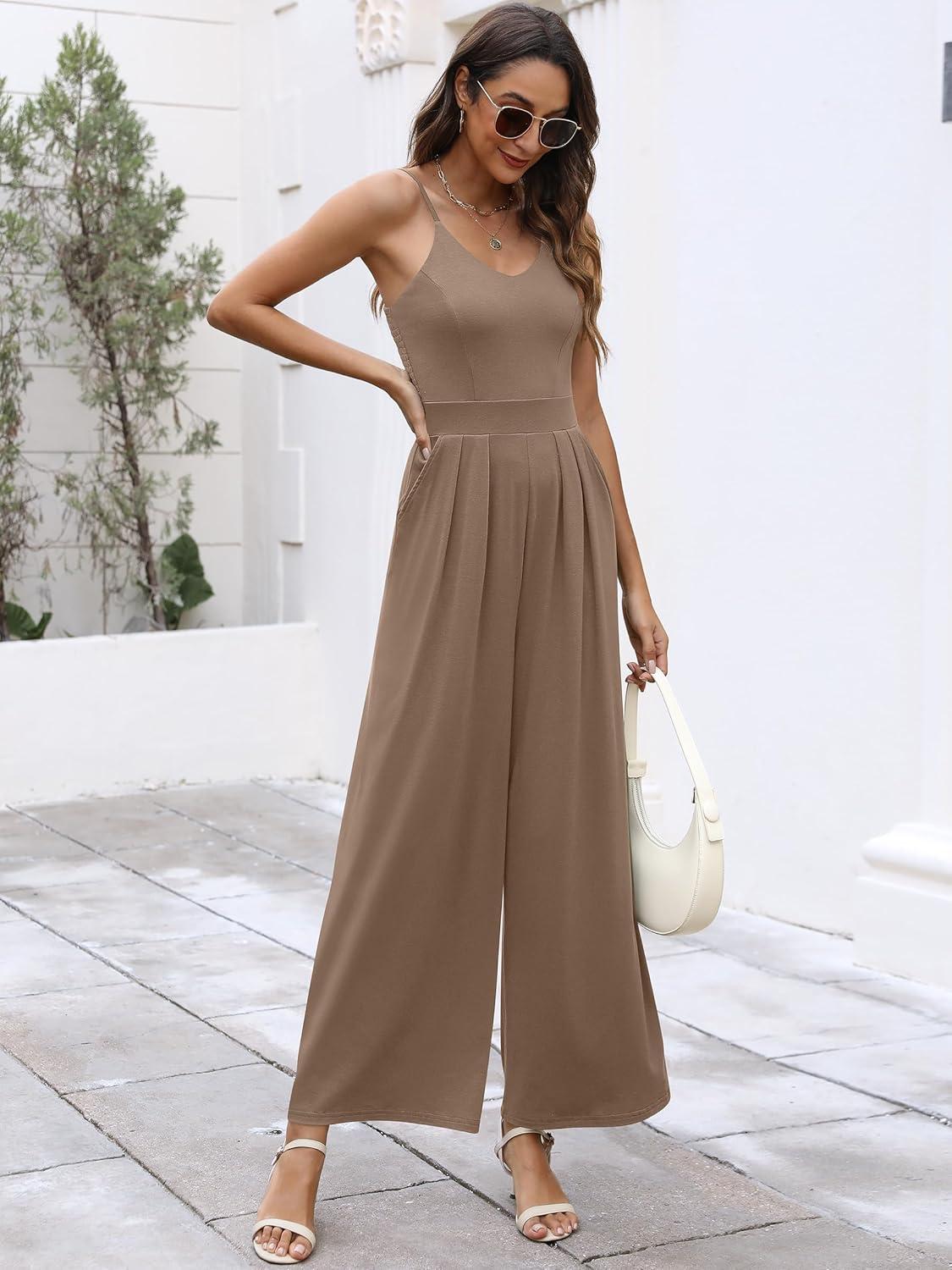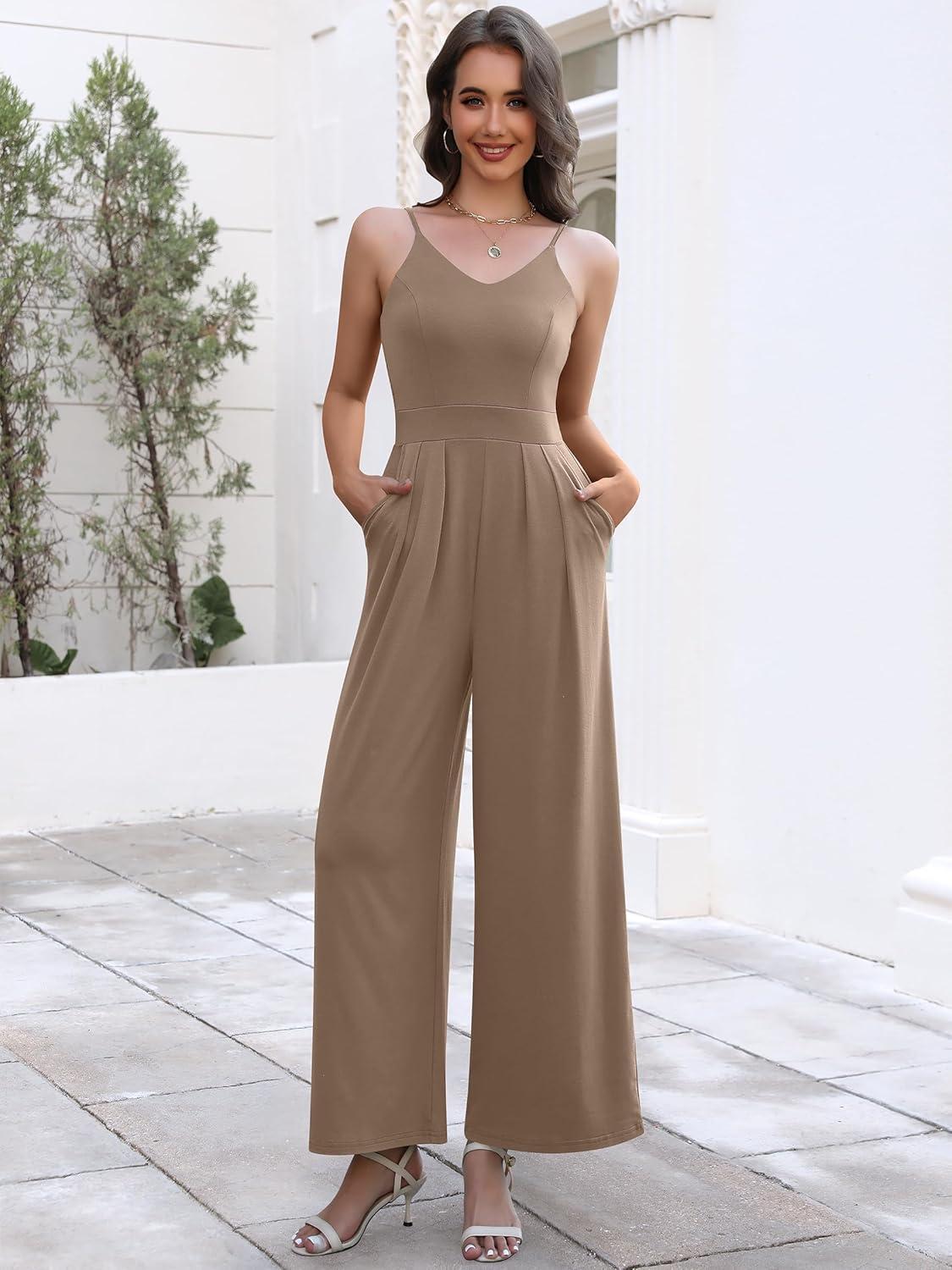 ANRABESS Women V Neck Spaghetti Strap Wide Leg Dressy Jumpsuits 2025 Summer Casual One Piece Jumper Romper Outfits & Pockets(Coffee)