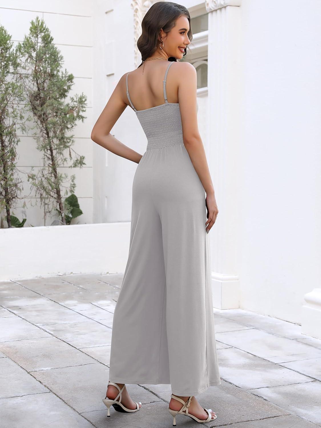 ANRABESS Women V Neck Spaghetti Strap Wide Leg Dressy Jumpsuits 2025 Summer Casual One Piece Jumper Romper Outfits & Pockets(Light Grey)
