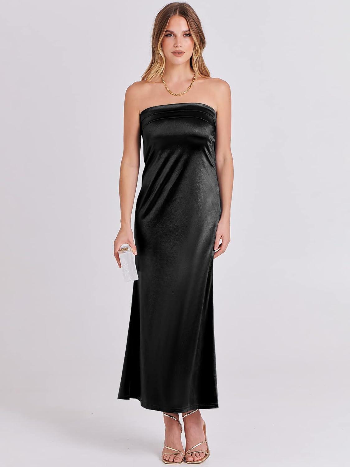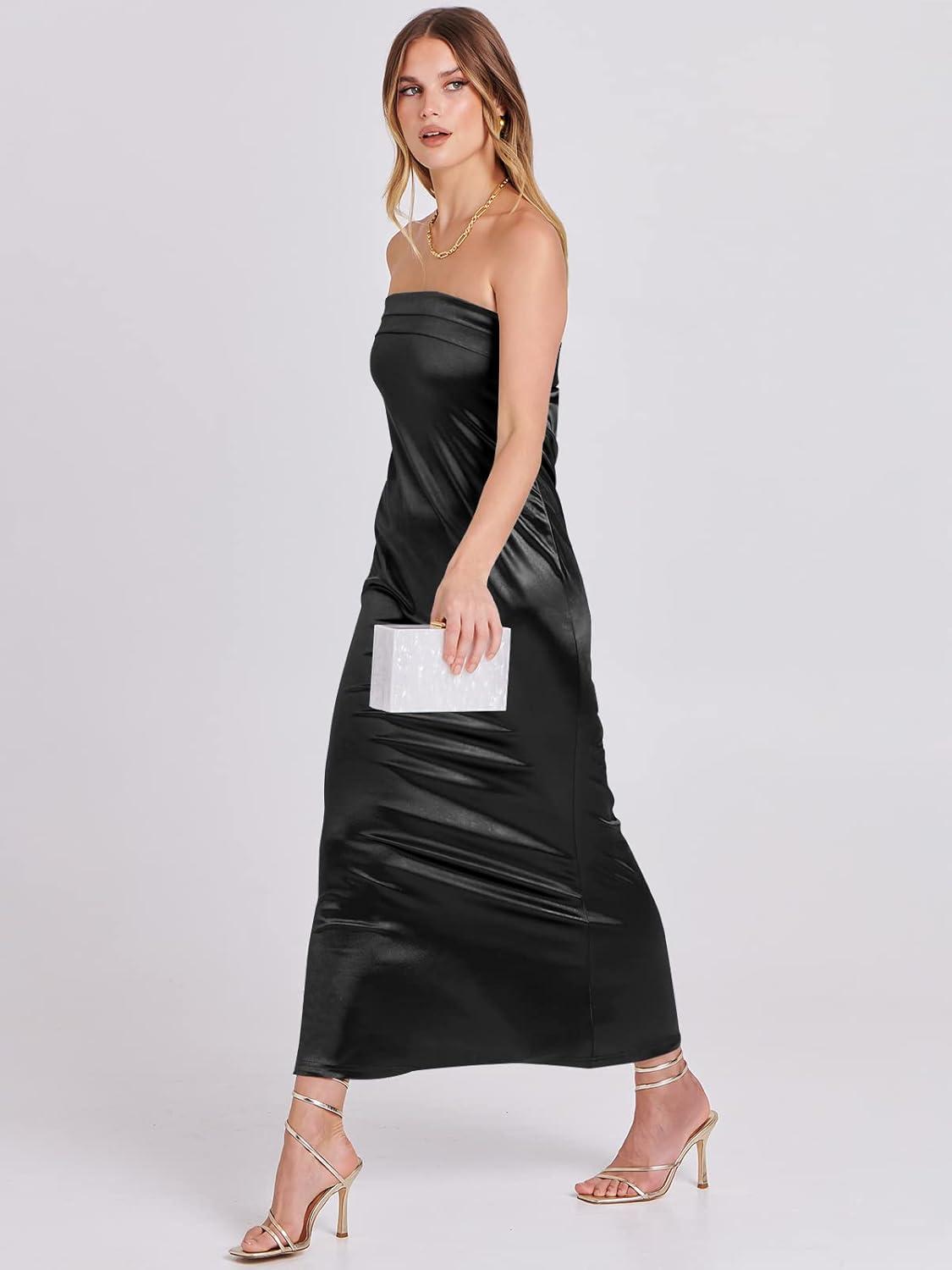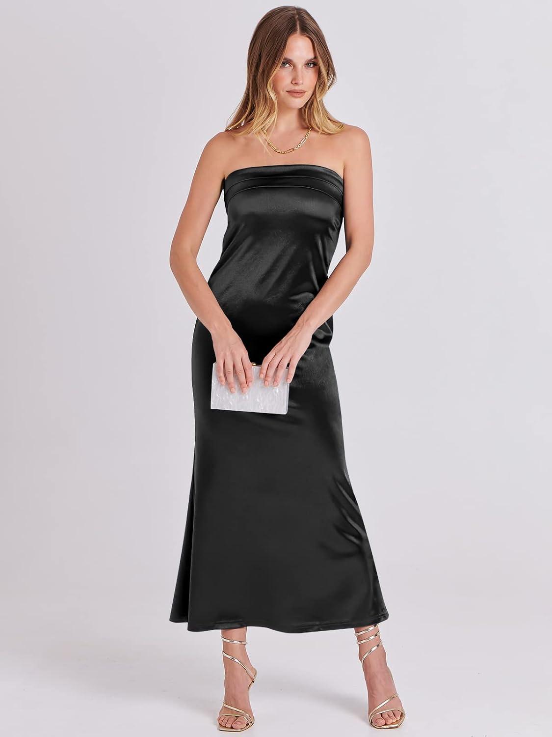 ANRABESS Women Wedding Guest Maxi Dress Strapless Satin Tube Bodycon Backless Cocktail Formal Dresses 2025 Fall(Black)