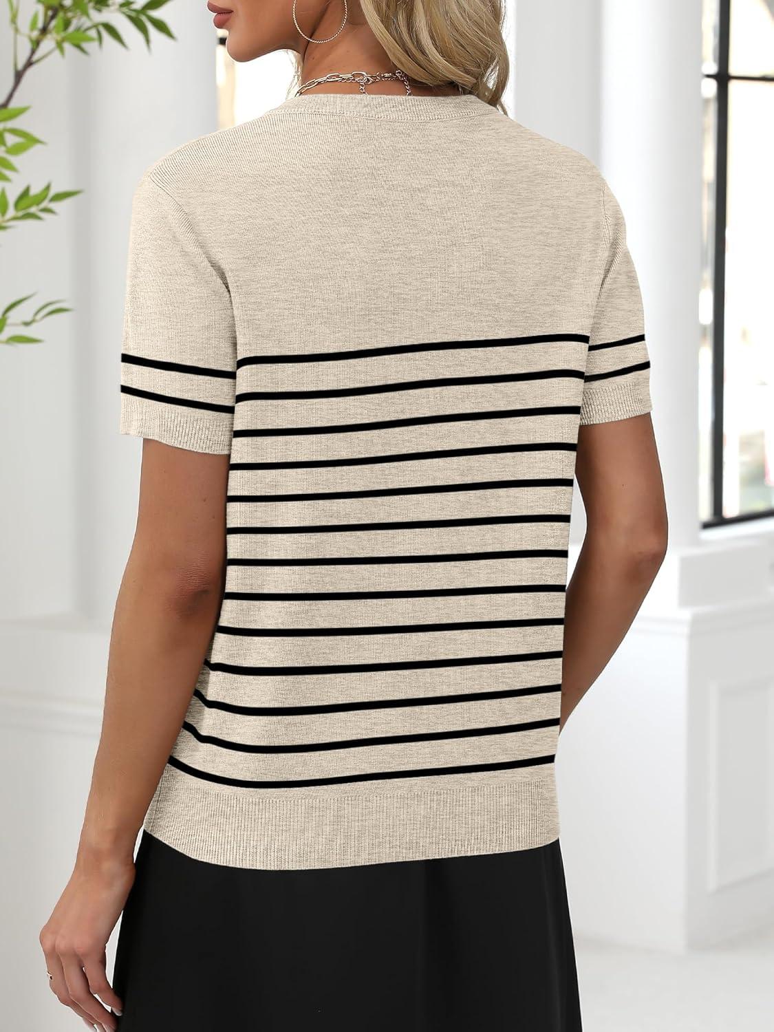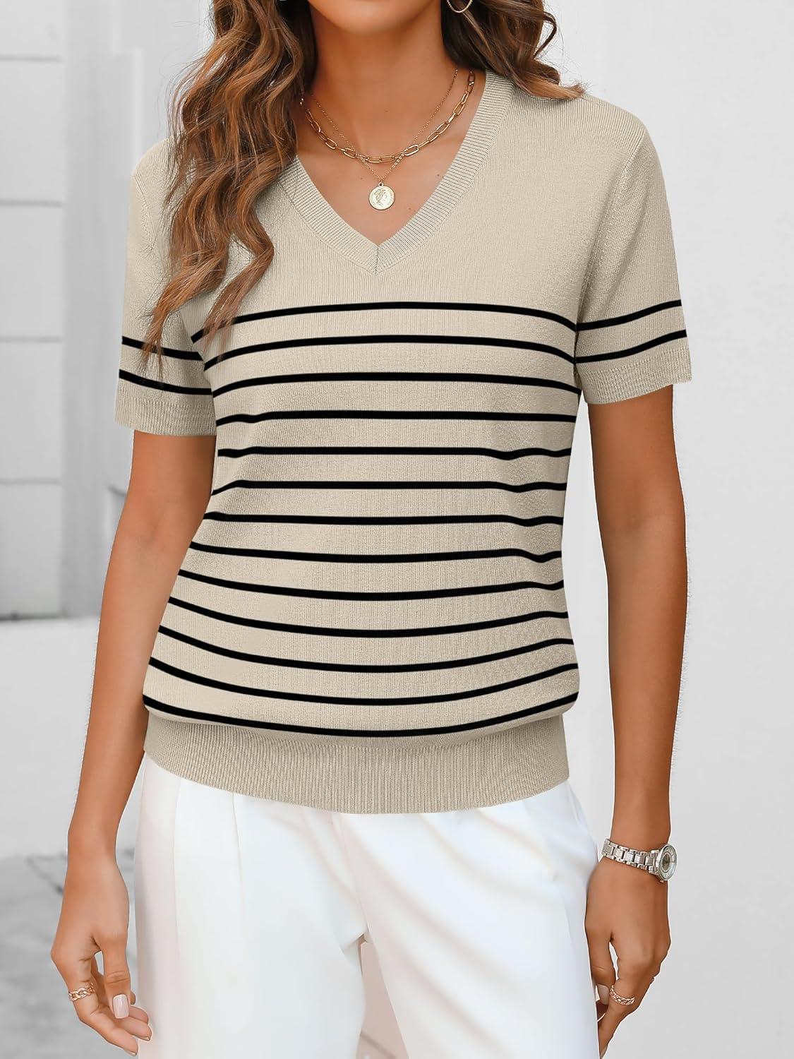 ANRABESS Women Wool Blend Sweater Summer 2025 Short Sleeve V Neck Pullover Top Business Casual Outfit Beach Vacation Clothes(Beige Black Stripe)