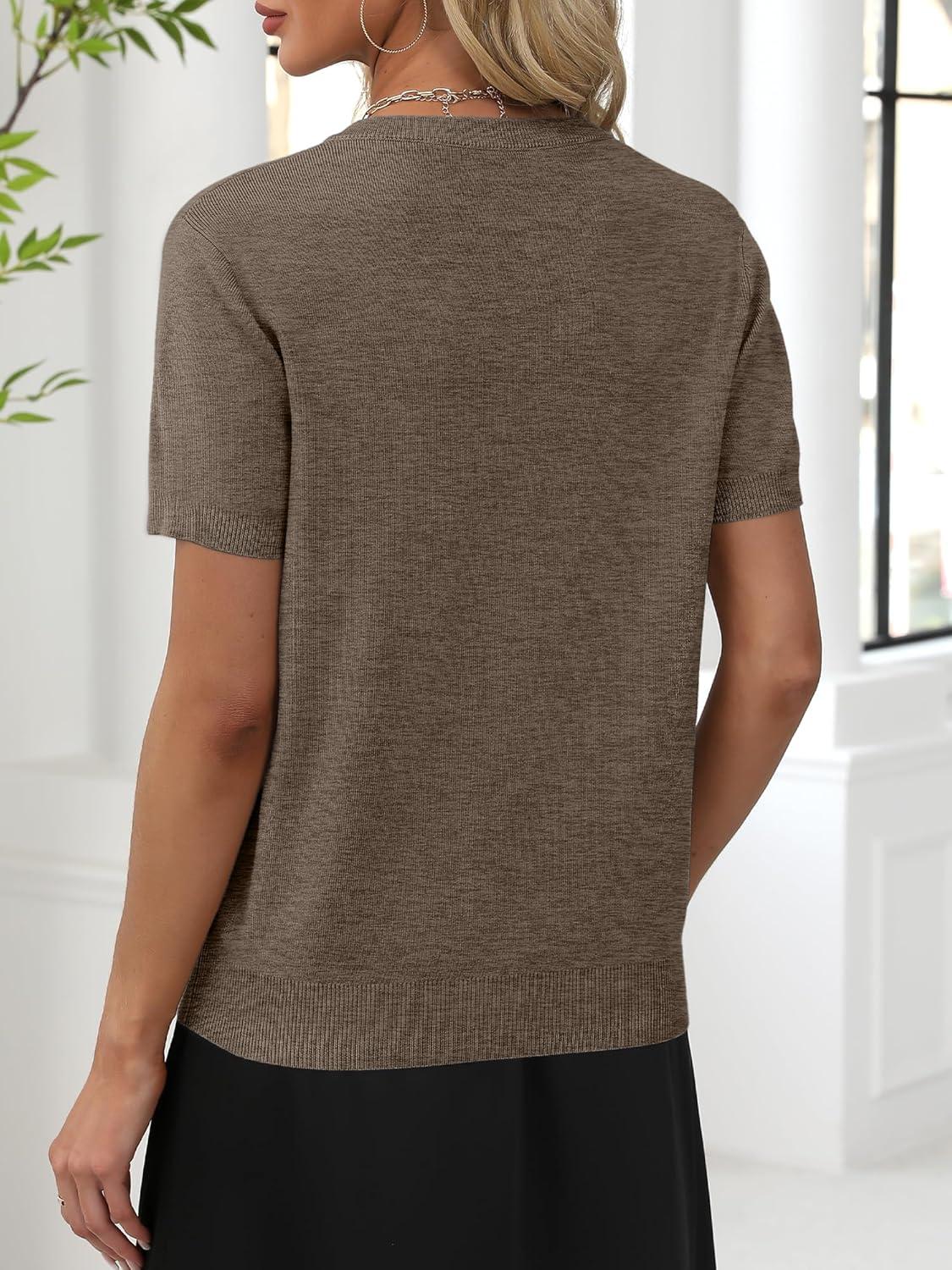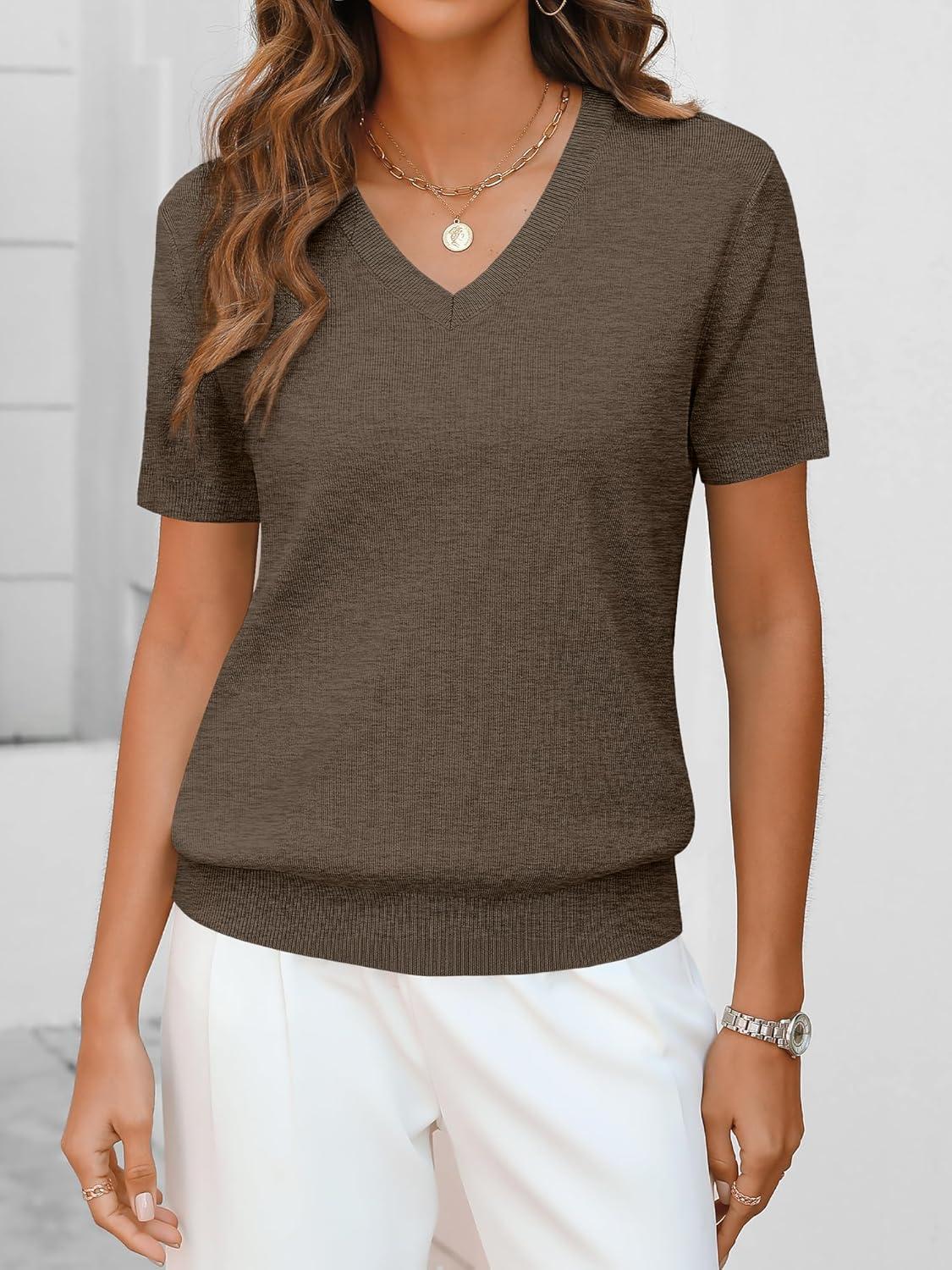 ANRABESS Women Wool Blend Sweater Summer 2025 Short Sleeve V Neck Pullover Top Business Casual Outfit Beach Vacation Clothes(Brown)