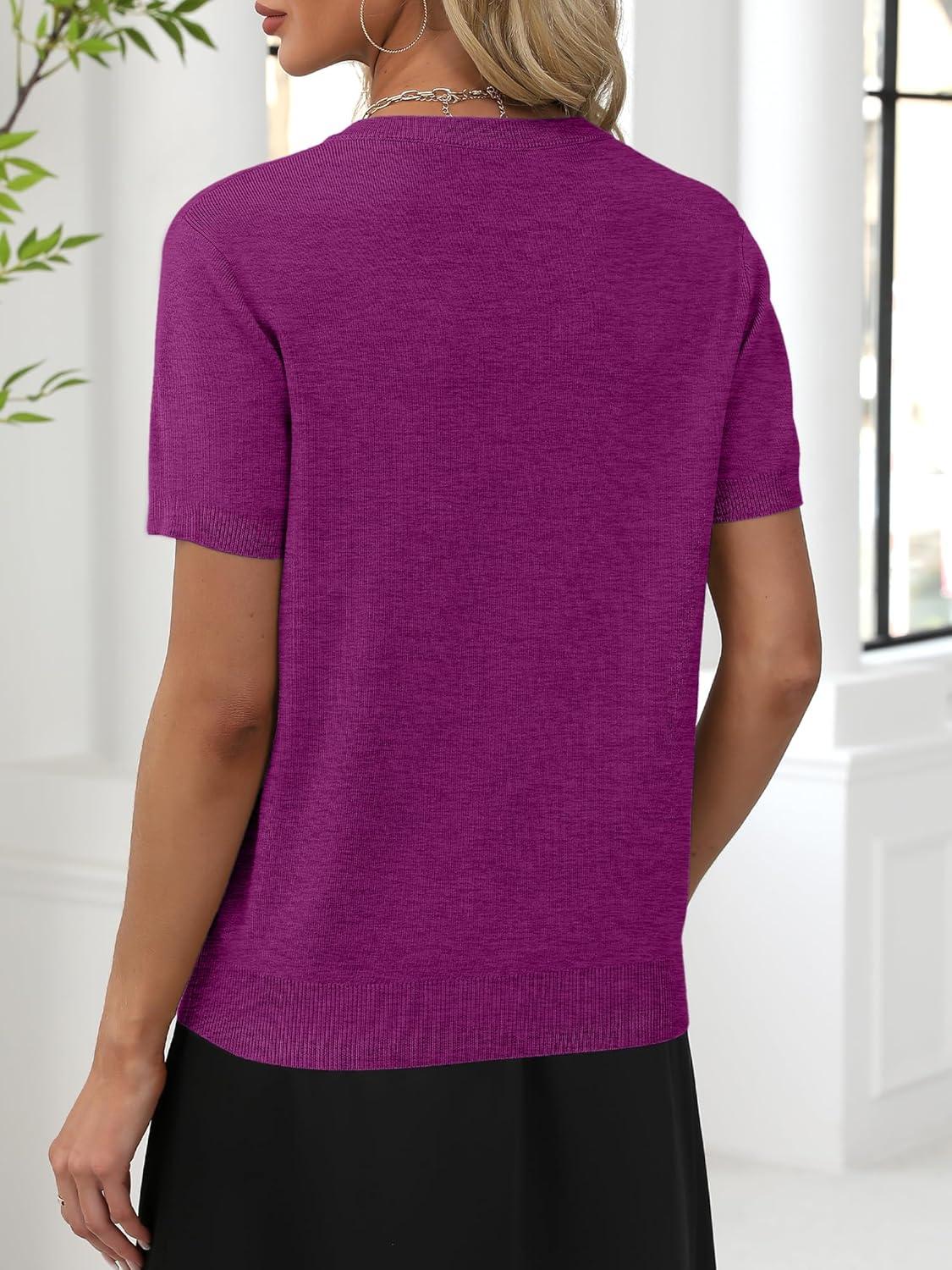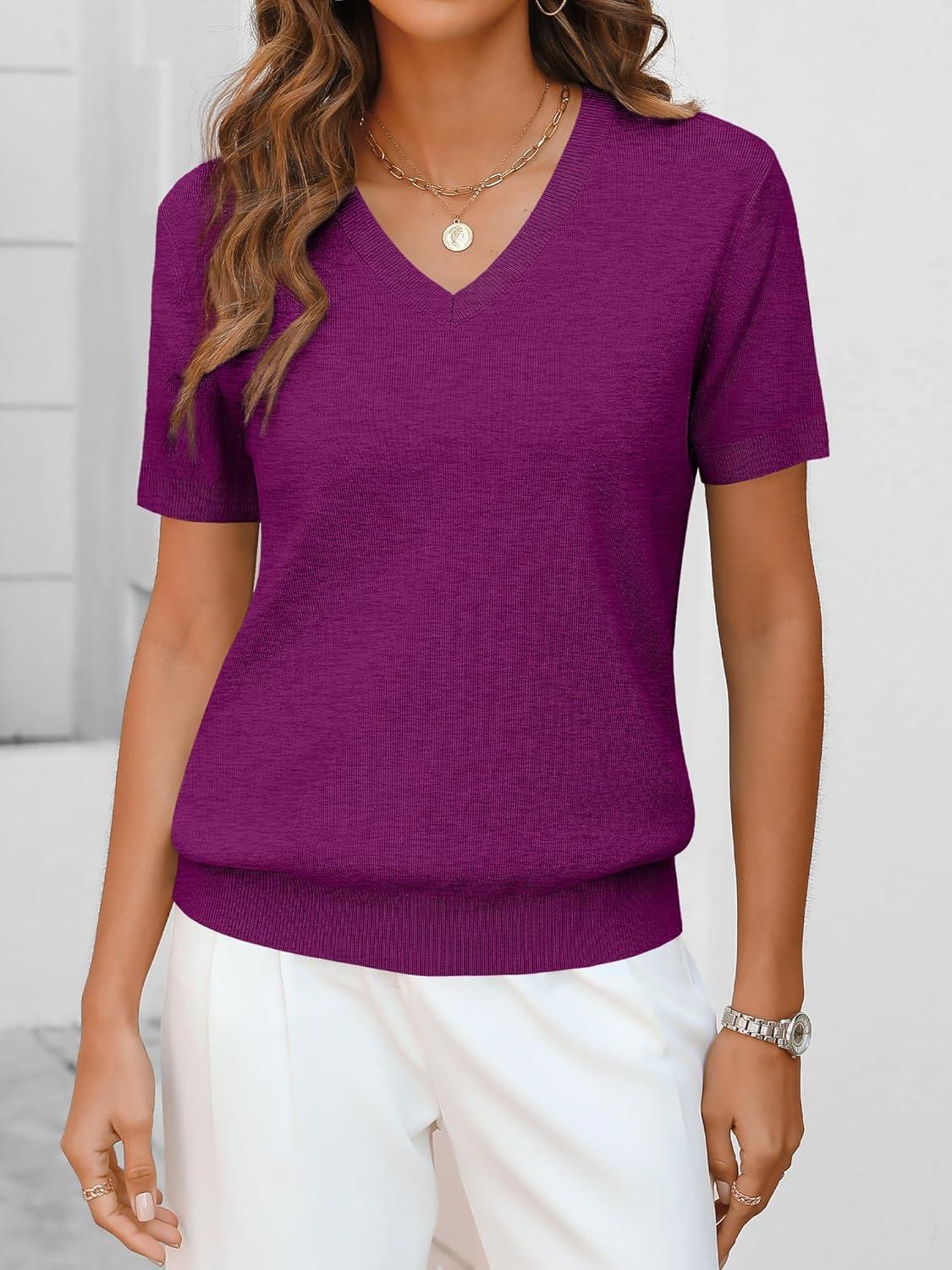 ANRABESS Women Wool Blend Sweater Summer 2025 Short Sleeve V Neck Pullover Top Business Casual Outfit Beach Vacation Clothes(Deep Hot Pink)