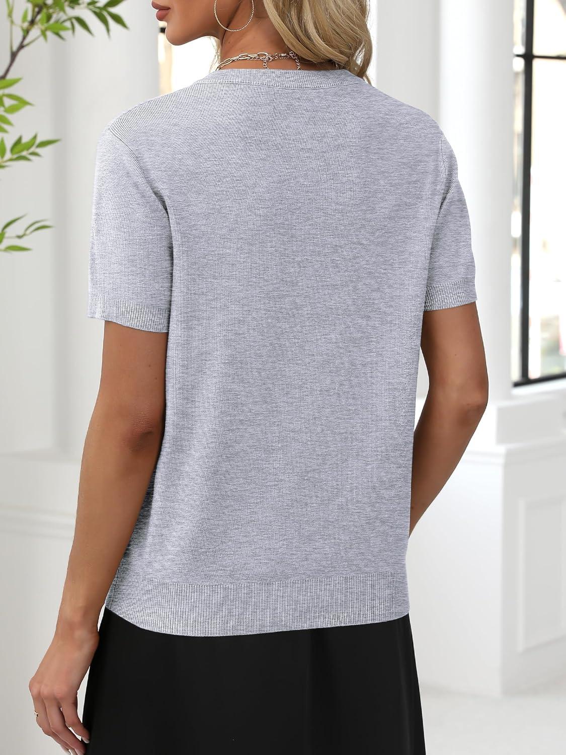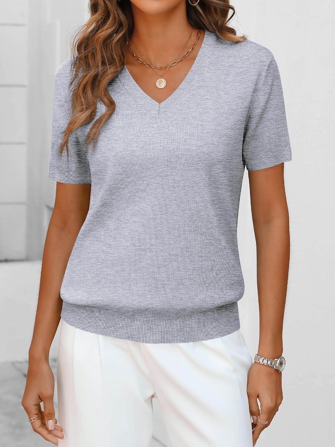 ANRABESS Women Wool Blend Sweater Summer 2025 Short Sleeve V Neck Pullover Top Business Casual Outfit Beach Vacation Clothes(Gray)